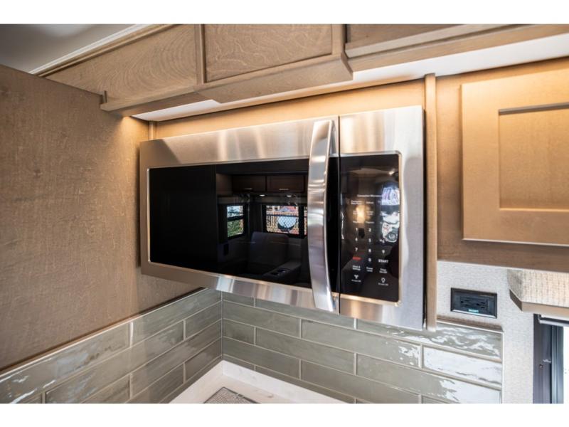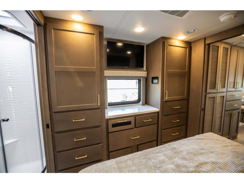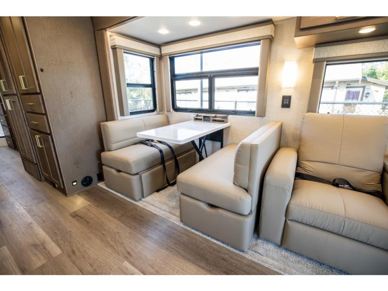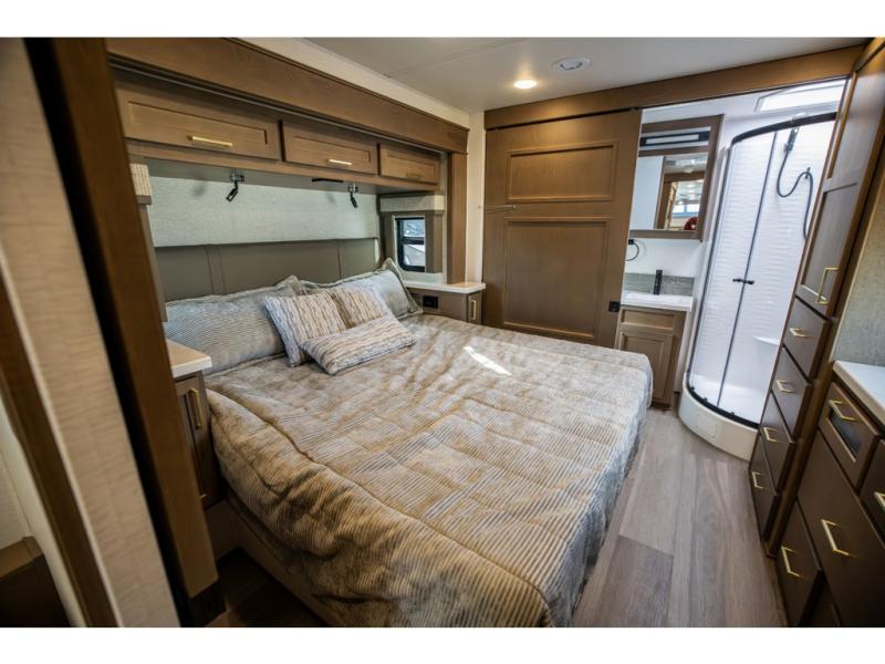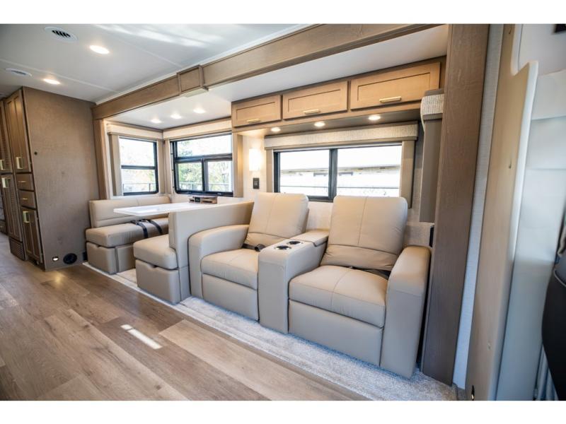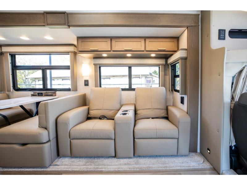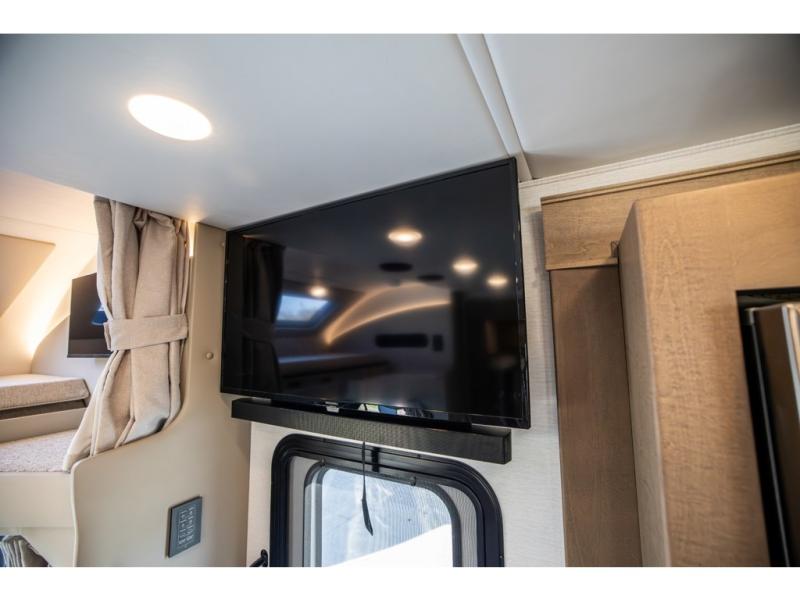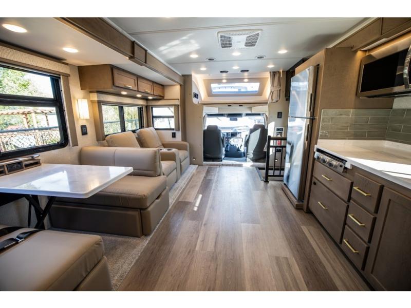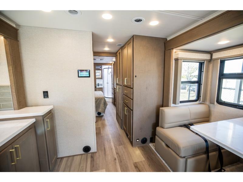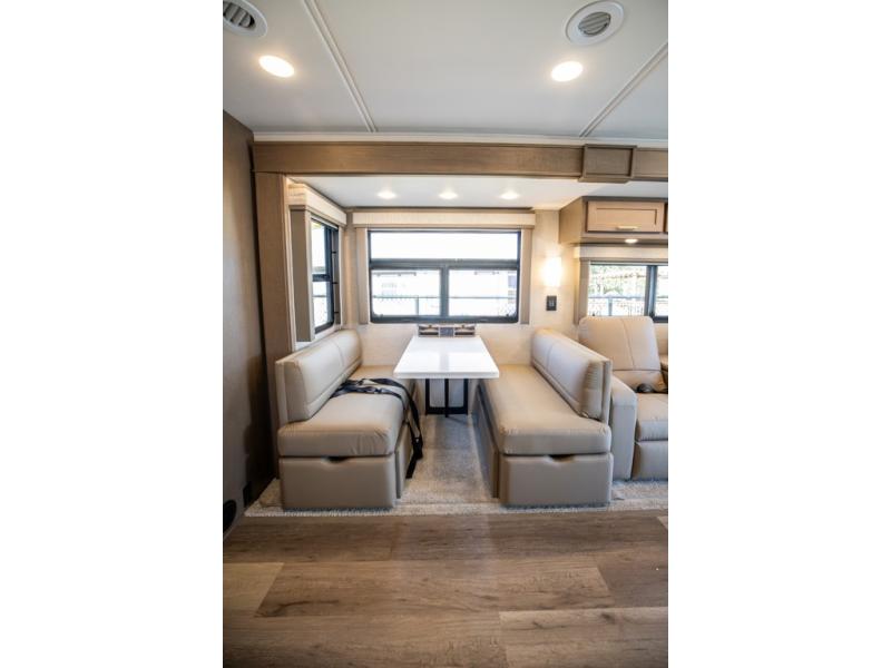 Start traveling the right way with this motorhome! There is plenty of entertainment throughout the inside and outside between the exterior entertainment center with a 32" Smart LED TV, a 42" Smart LED TV in the living area, and a 32" Smart LED TV in the private bedroom. Across from the half bathroom is an area pre-wired and plumbed for an optional washer and dryer so you can have clean clothes for your entire trip if you choose. The master suite has a 66" x 74" mini-king bed to lay your head on at night and access to the full rear bathroom which has a radius shower with a skylight above for natural lighting and overhead cabinets to store your toiletries. The sofa sleeper and booth dinette offer comfortable places to enjoy meals, socialize, and even transform into sleeping spaces!