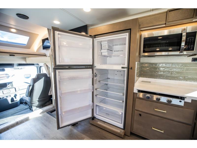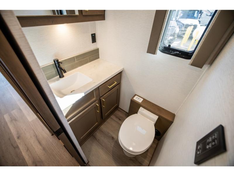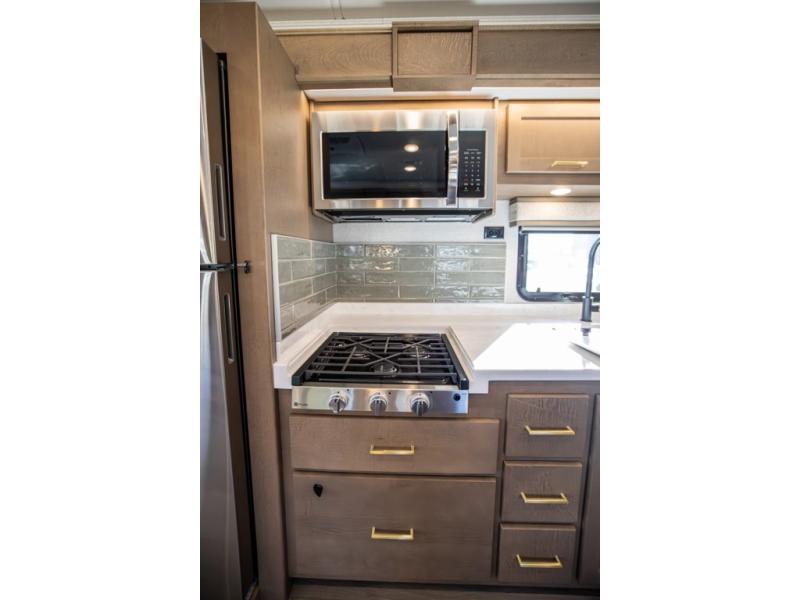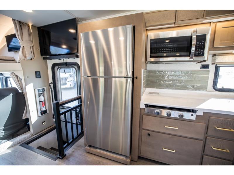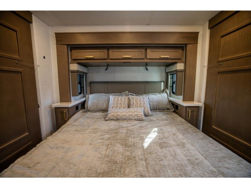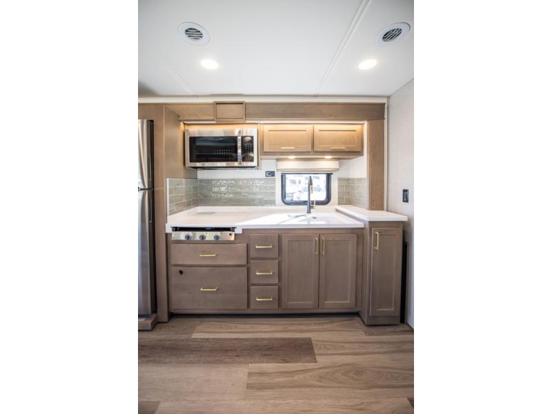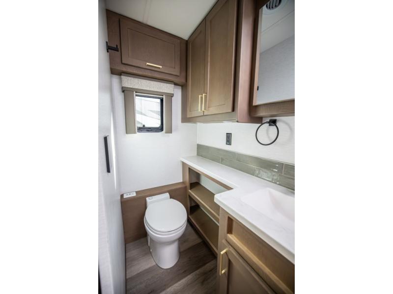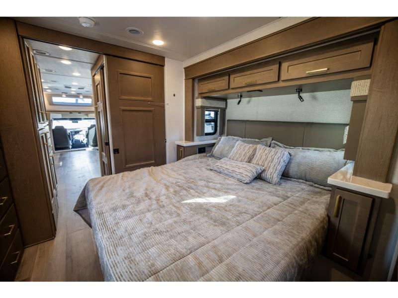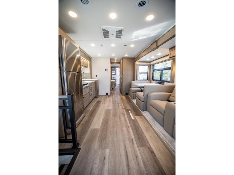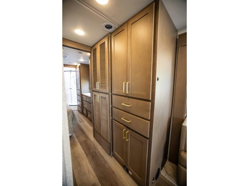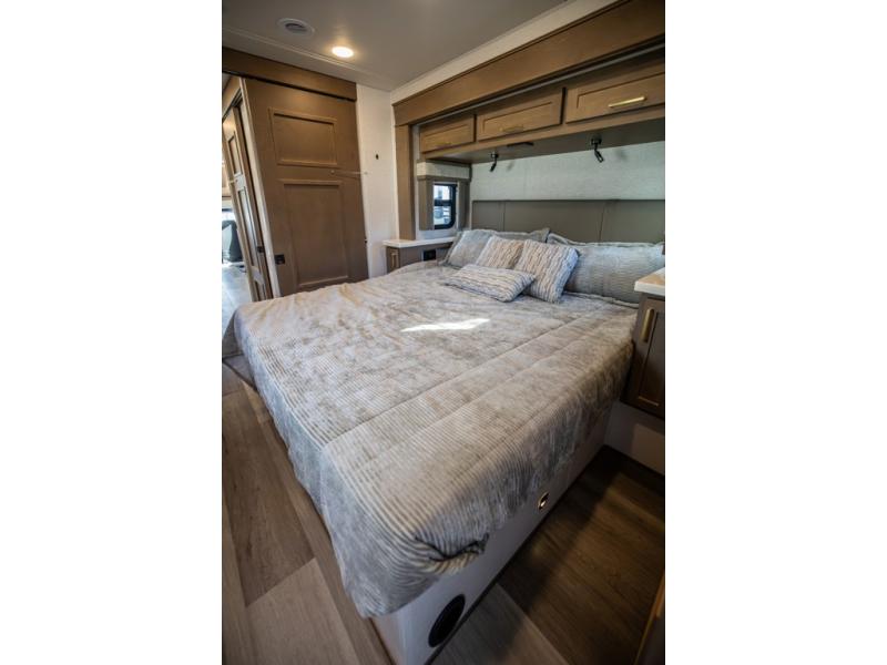Start traveling the right way with this motorhome! There is plenty of entertainment throughout the inside and outside between the exterior entertainment center with a 32" Smart LED TV, a 42" Smart LED TV in the living area, and a 32" Smart LED TV in the private bedroom. Across from the half bathroom is an area pre-wired and plumbed for an optional washer and dryer so you can have clean clothes for your entire trip if you choose. The master suite has a 66" x 74" mini-king bed to lay your head on at night and access to the full rear bathroom which has a radius shower with a skylight above for natural lighting and overhead cabinets to store your toiletries. The sofa sleeper and booth dinette offer comfortable places to enjoy meals, socialize, and even transform into sleeping spaces!