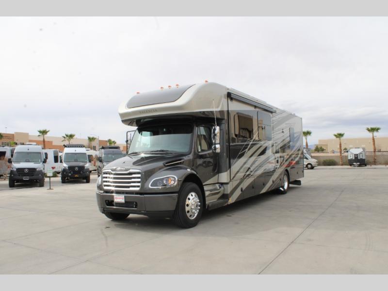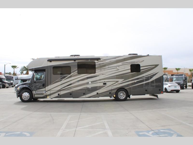 Each one of these Renegade Valencia Super C diesel motorhomes offer ultimate comfort and durable construction! They have a Freightliner S2RV chassis for a refined ride with responsive handling, as well as a powerful Cummins ISB 360 HP engine with a 3,000MH Alison transmission and a single 100 gallon fuel tank to get you farther. A few of the beautifully designed interior features are the solid hardwood cabinets, the polished solid surface countertops, and the stainless steel appliances. Travel in comfort and style with the modern furniture and abundant storage areas like the exterior steel storage compartments with carpeted lining. You will also appreciate the four point automatic hydraulic leveling system and the multiplex system with Bluetooth app control. With eight colorway paint options and three interior décor options, you can be sure to find the right one for you!