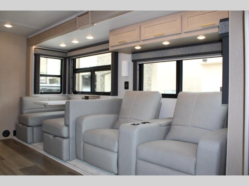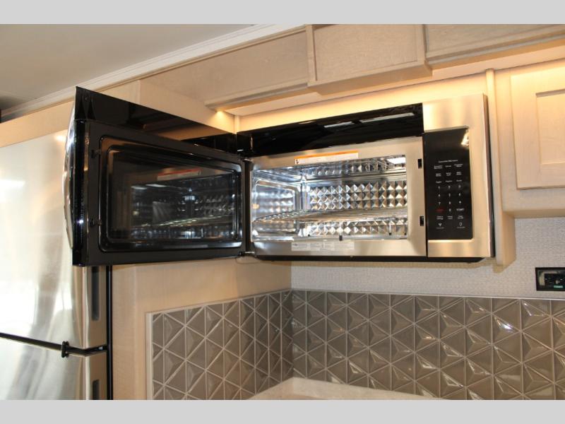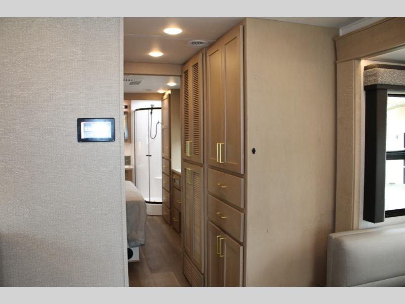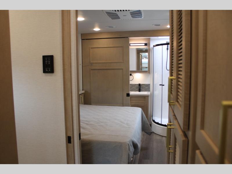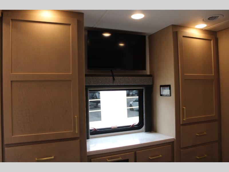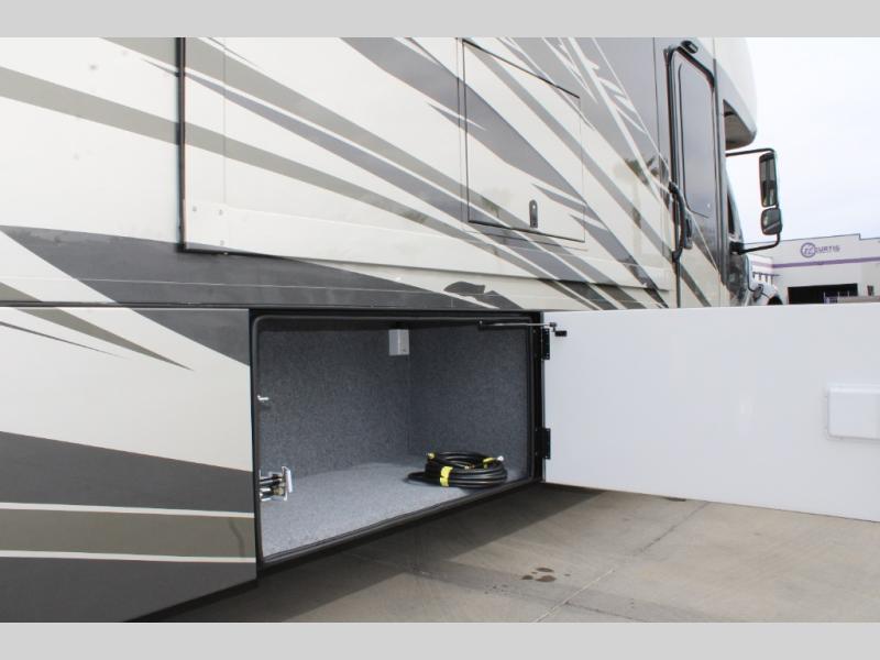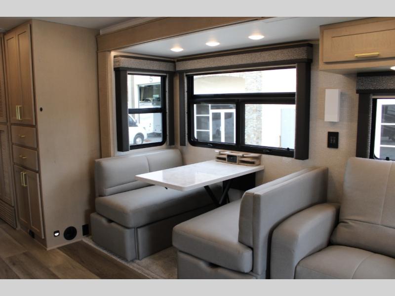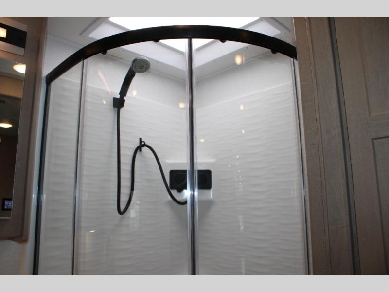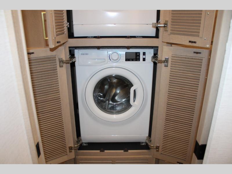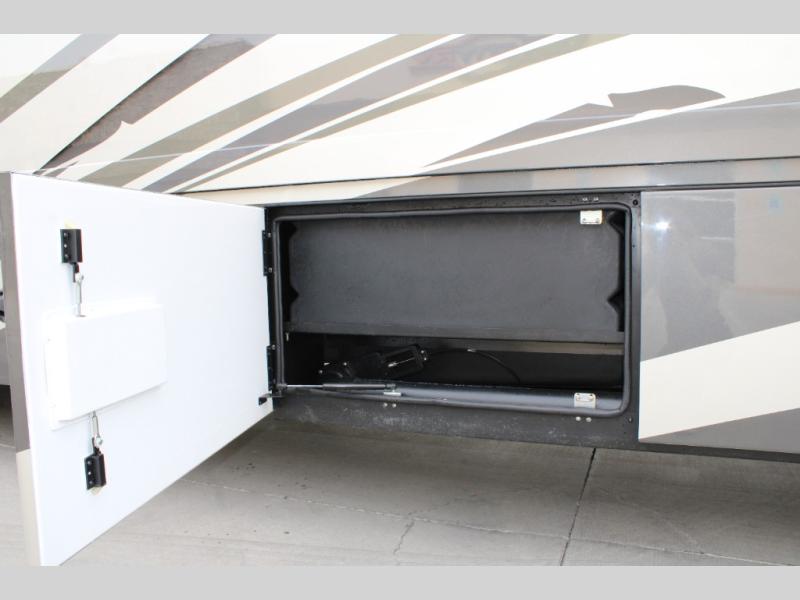 Start traveling the right way with this motorhome! There is plenty of entertainment throughout the inside and outside between the exterior entertainment center with a 32" Smart LED TV, a 42" Smart LED TV in the living area, and a 32" Smart LED TV in the private bedroom. Across from the half bathroom is an area pre-wired and plumbed for an optional washer and dryer so you can have clean clothes for your entire trip if you choose. The master suite has a 66" x 74" mini-king bed to lay your head on at night and access to the full rear bathroom which has a radius shower with a skylight above for natural lighting and overhead cabinets to store your toiletries. The sofa sleeper and booth dinette offer comfortable places to enjoy meals, socialize, and even transform into sleeping spaces!