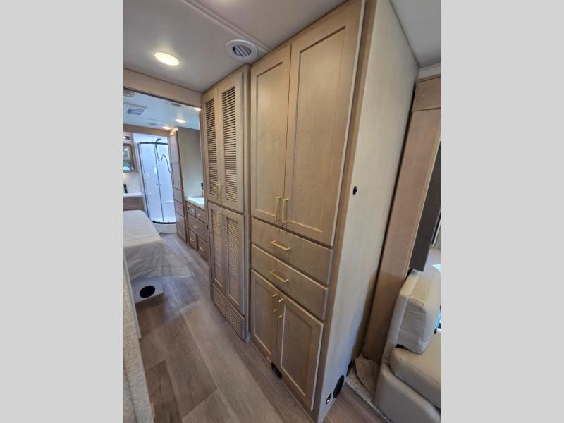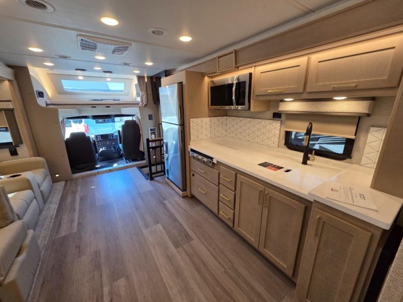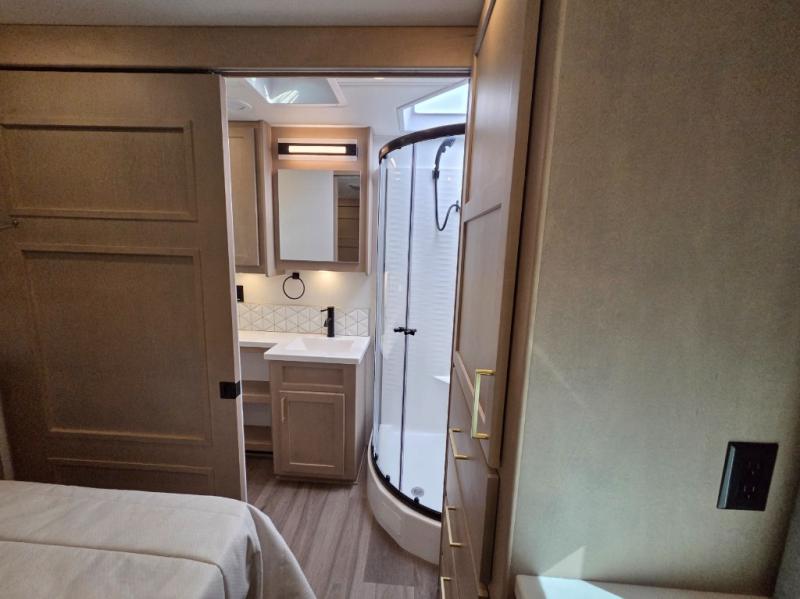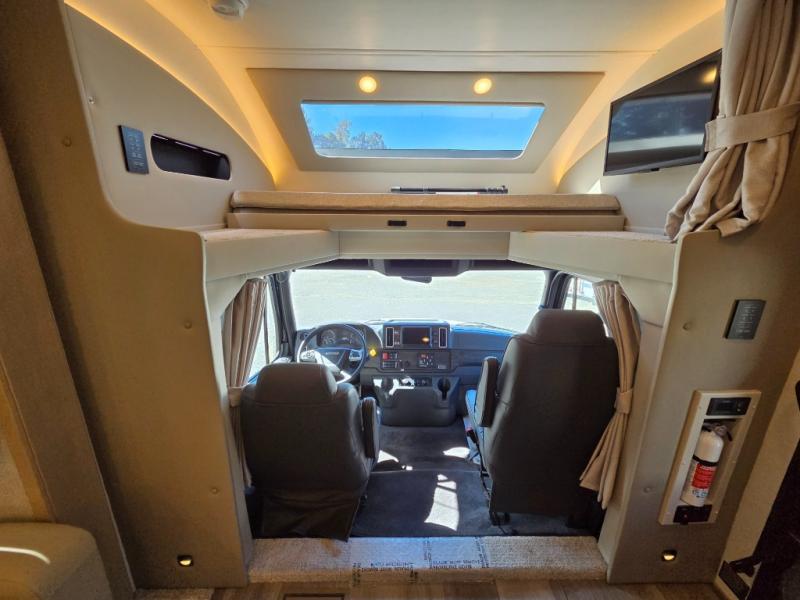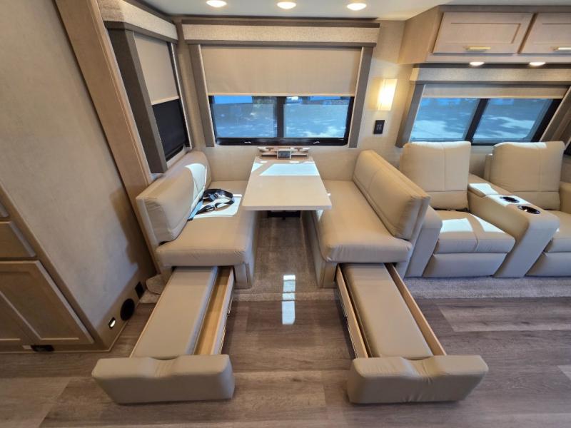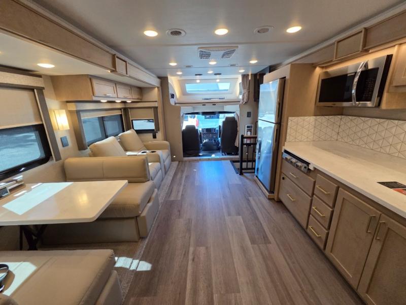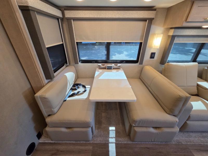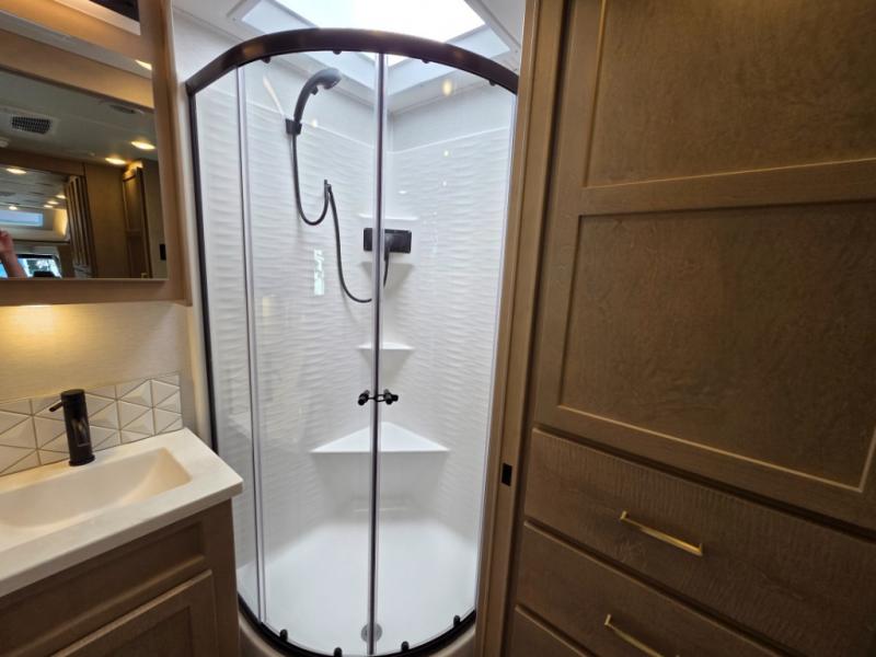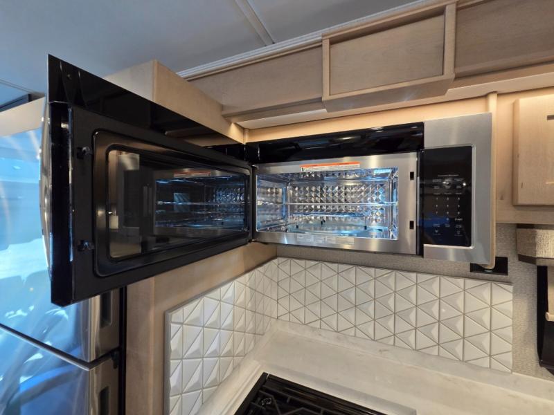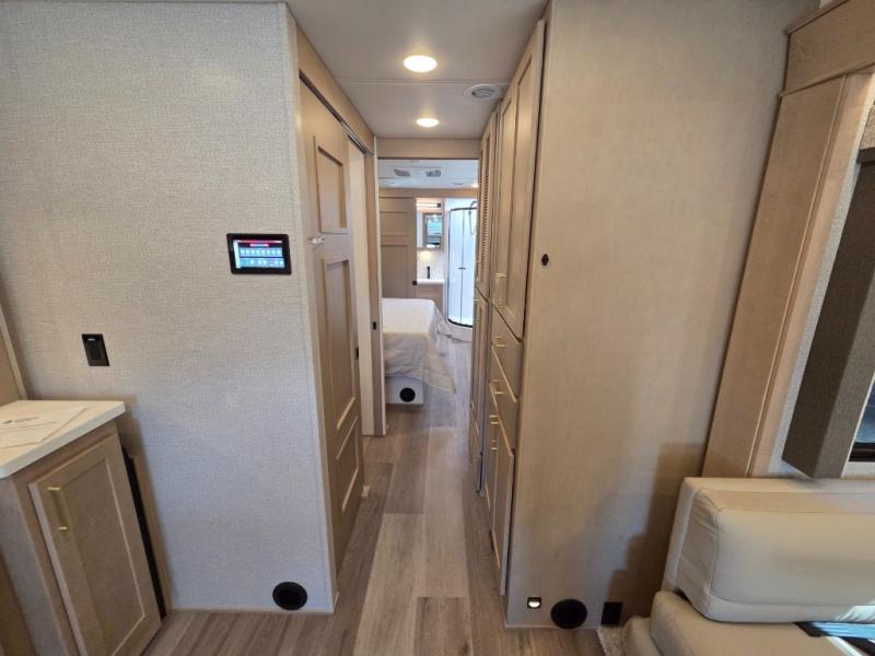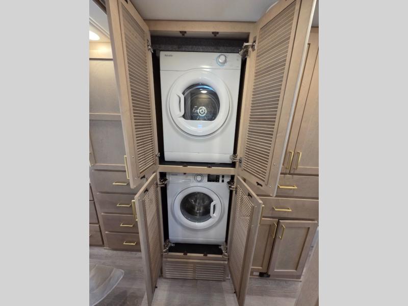 Start traveling the right way with this motorhome! There is plenty of entertainment throughout the inside and outside between the exterior entertainment center with a 32" Smart LED TV, a 42" Smart LED TV in the living area, and a 32" Smart LED TV in the private bedroom. Across from the half bathroom is an area pre-wired and plumbed for an optional washer and dryer so you can have clean clothes for your entire trip if you choose. The master suite has a 66" x 74" mini-king bed to lay your head on at night and access to the full rear bathroom which has a radius shower with a skylight above for natural lighting and overhead cabinets to store your toiletries. The sofa sleeper and booth dinette offer comfortable places to enjoy meals, socialize, and even transform into sleeping spaces!