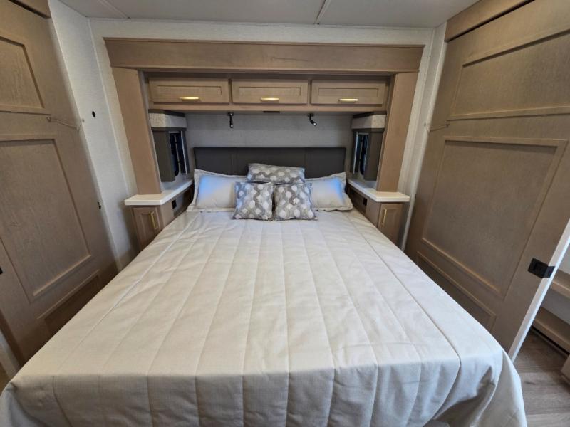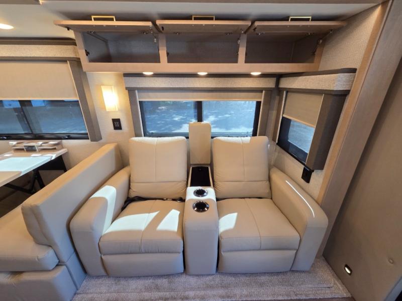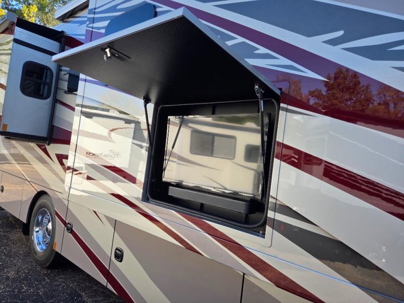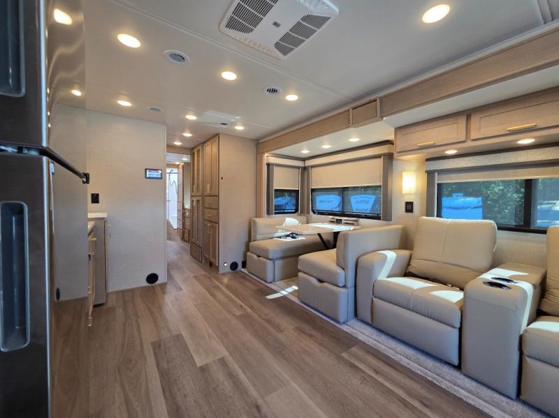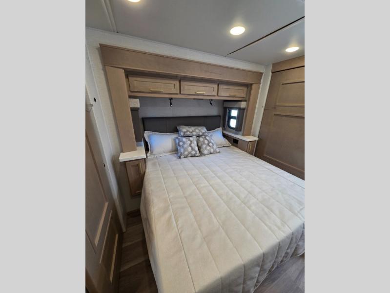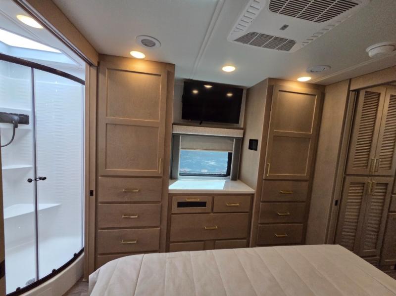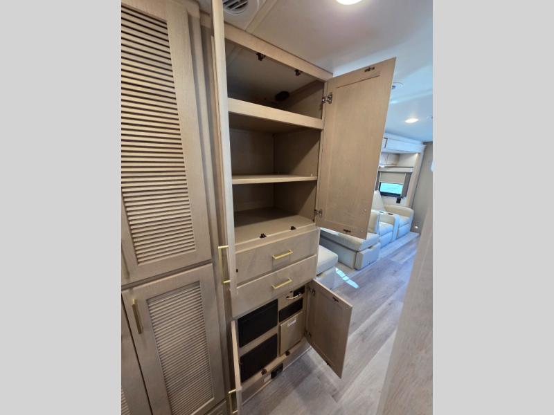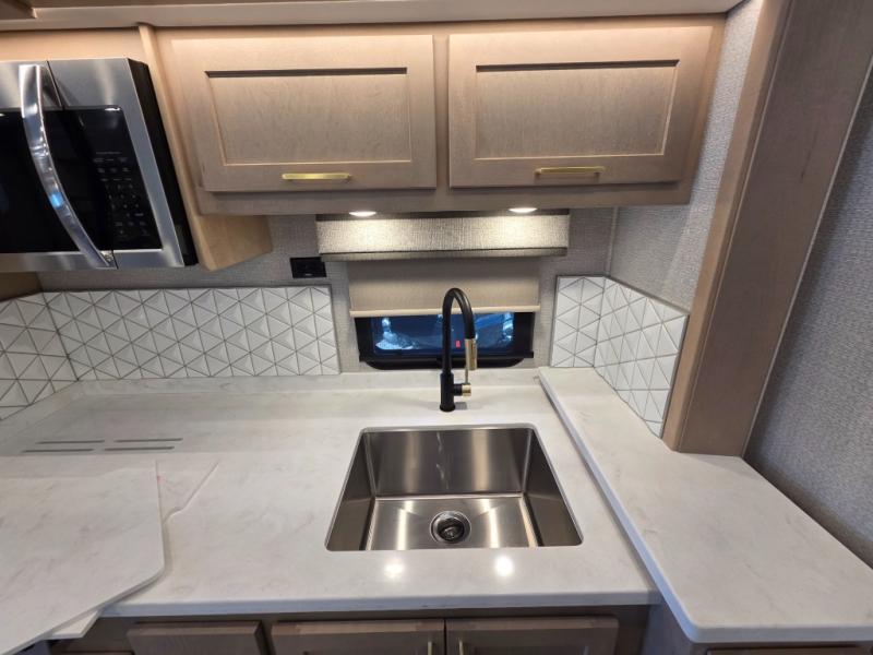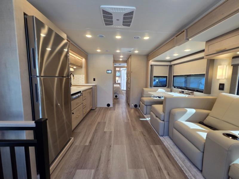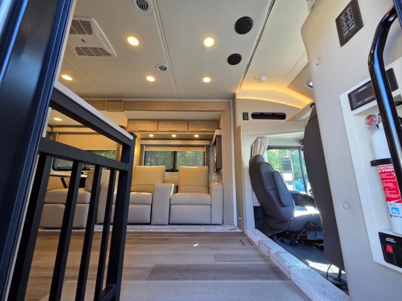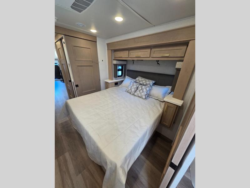 Start traveling the right way with this motorhome! There is plenty of entertainment throughout the inside and outside between the exterior entertainment center with a 32" Smart LED TV, a 42" Smart LED TV in the living area, and a 32" Smart LED TV in the private bedroom. Across from the half bathroom is an area pre-wired and plumbed for an optional washer and dryer so you can have clean clothes for your entire trip if you choose. The master suite has a 66" x 74" mini-king bed to lay your head on at night and access to the full rear bathroom which has a radius shower with a skylight above for natural lighting and overhead cabinets to store your toiletries. The sofa sleeper and booth dinette offer comfortable places to enjoy meals, socialize, and even transform into sleeping spaces!