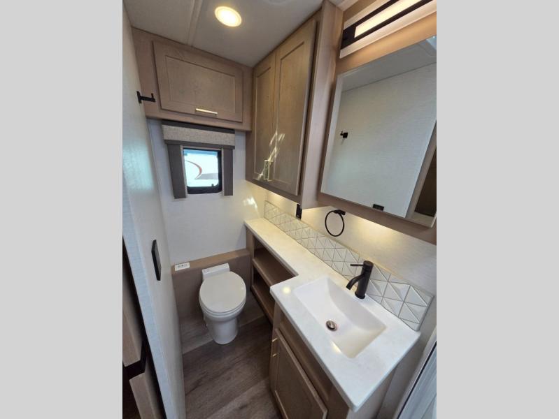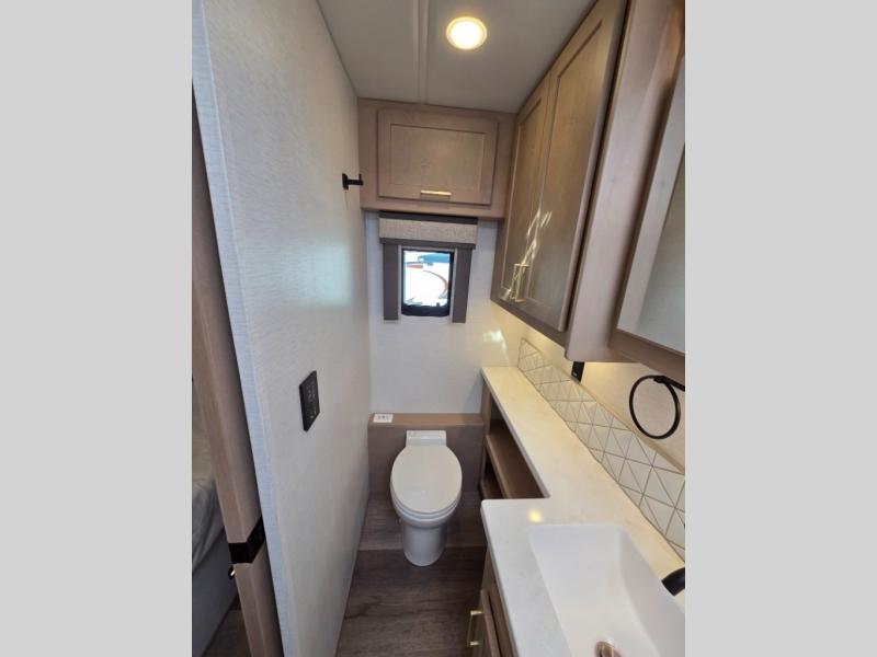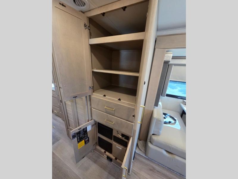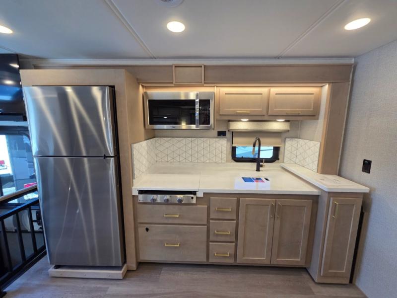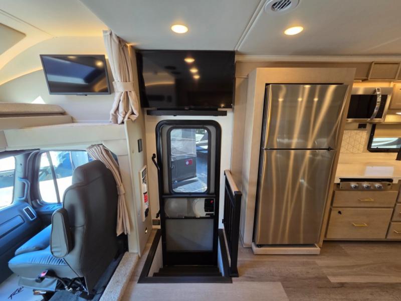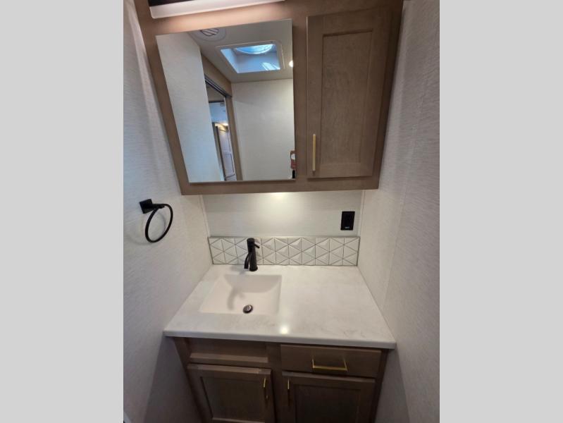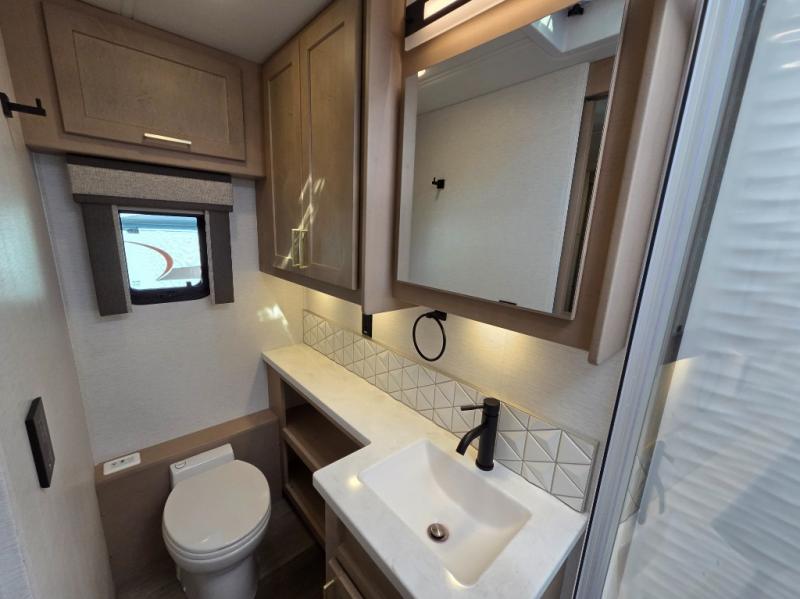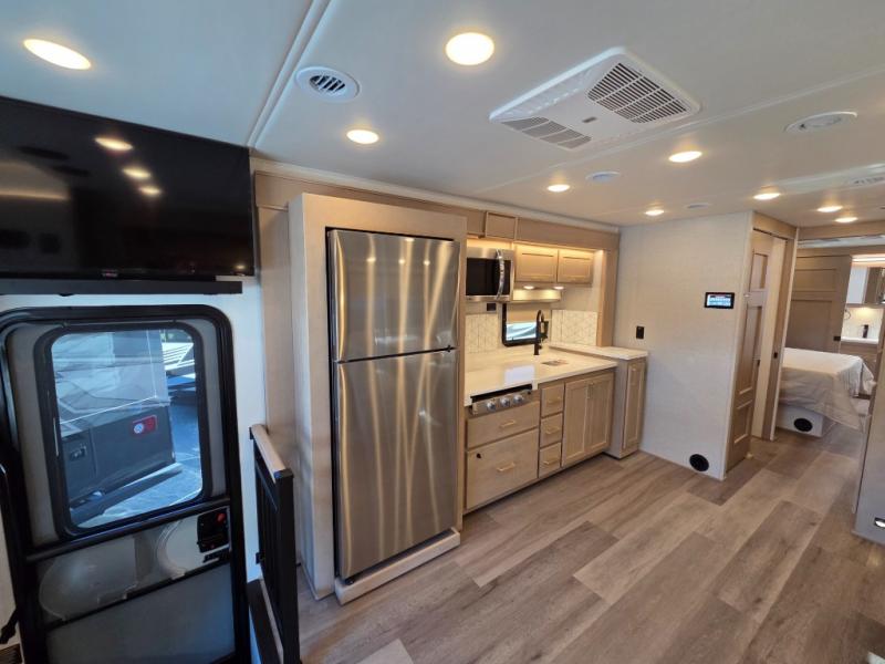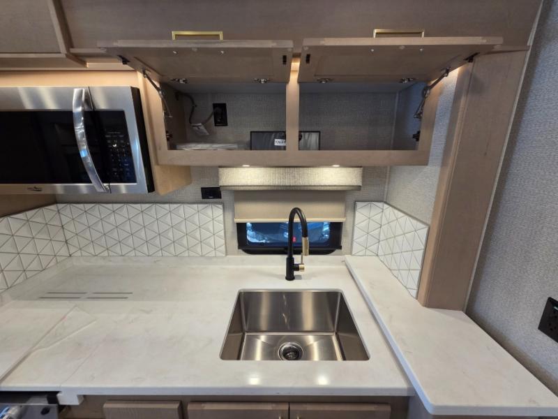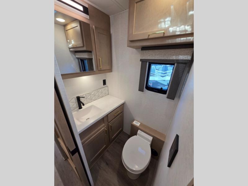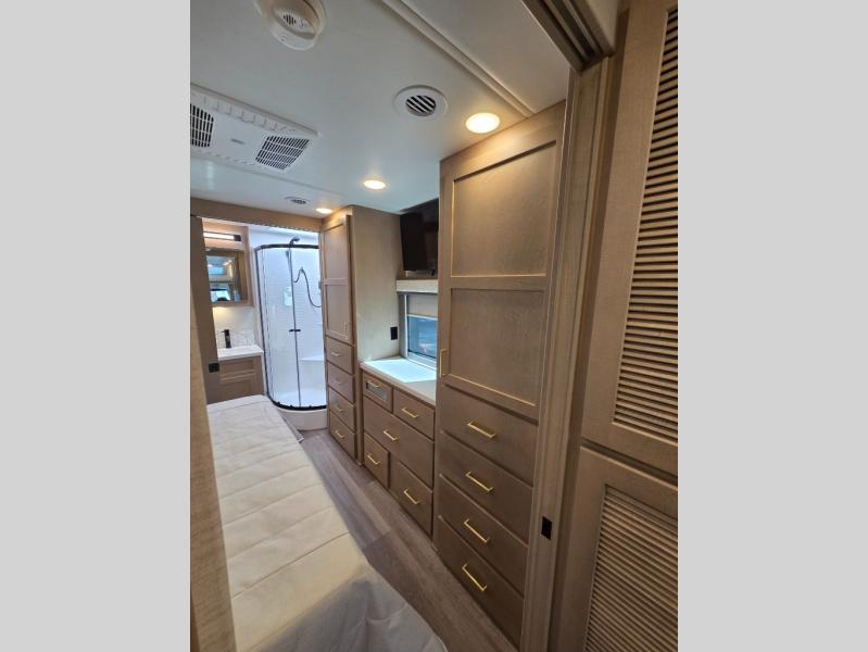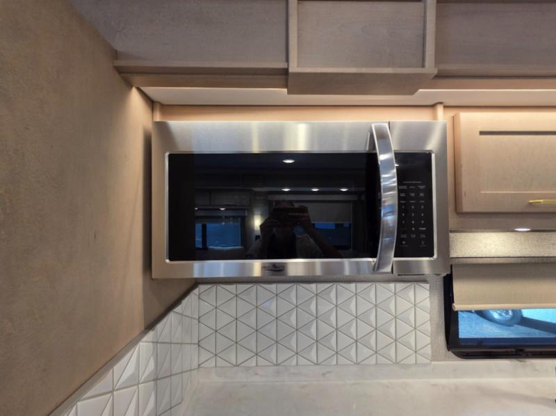 Start traveling the right way with this motorhome! There is plenty of entertainment throughout the inside and outside between the exterior entertainment center with a 32" Smart LED TV, a 42" Smart LED TV in the living area, and a 32" Smart LED TV in the private bedroom. Across from the half bathroom is an area pre-wired and plumbed for an optional washer and dryer so you can have clean clothes for your entire trip if you choose. The master suite has a 66" x 74" mini-king bed to lay your head on at night and access to the full rear bathroom which has a radius shower with a skylight above for natural lighting and overhead cabinets to store your toiletries. The sofa sleeper and booth dinette offer comfortable places to enjoy meals, socialize, and even transform into sleeping spaces!