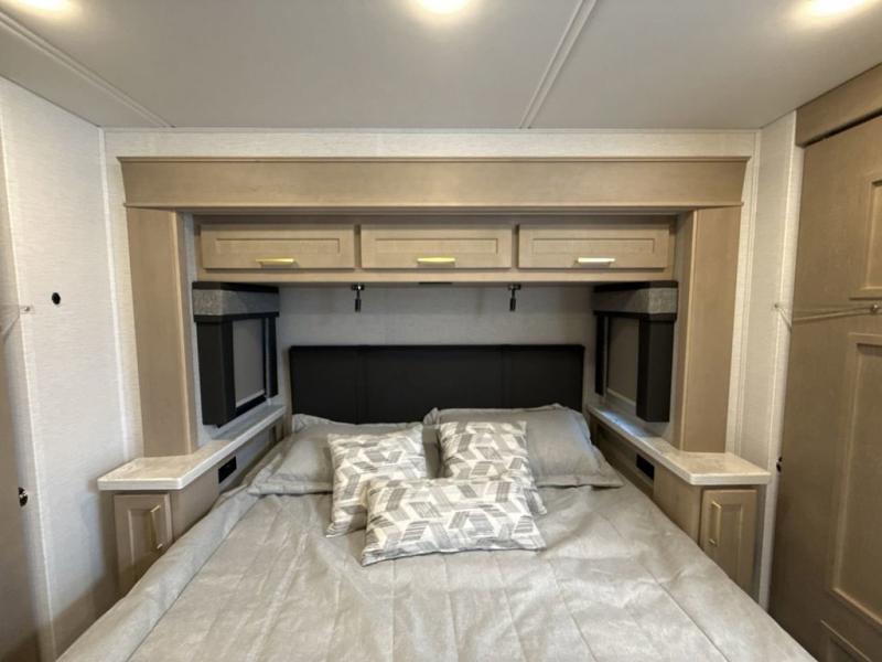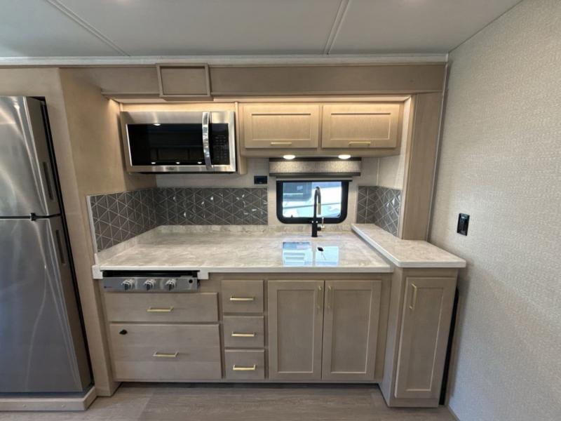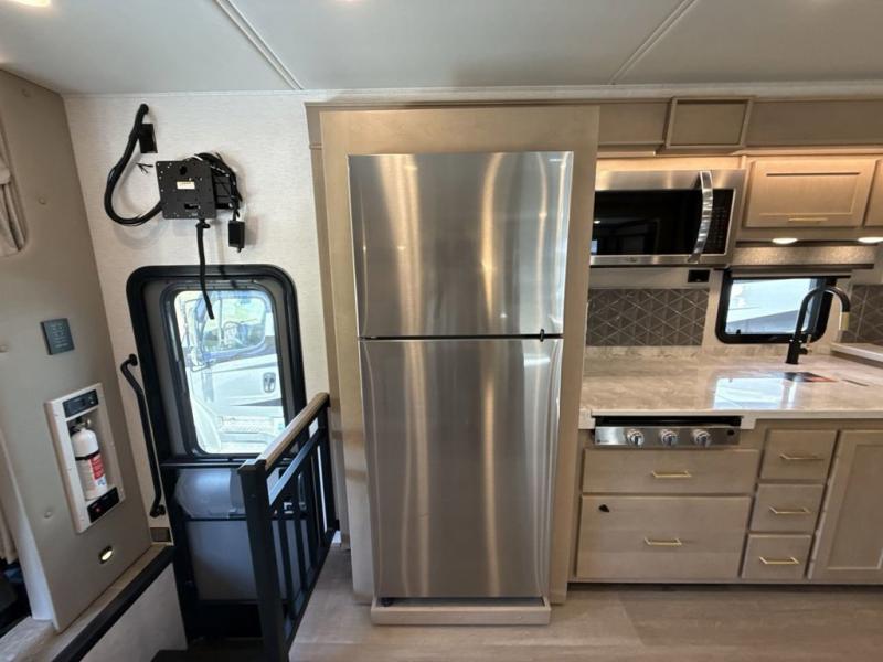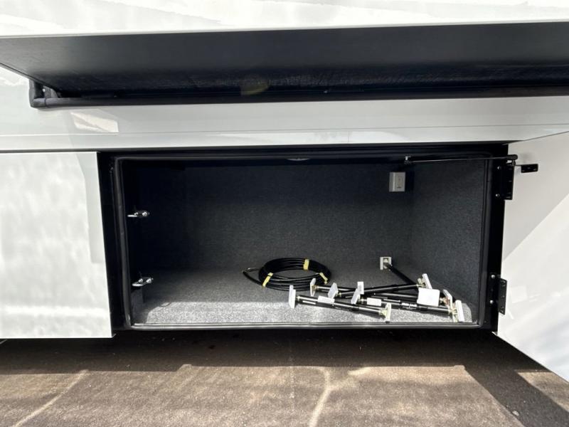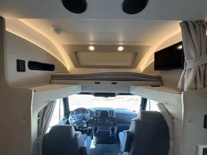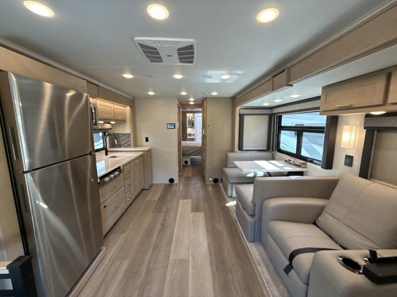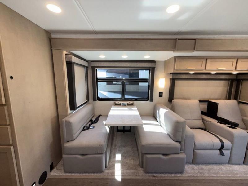Start traveling the right way with this motorhome! There is plenty of entertainment throughout the inside and outside between the exterior entertainment center with a 32" Smart LED TV, a 42" Smart LED TV in the living area, and a 32" Smart LED TV in the private bedroom. Across from the half bathroom is an area pre-wired and plumbed for an optional washer and dryer so you can have clean clothes for your entire trip if you choose. The master suite has a 66" x 74" mini-king bed to lay your head on at night and access to the full rear bathroom which has a radius shower with a skylight above for natural lighting and overhead cabinets to store your toiletries. The sofa sleeper and booth dinette offer comfortable places to enjoy meals, socialize, and even transform into sleeping spaces!