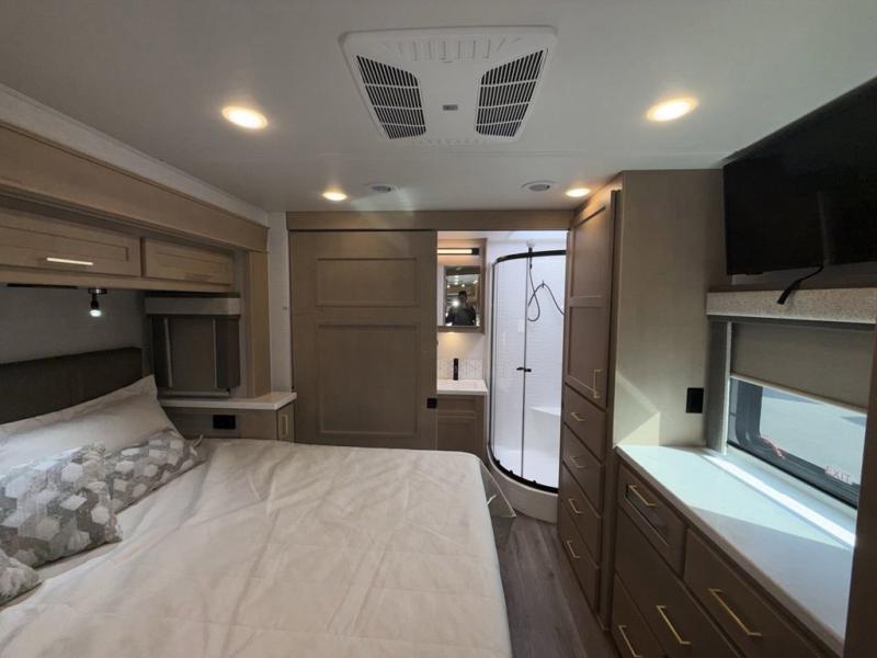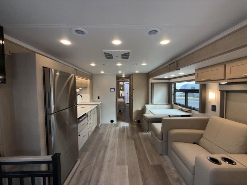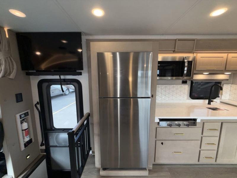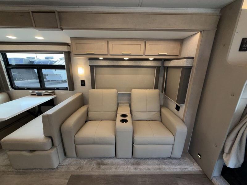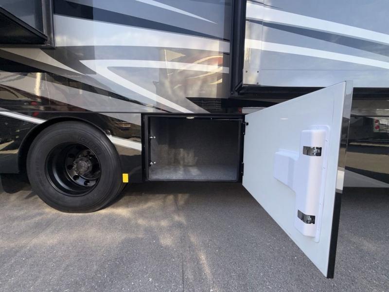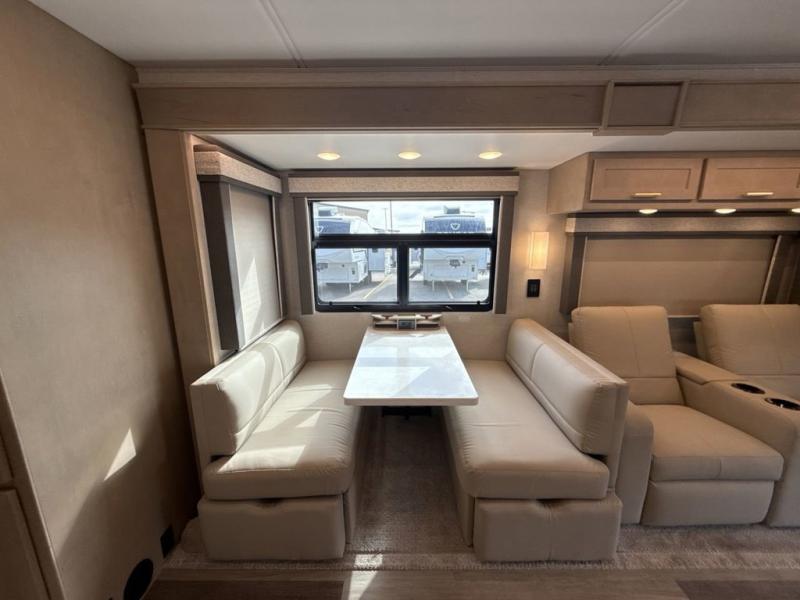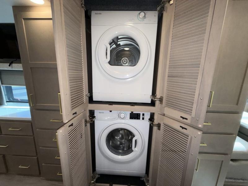 Start traveling the right way with this motorhome! There is plenty of entertainment throughout the inside and outside between the exterior entertainment center with a 32" Smart LED TV, a 42" Smart LED TV in the living area, and a 32" Smart LED TV in the private bedroom. Across from the half bathroom is an area pre-wired and plumbed for an optional washer and dryer so you can have clean clothes for your entire trip if you choose. The master suite has a 66" x 74" mini-king bed to lay your head on at night and access to the full rear bathroom which has a radius shower with a skylight above for natural lighting and overhead cabinets to store your toiletries. The sofa sleeper and booth dinette offer comfortable places to enjoy meals, socialize, and even transform into sleeping spaces!