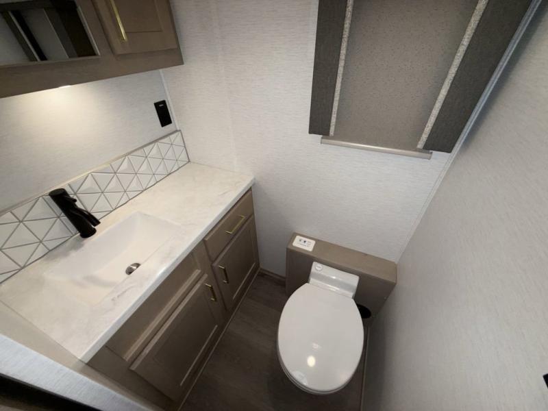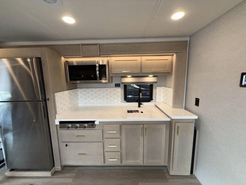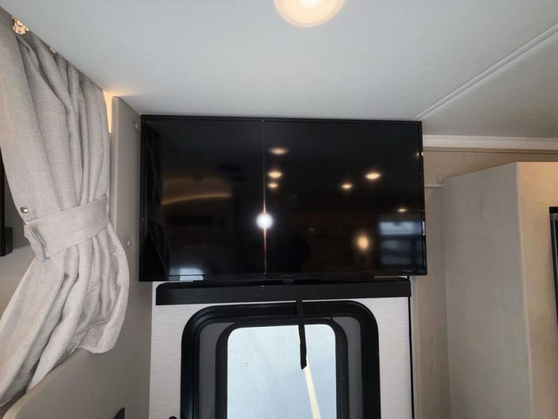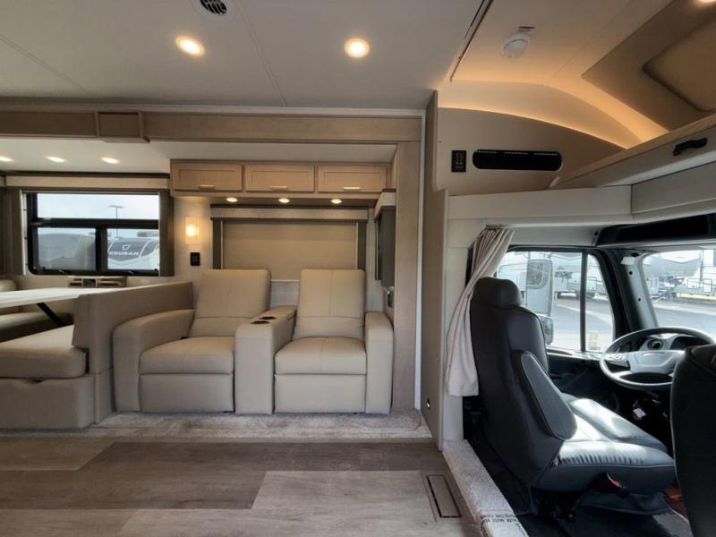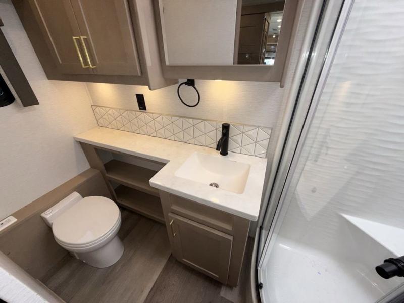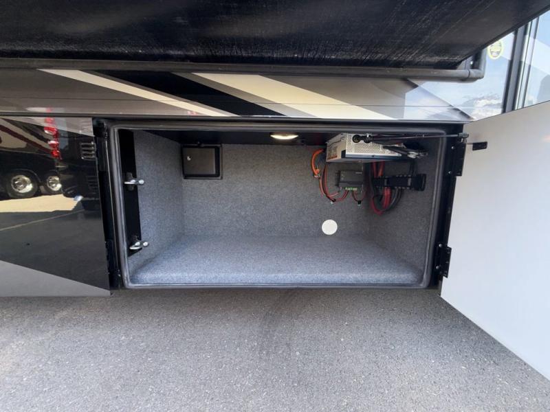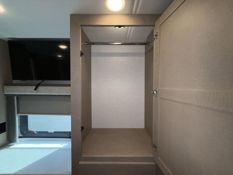 Start traveling the right way with this motorhome! There is plenty of entertainment throughout the inside and outside between the exterior entertainment center with a 32" Smart LED TV, a 42" Smart LED TV in the living area, and a 32" Smart LED TV in the private bedroom. Across from the half bathroom is an area pre-wired and plumbed for an optional washer and dryer so you can have clean clothes for your entire trip if you choose. The master suite has a 66" x 74" mini-king bed to lay your head on at night and access to the full rear bathroom which has a radius shower with a skylight above for natural lighting and overhead cabinets to store your toiletries. The sofa sleeper and booth dinette offer comfortable places to enjoy meals, socialize, and even transform into sleeping spaces!
