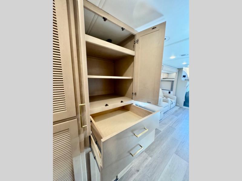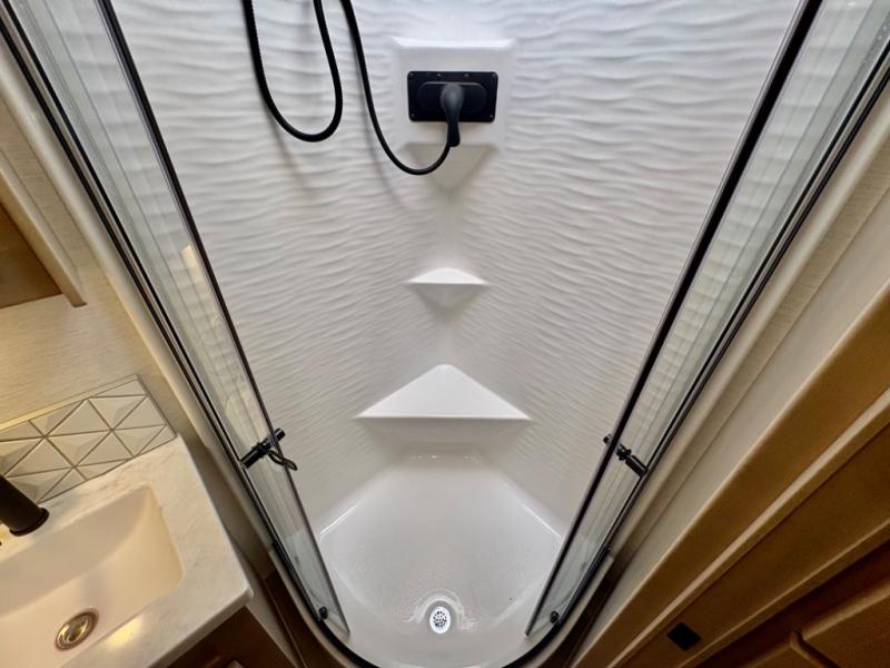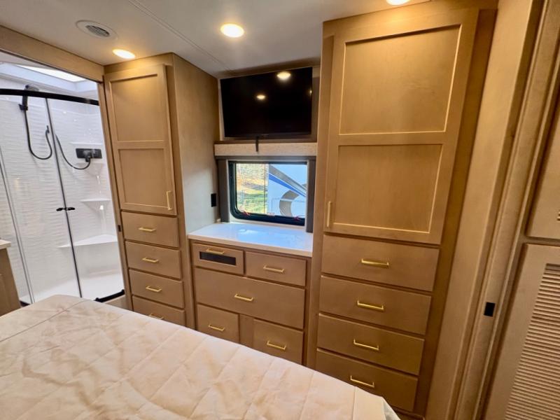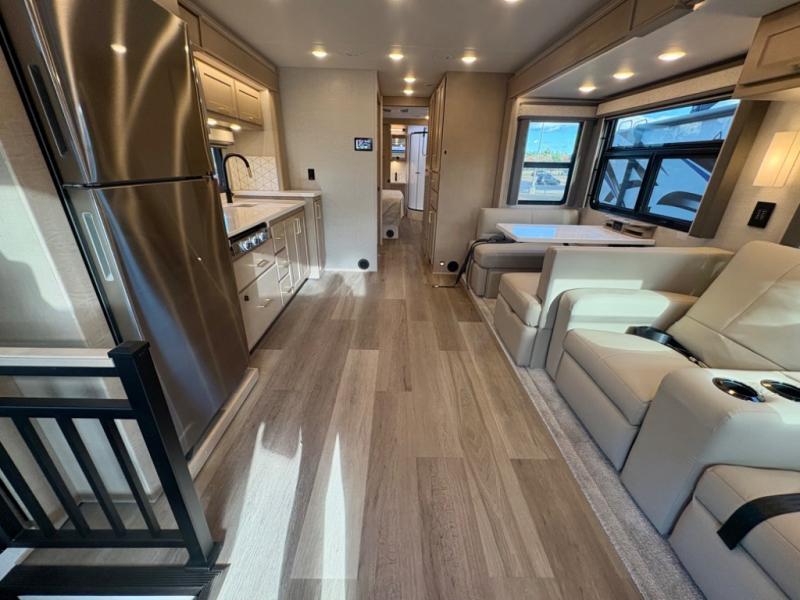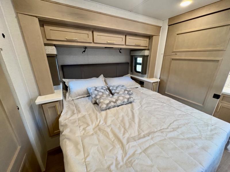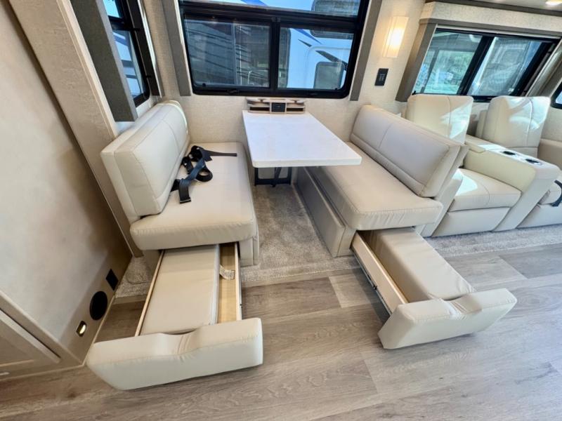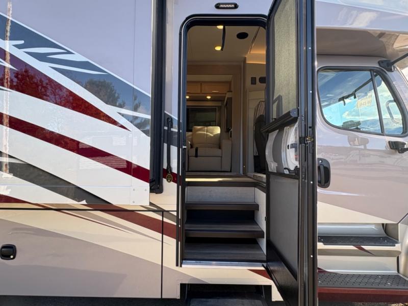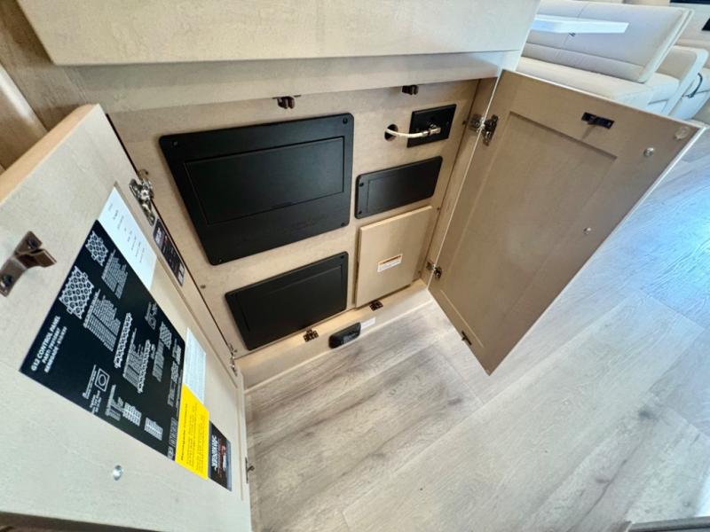 Start traveling the right way with this motorhome! There is plenty of entertainment throughout the inside and outside between the exterior entertainment center with a 32" Smart LED TV, a 42" Smart LED TV in the living area, and a 32" Smart LED TV in the private bedroom. Across from the half bathroom is an area pre-wired and plumbed for an optional washer and dryer so you can have clean clothes for your entire trip if you choose. The master suite has a 66" x 74" mini-king bed to lay your head on at night and access to the full rear bathroom which has a radius shower with a skylight above for natural lighting and overhead cabinets to store your toiletries. The sofa sleeper and booth dinette offer comfortable places to enjoy meals, socialize, and even transform into sleeping spaces!