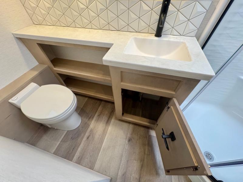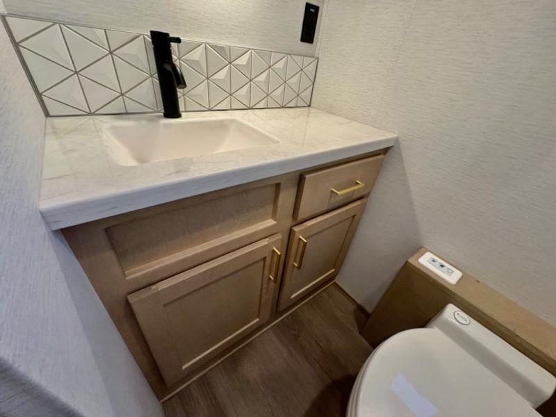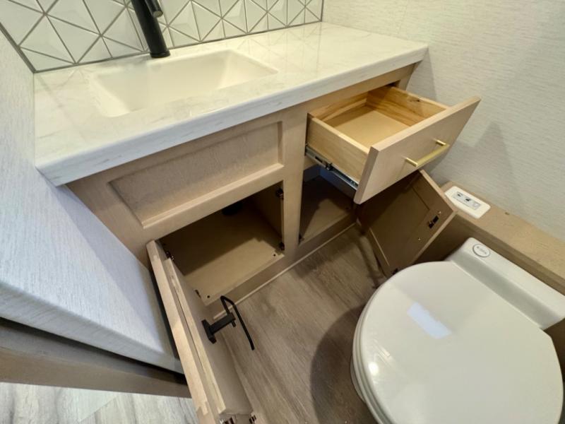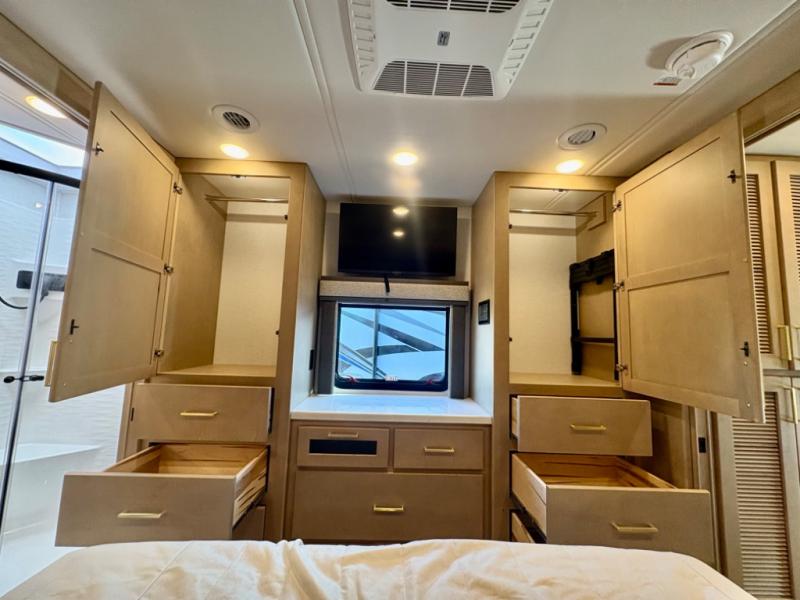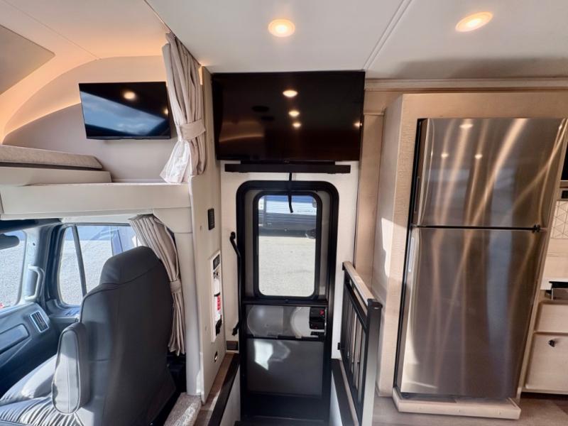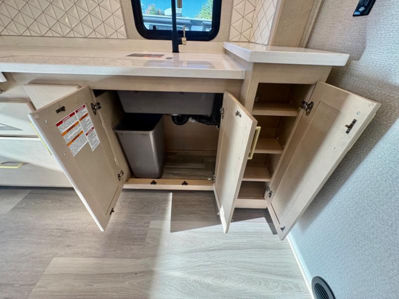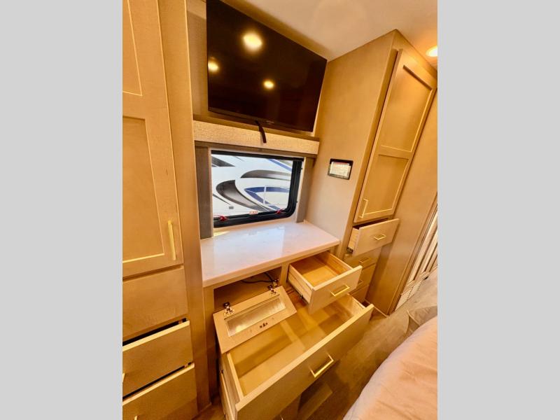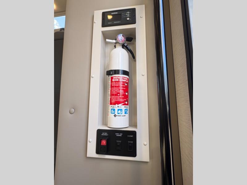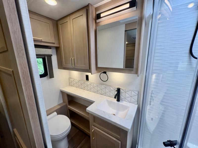 Start traveling the right way with this motorhome! There is plenty of entertainment throughout the inside and outside between the exterior entertainment center with a 32" Smart LED TV, a 42" Smart LED TV in the living area, and a 32" Smart LED TV in the private bedroom. Across from the half bathroom is an area pre-wired and plumbed for an optional washer and dryer so you can have clean clothes for your entire trip if you choose. The master suite has a 66" x 74" mini-king bed to lay your head on at night and access to the full rear bathroom which has a radius shower with a skylight above for natural lighting and overhead cabinets to store your toiletries. The sofa sleeper and booth dinette offer comfortable places to enjoy meals, socialize, and even transform into sleeping spaces!