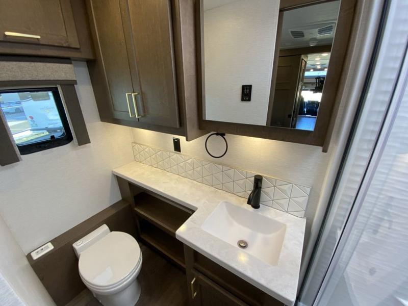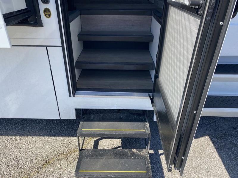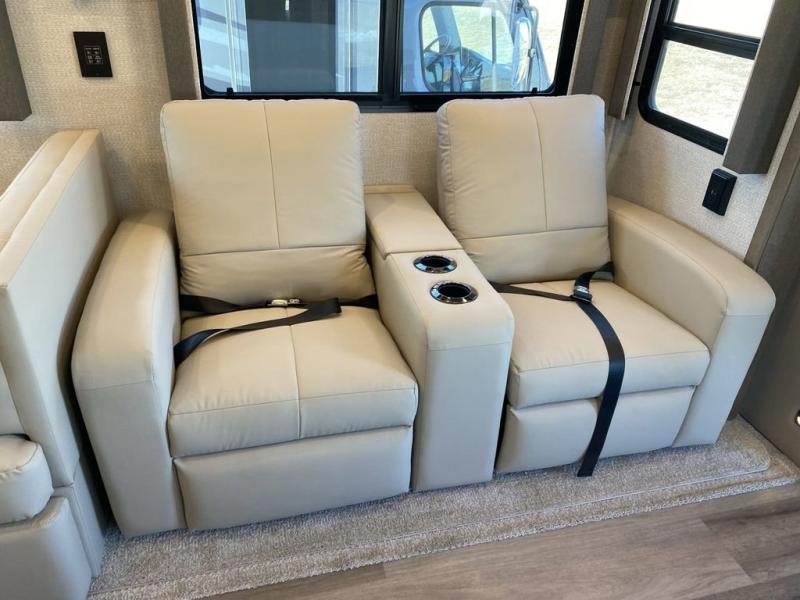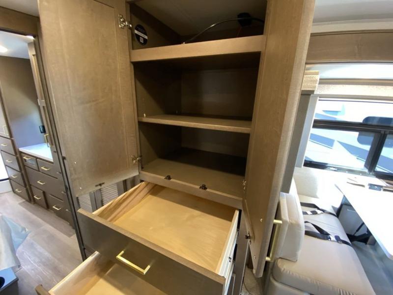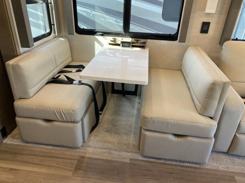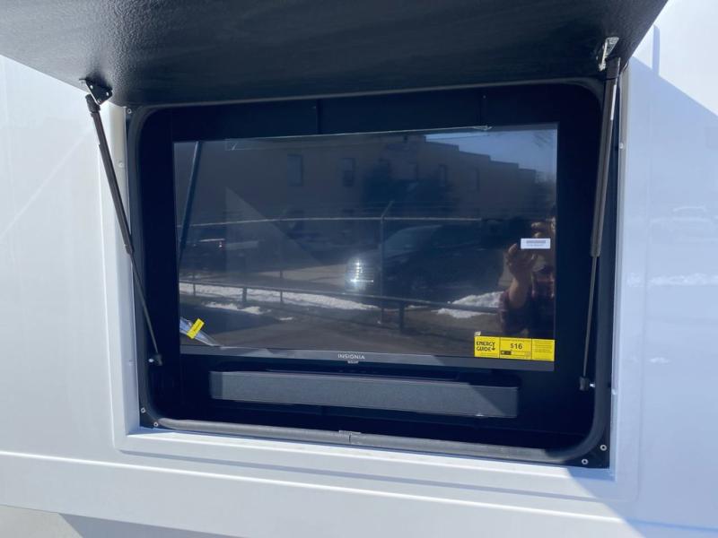 Start traveling the right way with this motorhome! There is plenty of entertainment throughout the inside and outside between the exterior entertainment center with a 32" Smart LED TV, a 42" Smart LED TV in the living area, and a 32" Smart LED TV in the private bedroom. Across from the half bathroom is an area pre-wired and plumbed for an optional washer and dryer so you can have clean clothes for your entire trip if you choose. The master suite has a 66" x 74" mini-king bed to lay your head on at night and access to the full rear bathroom which has a radius shower with a skylight above for natural lighting and overhead cabinets to store your toiletries. The sofa sleeper and booth dinette offer comfortable places to enjoy meals, socialize, and even transform into sleeping spaces!