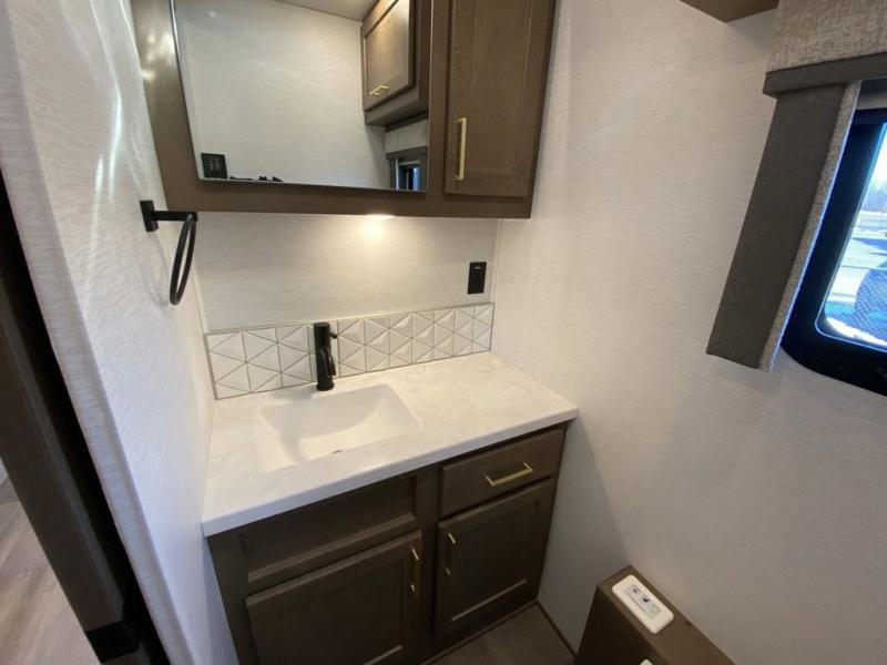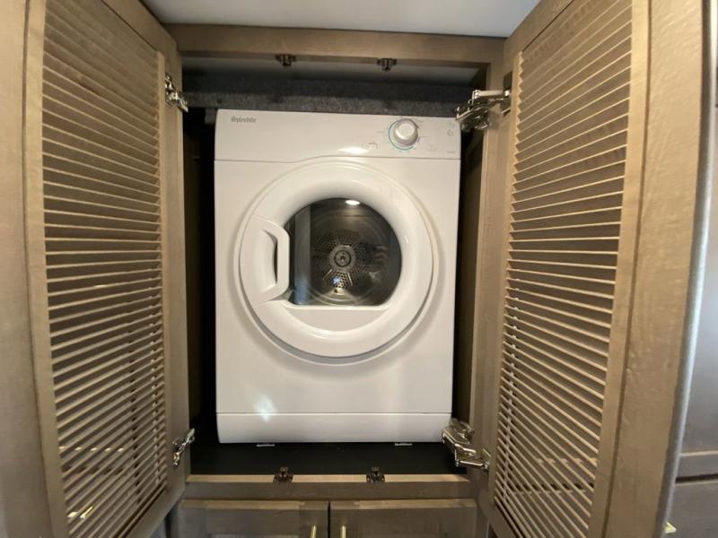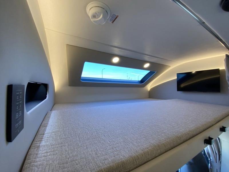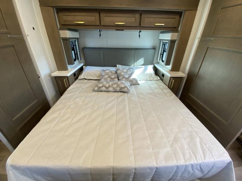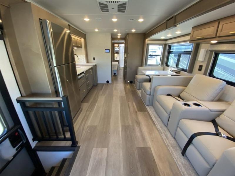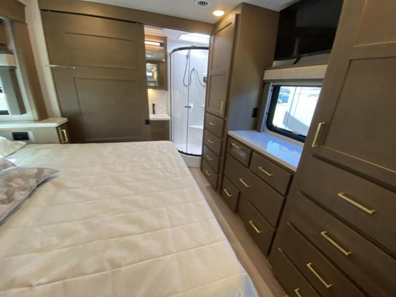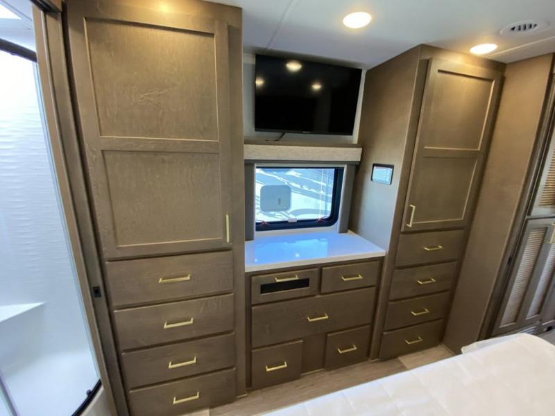 Start traveling the right way with this motorhome! There is plenty of entertainment throughout the inside and outside between the exterior entertainment center with a 32" Smart LED TV, a 42" Smart LED TV in the living area, and a 32" Smart LED TV in the private bedroom. Across from the half bathroom is an area pre-wired and plumbed for an optional washer and dryer so you can have clean clothes for your entire trip if you choose. The master suite has a 66" x 74" mini-king bed to lay your head on at night and access to the full rear bathroom which has a radius shower with a skylight above for natural lighting and overhead cabinets to store your toiletries. The sofa sleeper and booth dinette offer comfortable places to enjoy meals, socialize, and even transform into sleeping spaces!