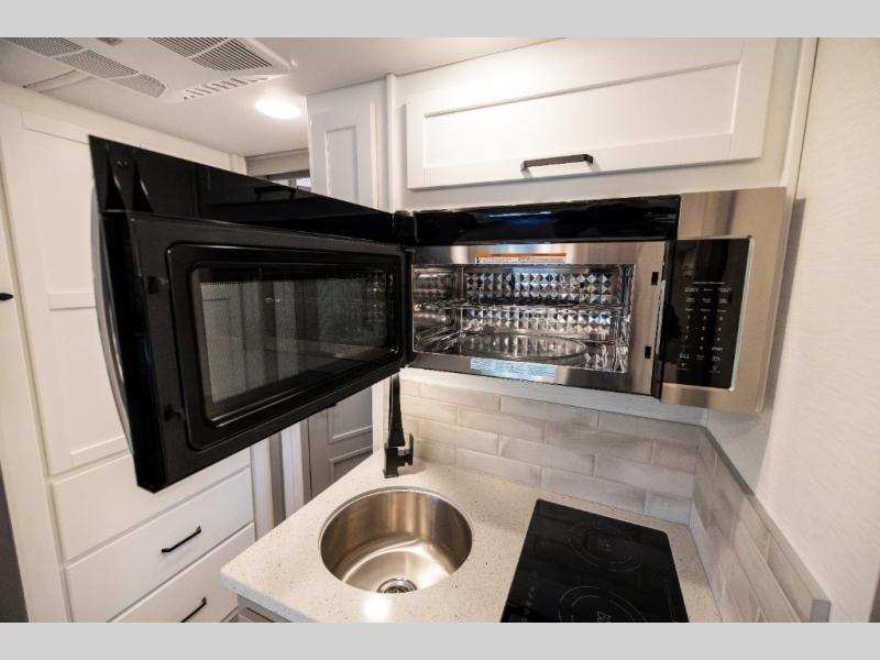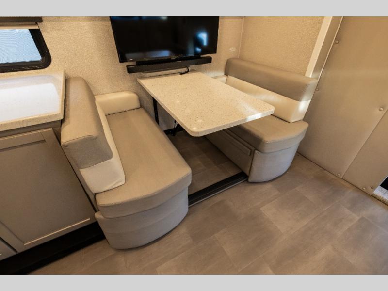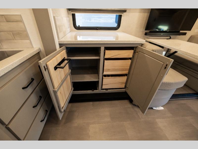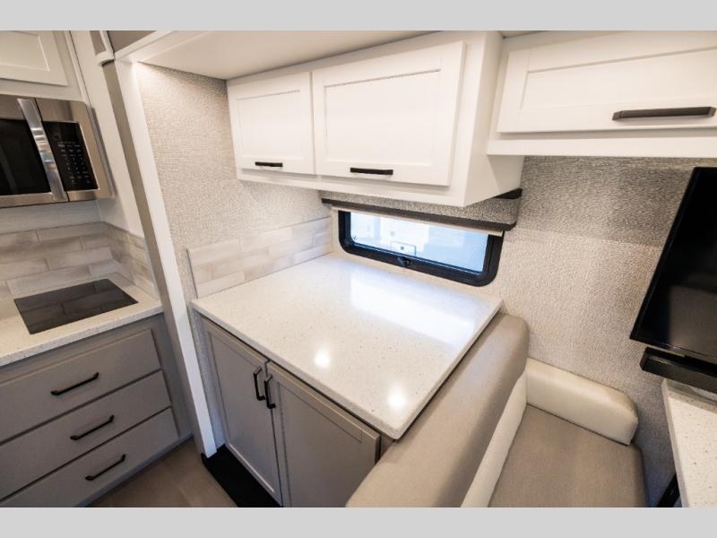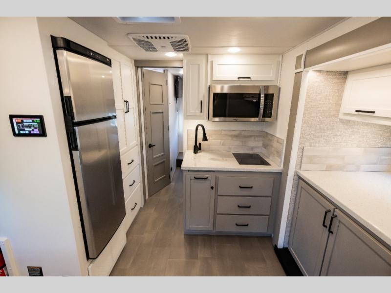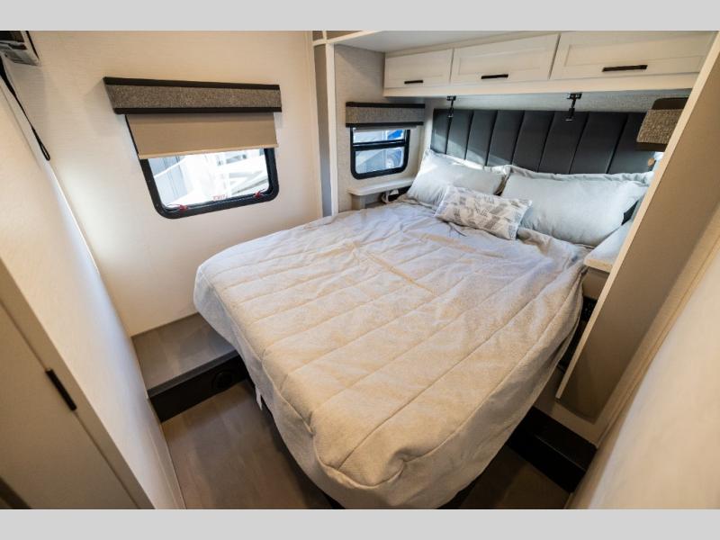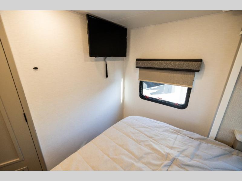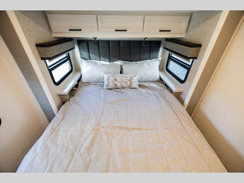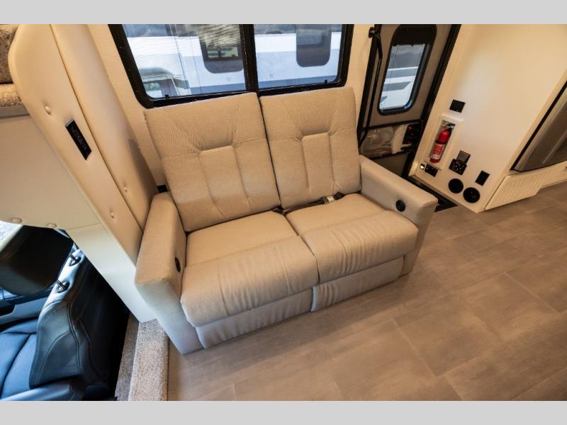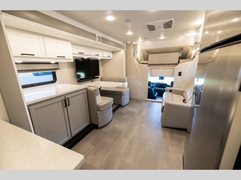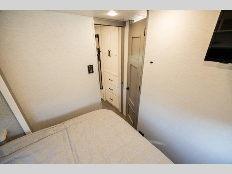 Experience ultimate luxury on wheels in this motor home bedroom. A 65 x 75 queen bed comfort with 32” LED TV entertainment and a full bathroom convenience with ample storage. The kitchen is fitted with spacious closet organization, 10 cu. stainless steel refrigerator, microwave, two-burner cooktop, overhead cabinets, and a pantry storage ideal for storing different stuff. In the living room, you will find a 42” LED TV, overhead cabinets, sofa sleeper flexibility, dinette dining, and a cab-over bed for extra sleep. This unit is also equipped with outdoor entertainment, perfect for socializing and outdoor fun, allowing you to experience extended trips with family during vacations, ideal for those who are adventure-seekers. Unforgettable adventures await! Experience the freedom of luxury motorhome living.