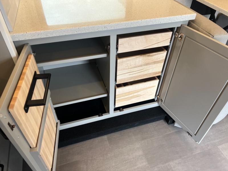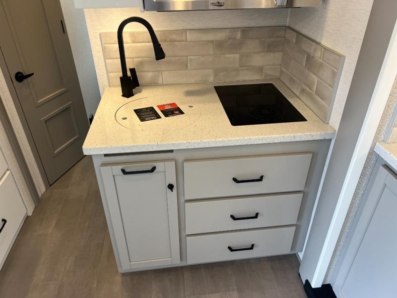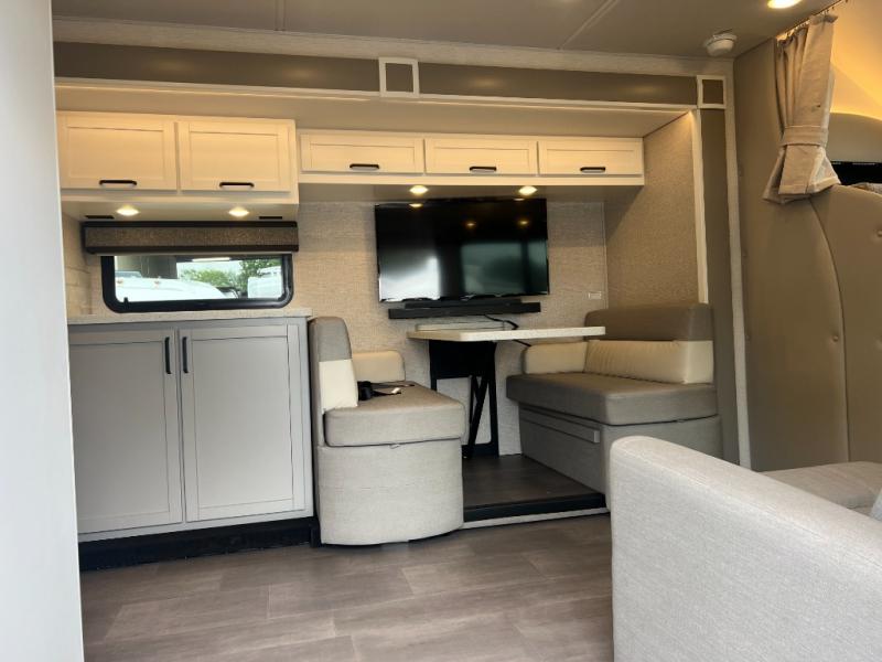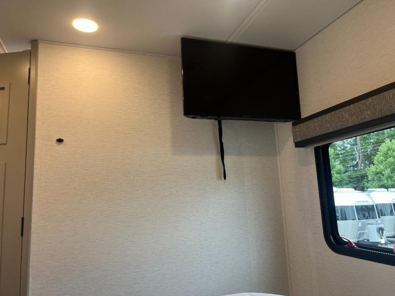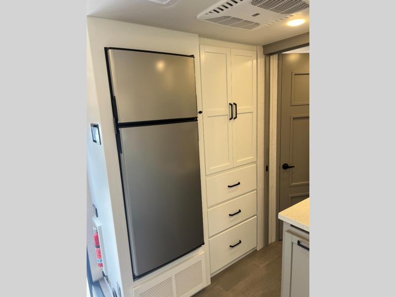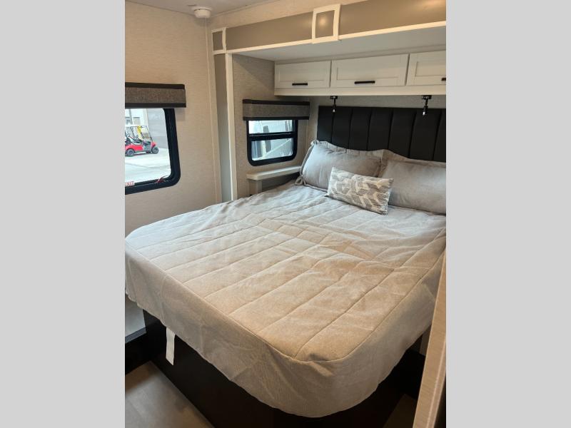 Experience ultimate luxury on wheels in this motor home bedroom. A 65 x 75 queen bed comfort with 32” LED TV entertainment and a full bathroom convenience with ample storage. The kitchen is fitted with spacious closet organization, 10 cu. stainless steel refrigerator, microwave, two-burner cooktop, overhead cabinets, and a pantry storage ideal for storing different stuff. In the living room, you will find a 42” LED TV, overhead cabinets, sofa sleeper flexibility, dinette dining, and a cab-over bed for extra sleep. This unit is also equipped with outdoor entertainment, perfect for socializing and outdoor fun, allowing you to experience extended trips with family during vacations, ideal for those who are adventure-seekers. Unforgettable adventures await! Experience the freedom of luxury motorhome living.
