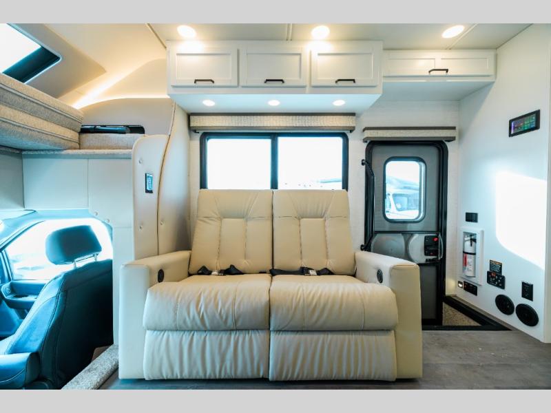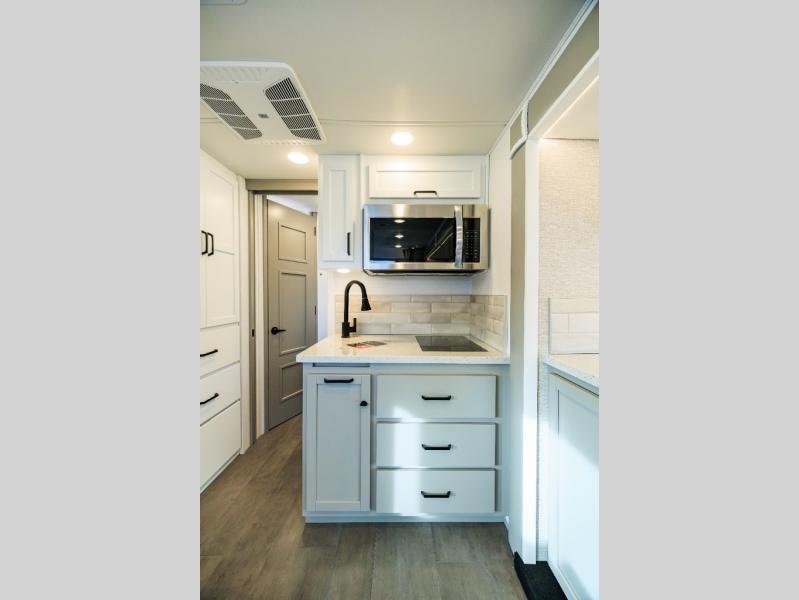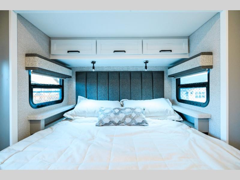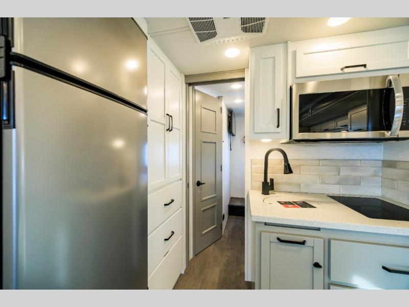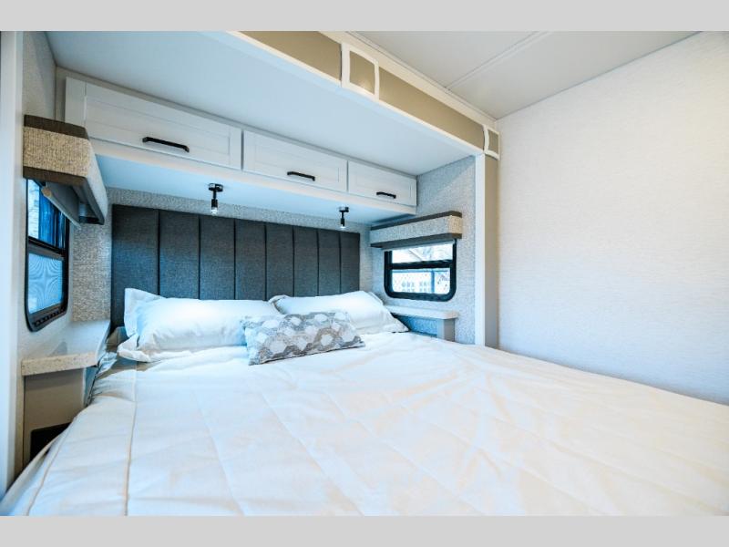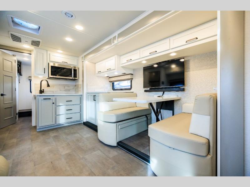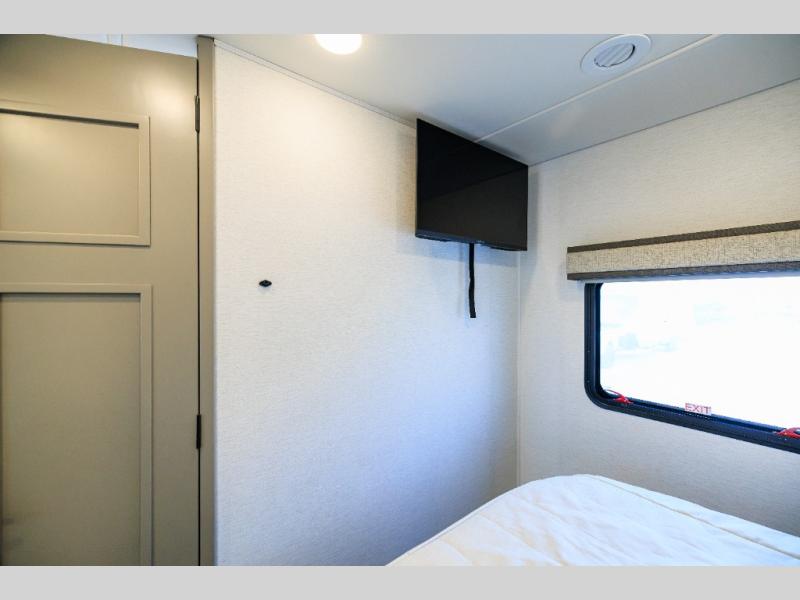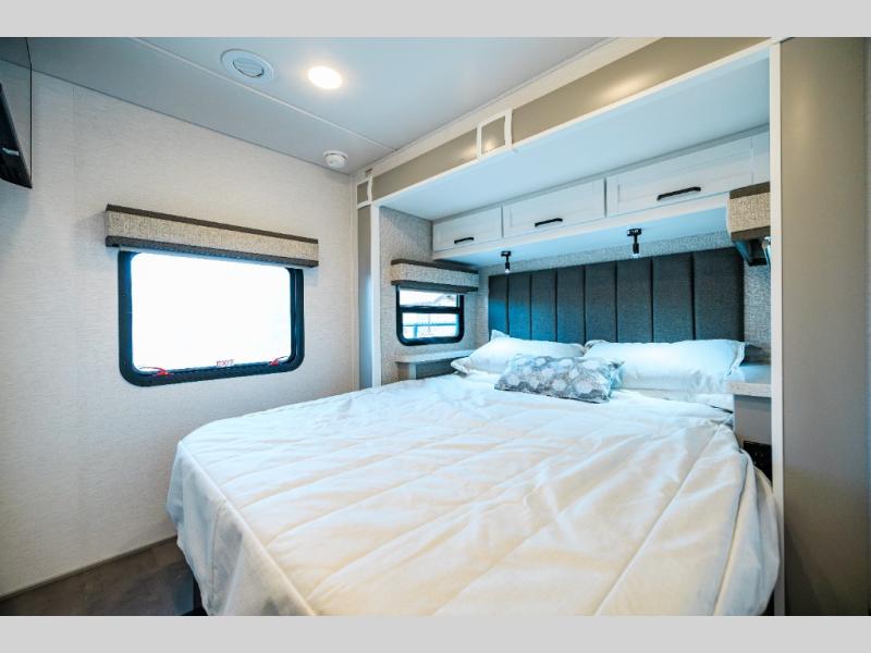 Experience ultimate luxury on wheels in this motor home bedroom. A 65 x 75 queen bed comfort with 32” LED TV entertainment and a full bathroom convenience with ample storage. The kitchen is fitted with spacious closet organization, 10 cu. stainless steel refrigerator, microwave, two-burner cooktop, overhead cabinets, and a pantry storage ideal for storing different stuff. In the living room, you will find a 42” LED TV, overhead cabinets, sofa sleeper flexibility, dinette dining, and a cab-over bed for extra sleep. This unit is also equipped with outdoor entertainment, perfect for socializing and outdoor fun, allowing you to experience extended trips with family during vacations, ideal for those who are adventure-seekers. Unforgettable adventures await! Experience the freedom of luxury motorhome living.