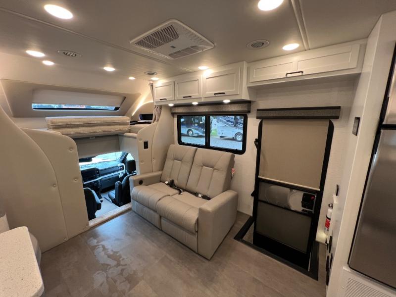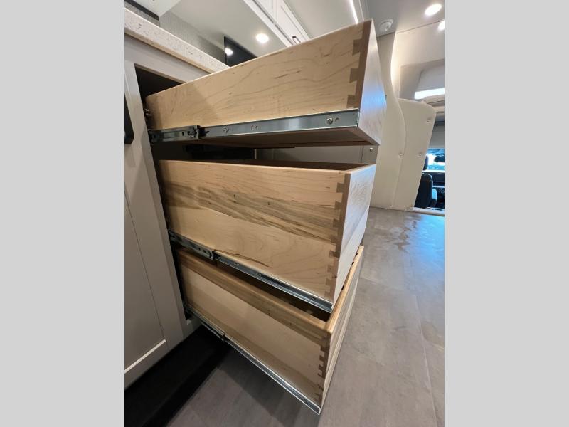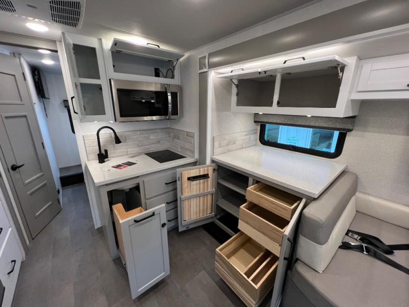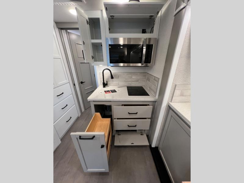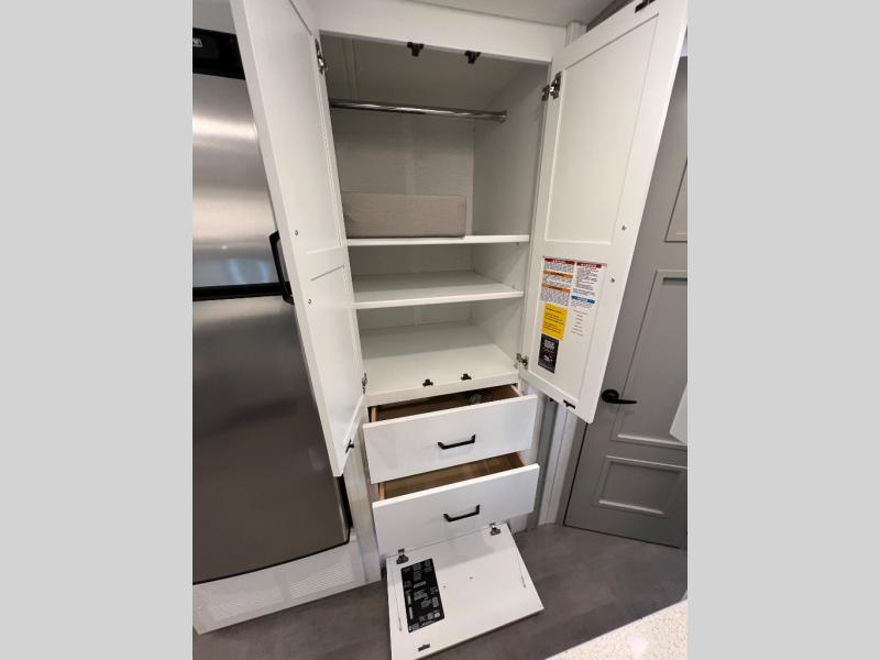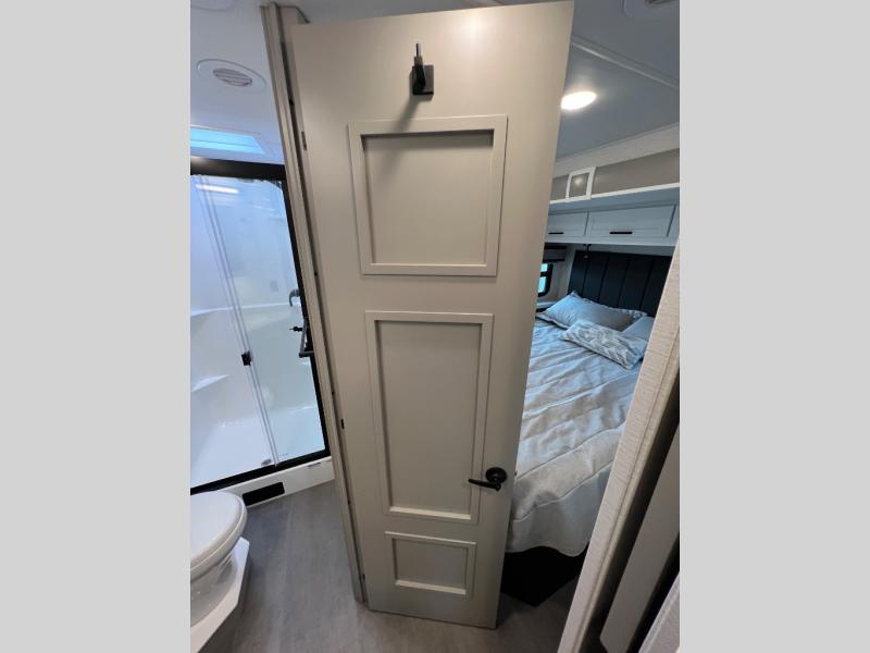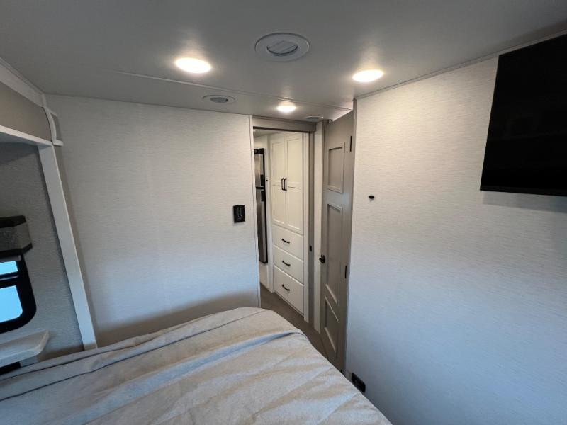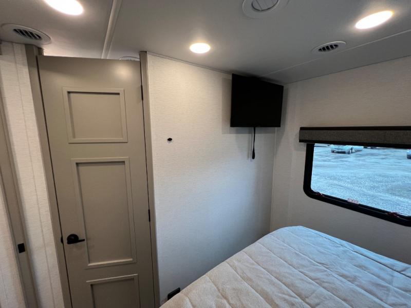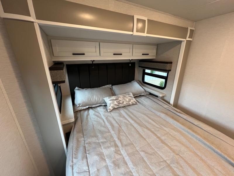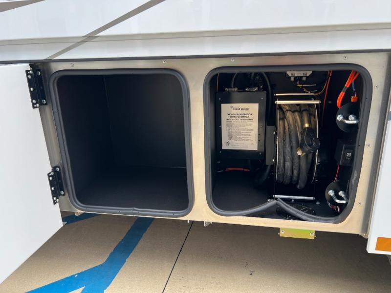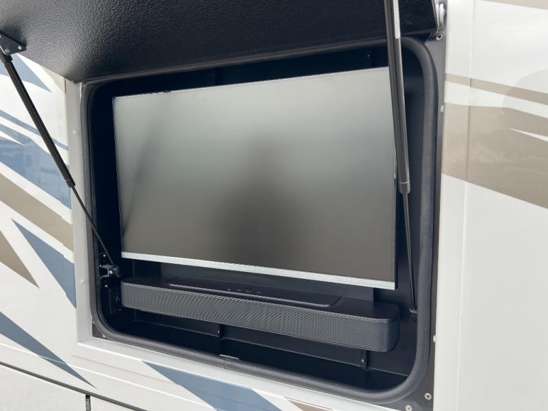 Experience ultimate luxury on wheels in this motor home bedroom. A 60 x 75 queen bed comfort with 32” LED TV entertainment and a full bathroom convenience with ample storage. The kitchen is fitted with spacious closet organization, 10 cu. stainless steel refrigerator, microwave, two-burner cooktop, overhead cabinets, and a pantry storage ideal for storing different stuff. In the living room, you will find a 42” LED TV, overhead cabinets, sofa sleeper flexibility, dinette dining, and a cab-over bed for extra sleep. This unit is also equipped with outdoor entertainment, perfect for socializing and outdoor fun, allowing you to experience extended trips with family during vacations, ideal for those who are adventure-seekers. Unforgettable adventures await! Experience the freedom of luxury motorhome living.