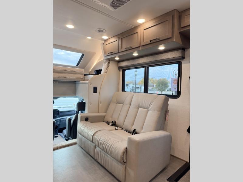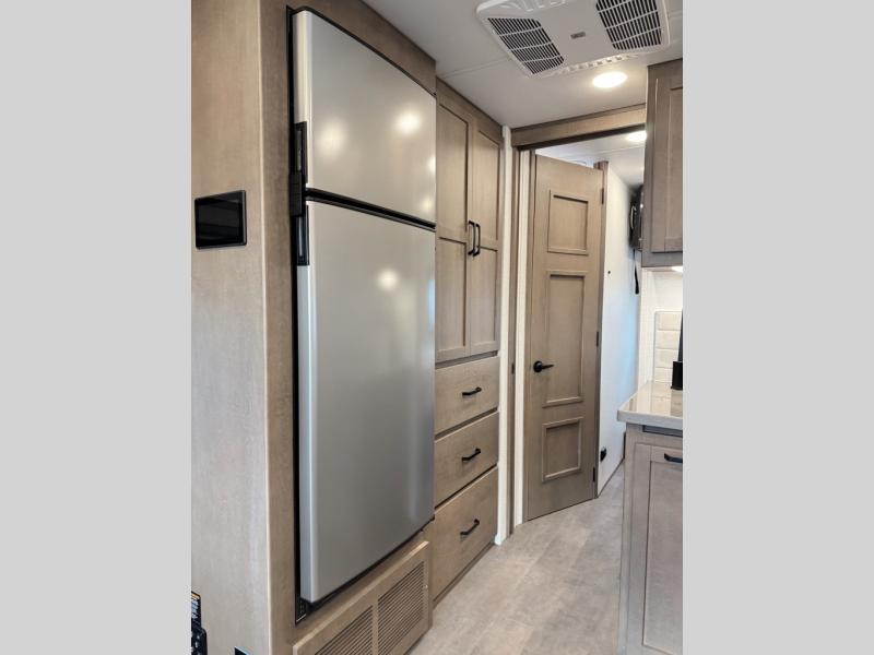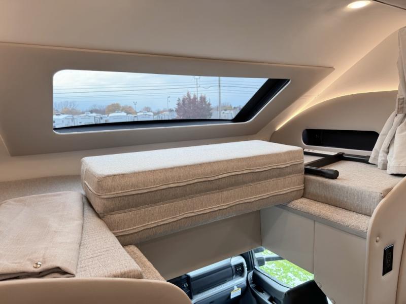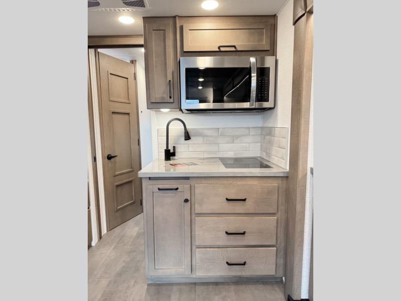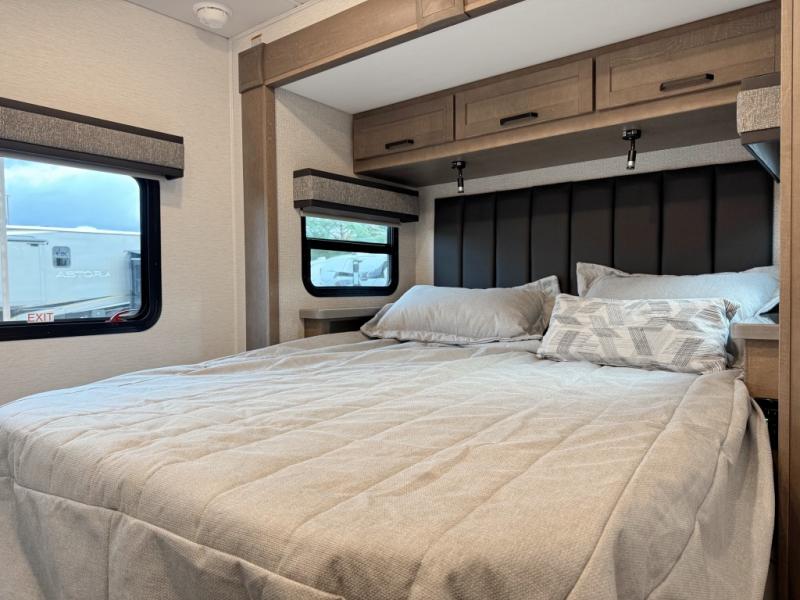 Experience ultimate luxury on wheels in this motor home bedroom. A 60 x 75 queen bed comfort with 32” LED TV entertainment and a full bathroom convenience with ample storage. The kitchen is fitted with spacious closet organization, 10 cu. stainless steel refrigerator, microwave, two-burner cooktop, overhead cabinets, and a pantry storage ideal for storing different stuff. In the living room, you will find a 42” LED TV, overhead cabinets, sofa sleeper flexibility, dinette dining, and a cab-over bed for extra sleep. This unit is also equipped with outdoor entertainment, perfect for socializing and outdoor fun, allowing you to experience extended trips with family during vacations, ideal for those who are adventure-seekers. Unforgettable adventures await! Experience the freedom of luxury motorhome living.