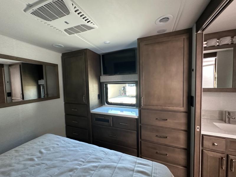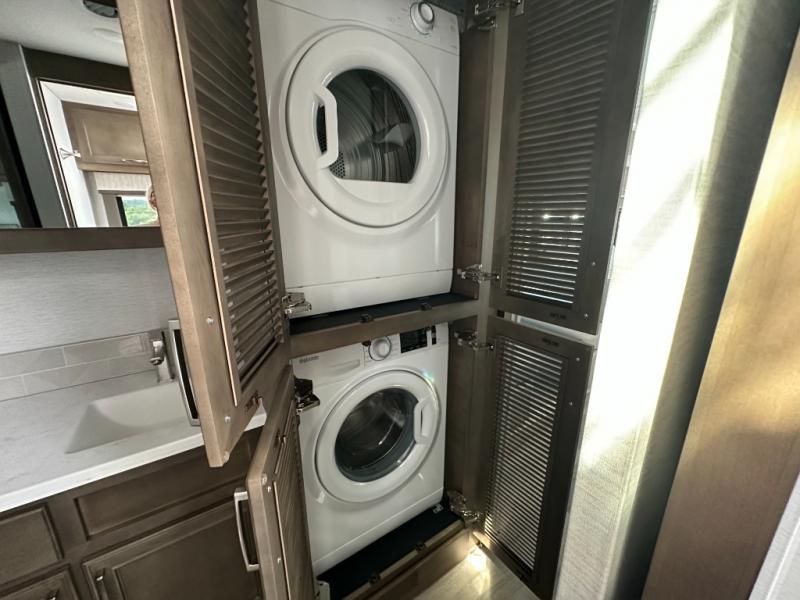 Whether you travel while you work or enjoy long-trips in your RV, this coach provides all the luxury, flexibility and comfort you could want! The main living and kitchen area is spacious with a furniture slide which includes a booth dinette and a slide-a-bed sofa which both offer sleeping space when needed for guests. The cook will love using the stainless steel convection microwave oven and the induction cooktop when making meals, and the French door residential refrigerator will hold lots of cold food. The separated bathroom allows two people to get ready at once, and the mini-king bed slide gives you more floor space in the bedroom to get to the closets and dresser. You will find a 32" 4K Smart LED TV in the bedroom to watch before bedtime, and the exterior offers a 32" LED TV to watch the big game while relaxing under the electric awning with LED lights. And you might like to add the washer/dryer option to the prepped closet to keep everything clean while on the road.
