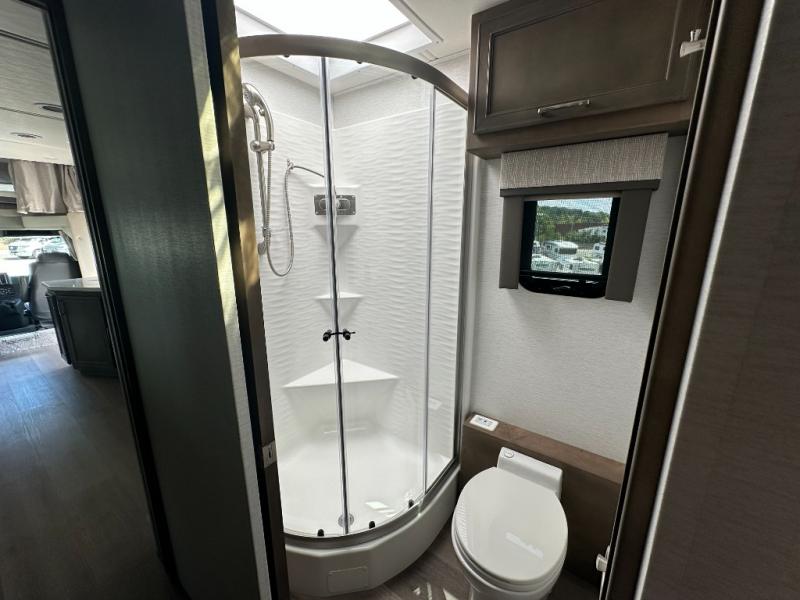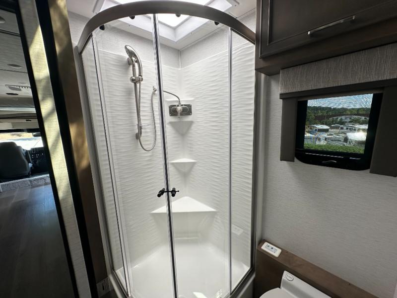 With any Renegade Verona Super C diesel motorhome, you will have confidence to explore the open road! The Cummins 360HP 3200TRV Allison transmission gives you the power and performance to travel anywhere, and the 3000-watt true sine wave inverter makes this an electric coach, plus the aluminum automotive cab construction is designed and tested for occupant protection. The interior boast about the solid hardwood cabinets including every cabinet stile and passage door are made from hardwood for true residential craftsmanship and the articulating cabinet hinges complete the package. More luxurious features include the solid surface countertops, the memory foam mattress, and the wavy patterned fiberglass shower with a glass door. Choose extreme luxury, purpose and durability; take a Verona on the road today!