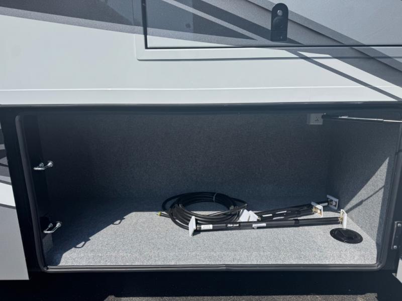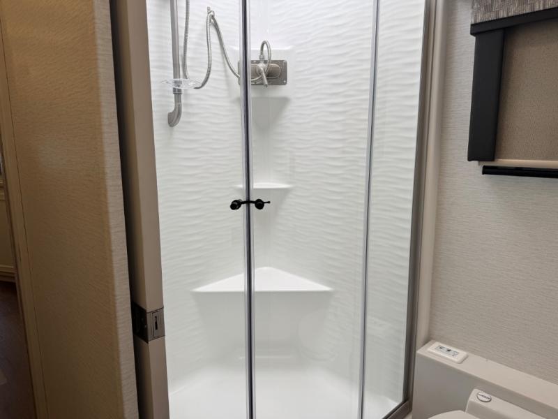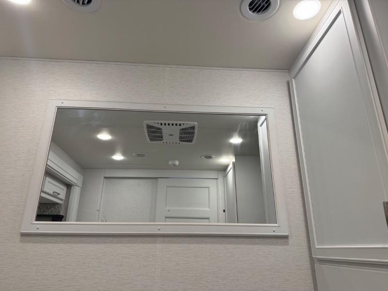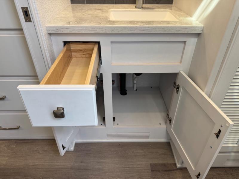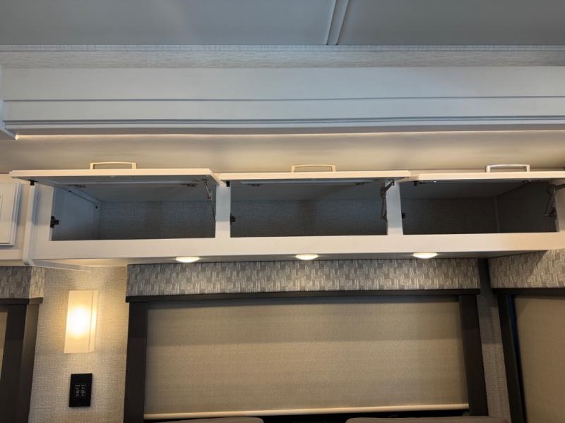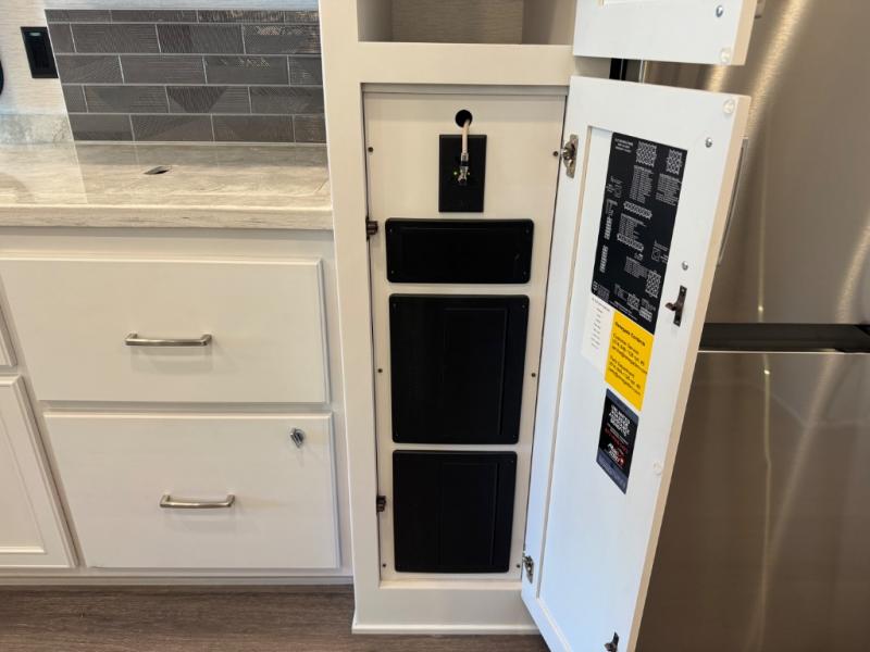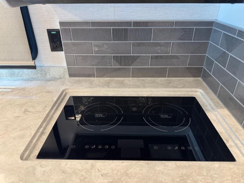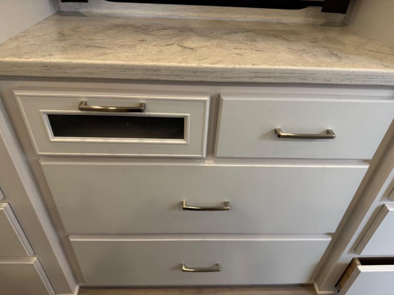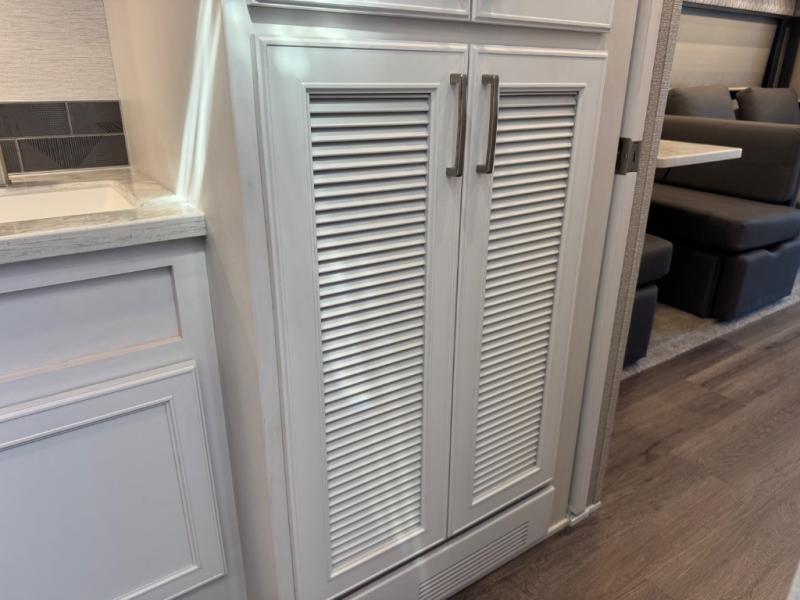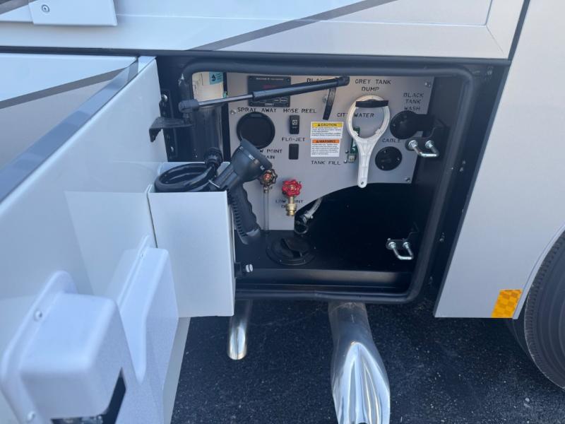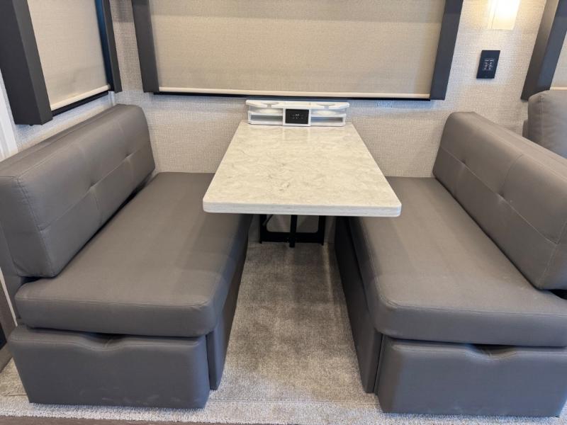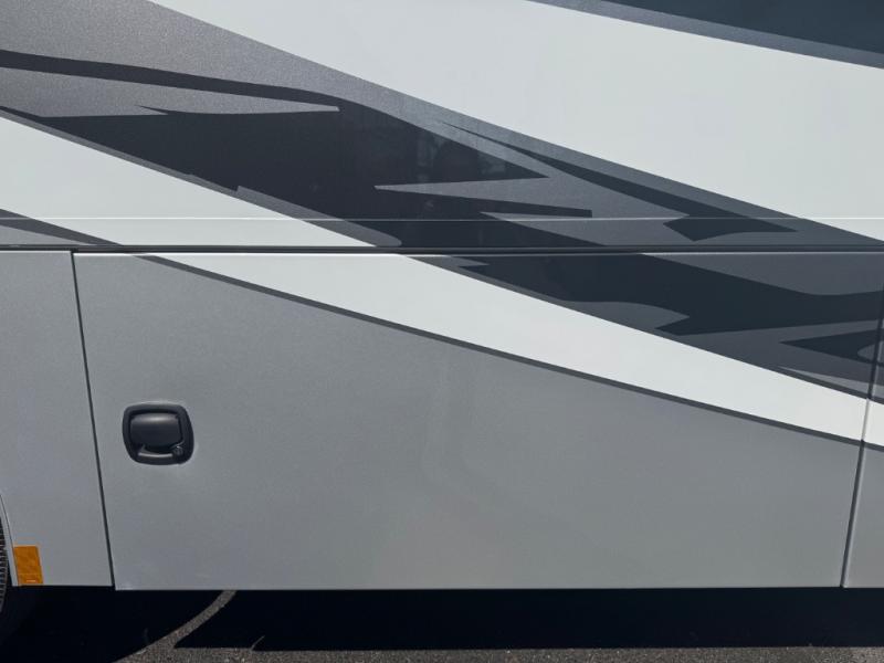 Whether you travel while you work or enjoy long-trips in your RV, this coach provides all the luxury, flexibility and comfort you could want! The main living and kitchen area is spacious with a furniture slide which includes a booth dinette and a slide-a-bed sofa which both offer sleeping space when needed for guests. The cook will love using the stainless steel convection microwave oven and the induction cooktop when making meals, and the French door residential refrigerator will hold lots of cold food. The separated bathroom allows two people to get ready at once, and the mini-king bed slide gives you more floor space in the bedroom to get to the closets and dresser. You will find a 32" 4K Smart LED TV in the bedroom to watch before bedtime, and the exterior offers a 32" LED TV to watch the big game while relaxing under the electric awning with LED lights. And you might like to add the washer/dryer option to the prepped closet to keep everything clean while on the road.