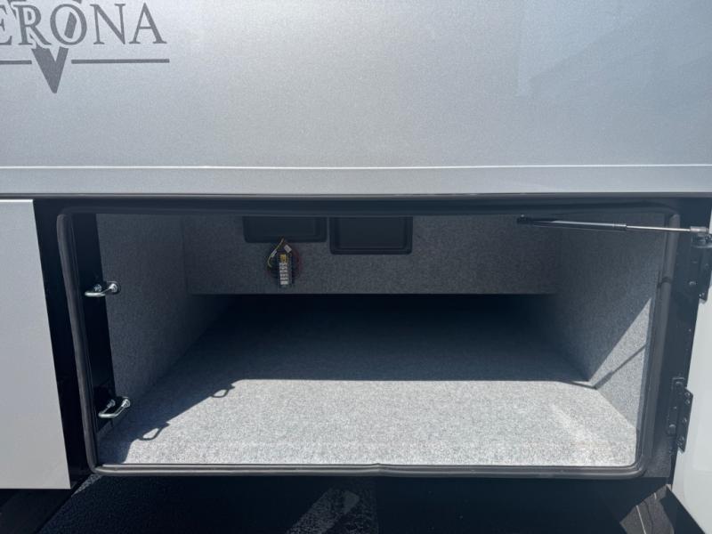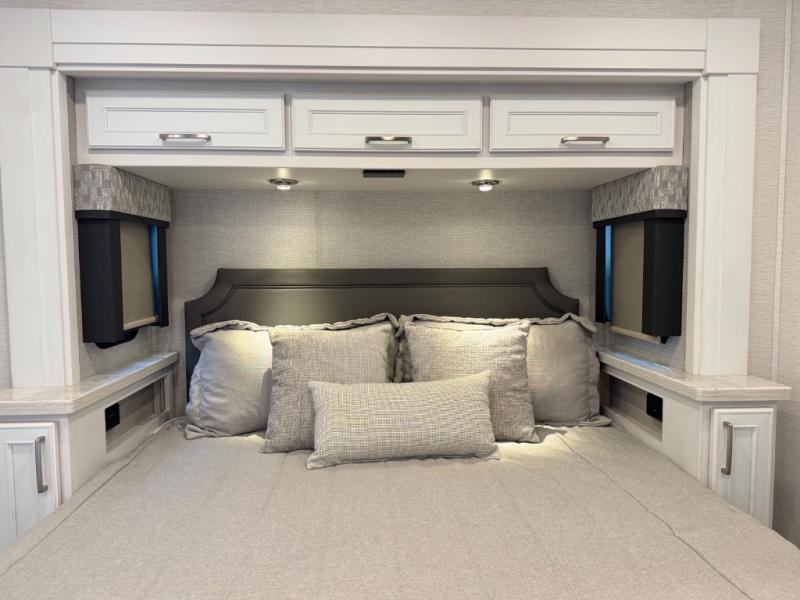 With any Renegade Verona Super C diesel motorhome, you will have confidence to explore the open road! The Cummins 360HP 3200TRV Allison transmission gives you the power and performance to travel anywhere, and the 3000-watt true sine wave inverter makes this an electric coach, plus the aluminum automotive cab construction is designed and tested for occupant protection. The interior boast about the solid hardwood cabinets including every cabinet stile and passage door are made from hardwood for true residential craftsmanship and the articulating cabinet hinges complete the package. More luxurious features include the solid surface countertops, the memory foam mattress, and the wavy patterned fiberglass shower with a glass door. Choose extreme luxury, purpose and durability; take a Verona on the road today!