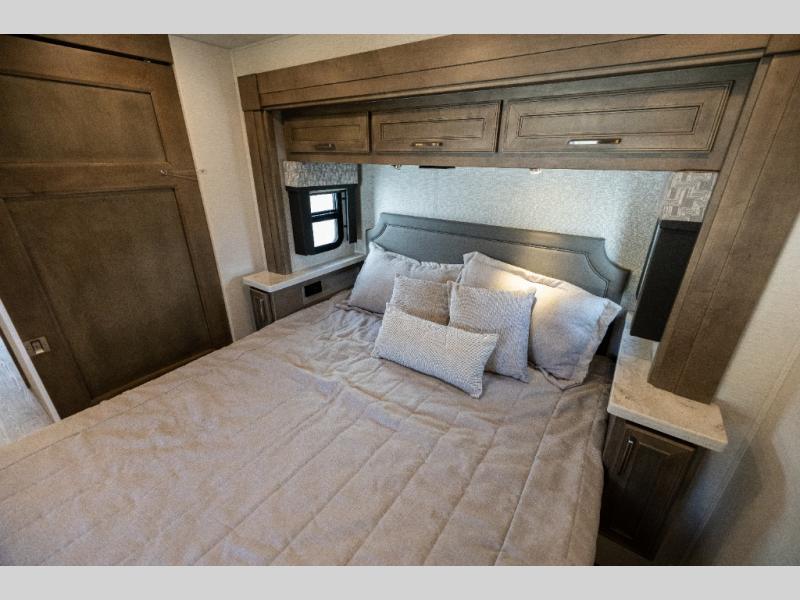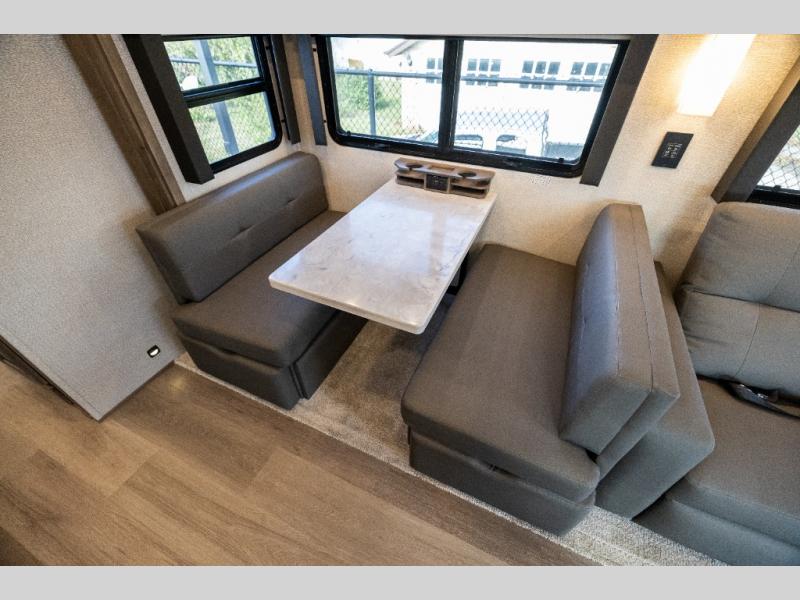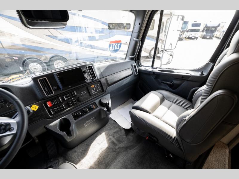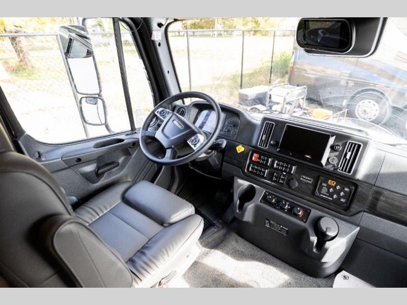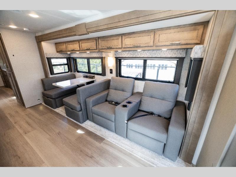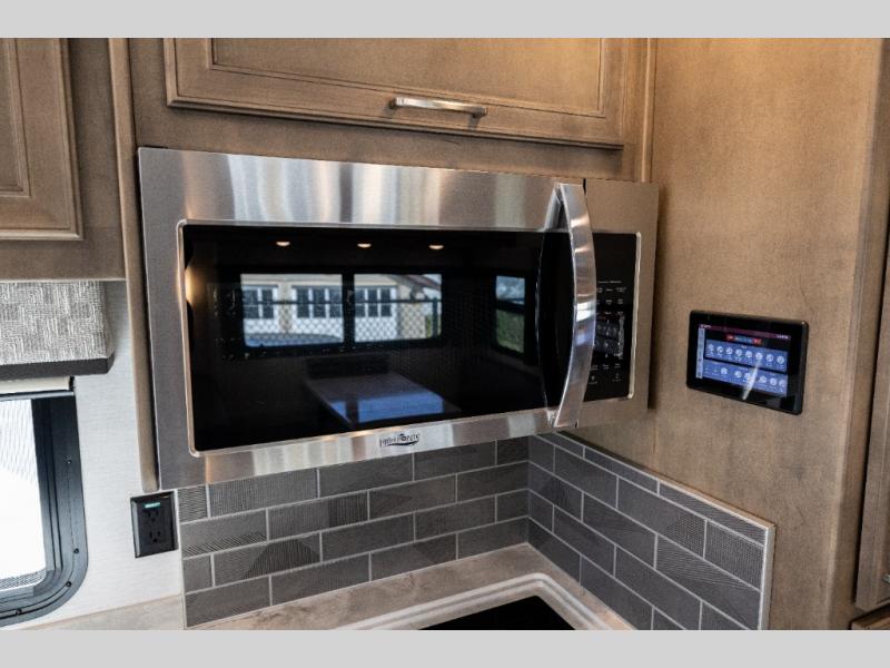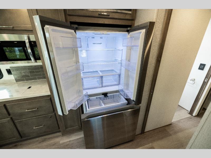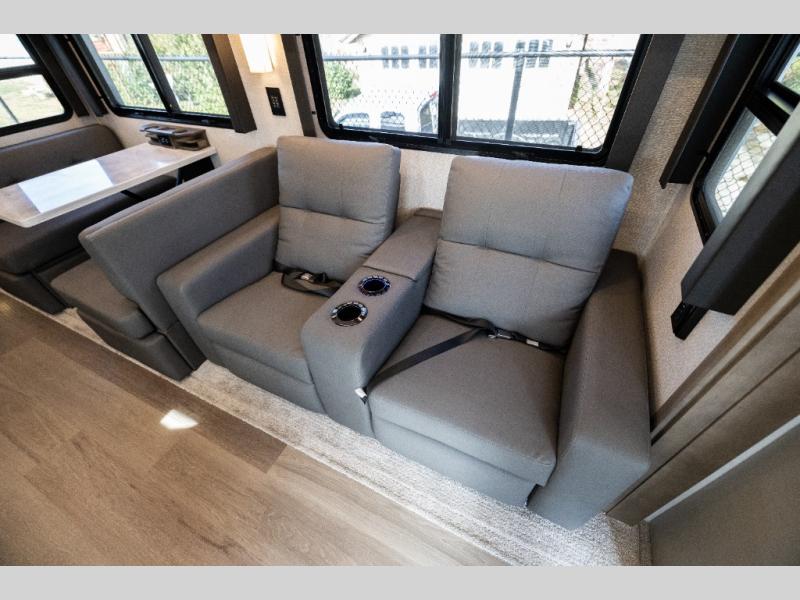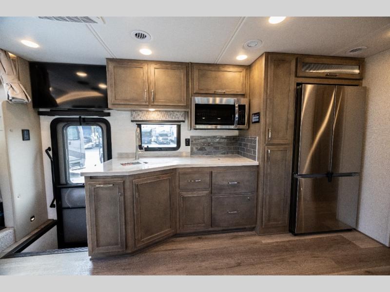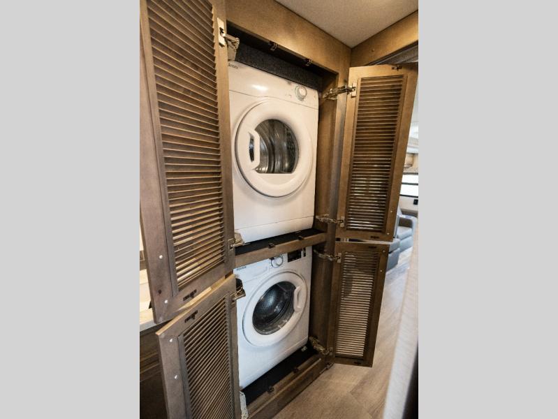 Whether you travel while you work or enjoy long-trips in your RV, this coach provides all the luxury, flexibility and comfort you could want! The main living and kitchen area is spacious with a furniture slide which includes a booth dinette and a slide-a-bed sofa which both offer sleeping space when needed for guests. The cook will love using the stainless steel convection microwave oven and the induction cooktop when making meals, and the French door residential refrigerator will hold lots of cold food. The separated bathroom allows two people to get ready at once, and the mini-king bed slide gives you more floor space in the bedroom to get to the closets and dresser. You will find a 32" 4K Smart LED TV in the bedroom to watch before bedtime, and the exterior offers a 32" LED TV to watch the big game while relaxing under the electric awning with LED lights. And you might like to add the washer/dryer option to the prepped closet to keep everything clean while on the road.