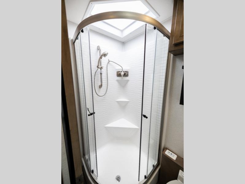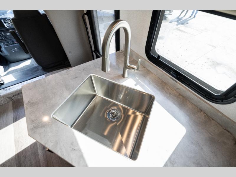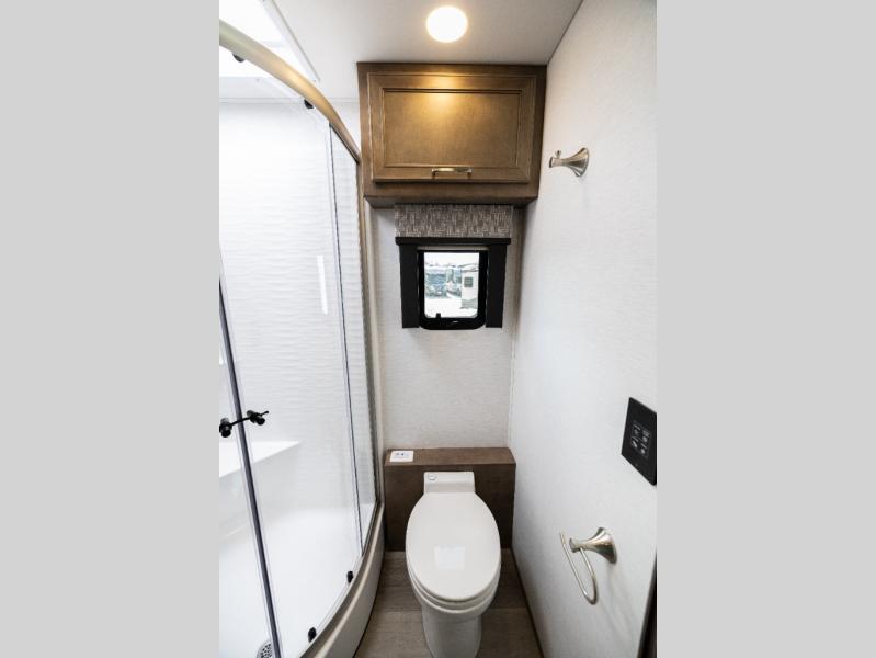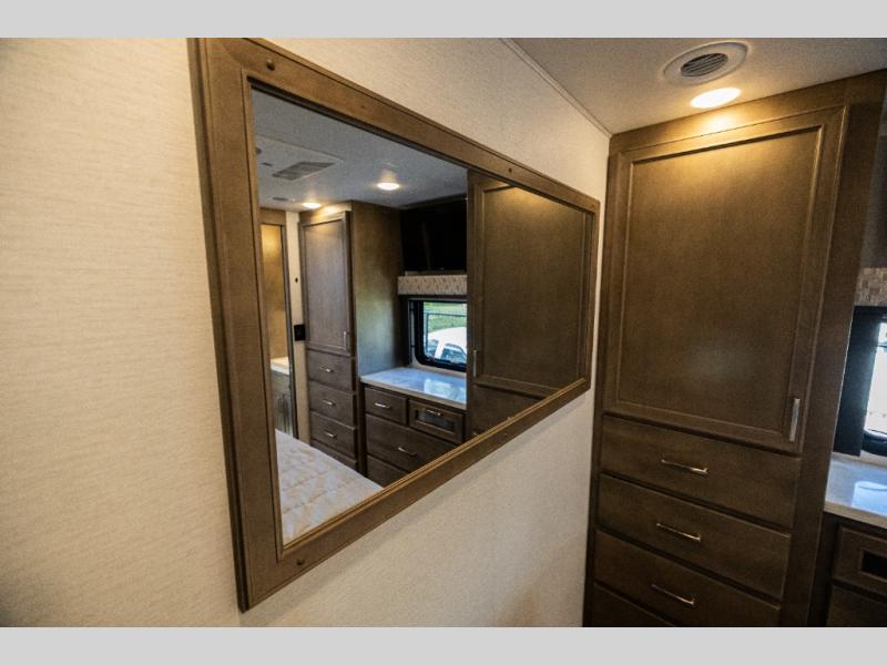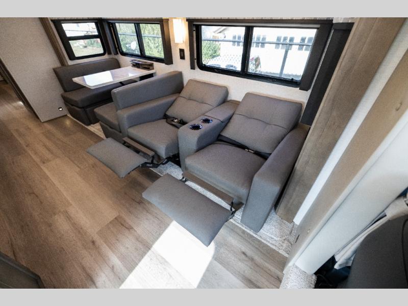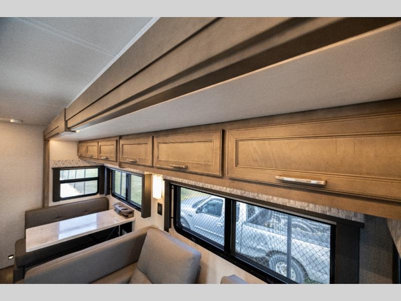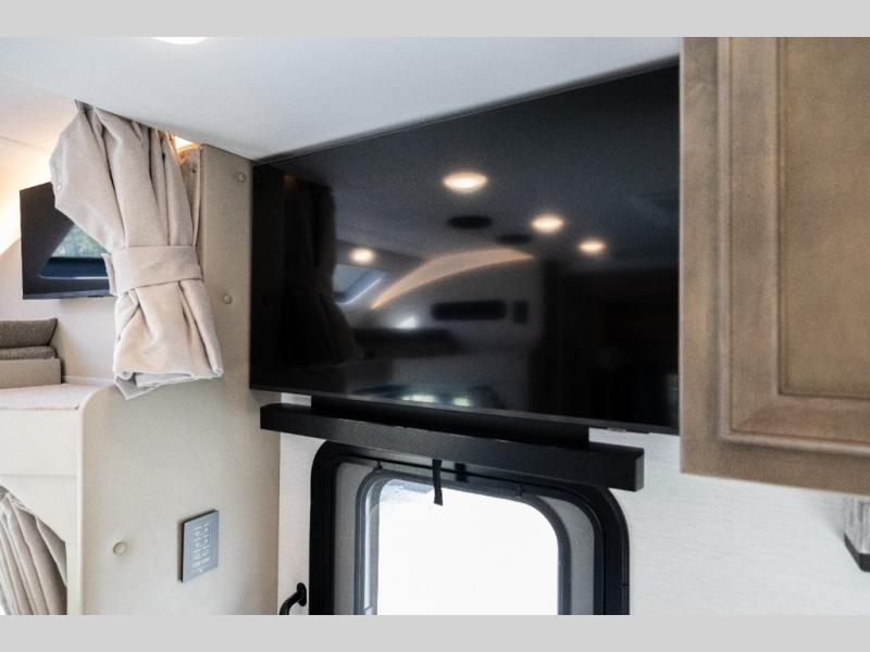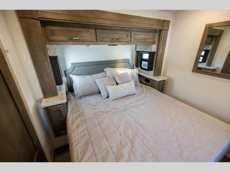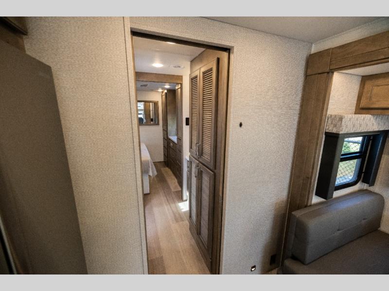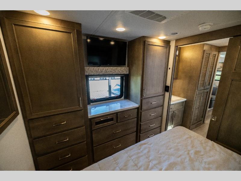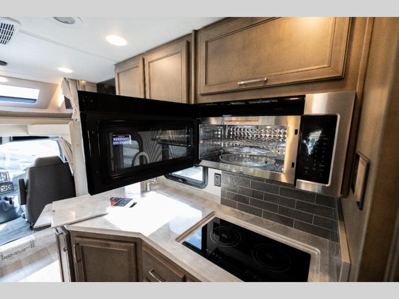 Whether you travel while you work or enjoy long-trips in your RV, this coach provides all the luxury, flexibility and comfort you could want! The main living and kitchen area is spacious with a furniture slide which includes a booth dinette and a slide-a-bed sofa which both offer sleeping space when needed for guests. The cook will love using the stainless steel convection microwave oven and the induction cooktop when making meals, and the French door residential refrigerator will hold lots of cold food. The separated bathroom allows two people to get ready at once, and the mini-king bed slide gives you more floor space in the bedroom to get to the closets and dresser. You will find a 32" 4K Smart LED TV in the bedroom to watch before bedtime, and the exterior offers a 32" LED TV to watch the big game while relaxing under the electric awning with LED lights. And you might like to add the washer/dryer option to the prepped closet to keep everything clean while on the road.