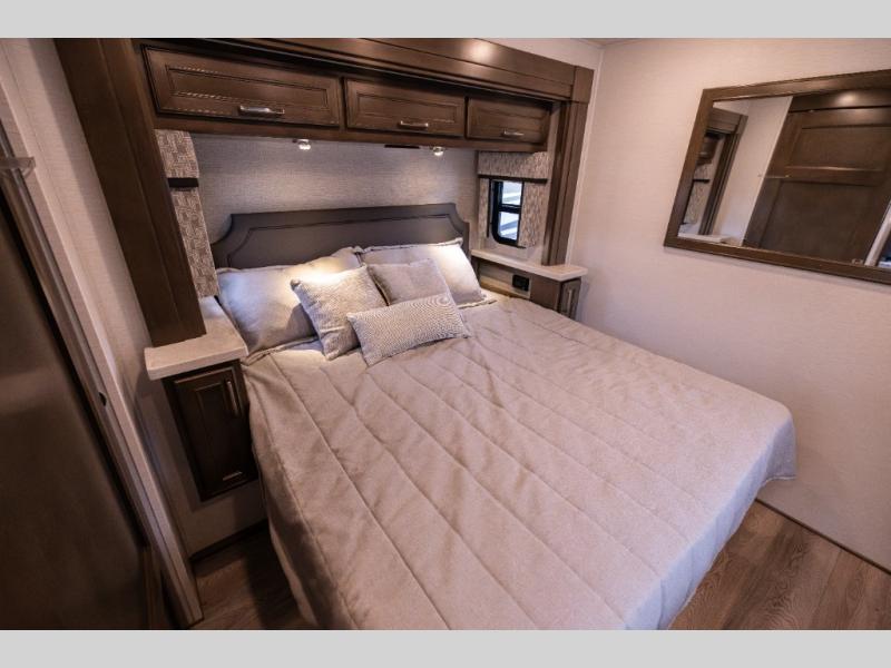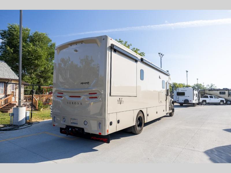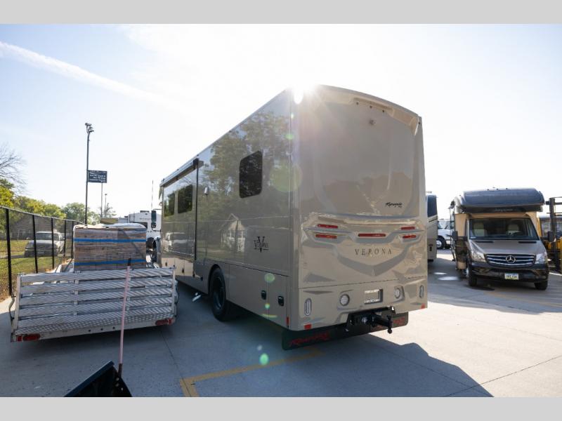 With any Renegade Verona Super C diesel motorhome, you will have confidence to explore the open road! The Cummins 360HP 3200TRV Allison transmission gives you the power and performance to travel anywhere, and the 3000-watt true sine wave inverter makes this an electric coach, plus the aluminum automotive cab construction is designed and tested for occupant protection. The interior boast about the solid hardwood cabinets including every cabinet stile and passage door are made from hardwood for true residential craftsmanship and the articulating cabinet hinges complete the package. More luxurious features include the solid surface countertops, the memory foam mattress, and the wavy patterned fiberglass shower with a glass door. Choose extreme luxury, purpose and durability; take a Verona on the road today!