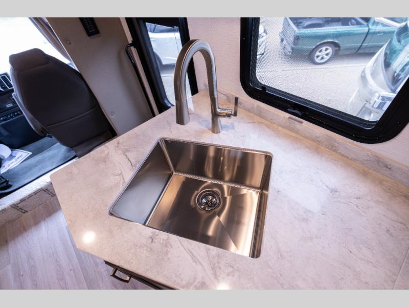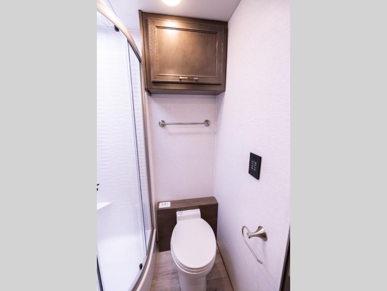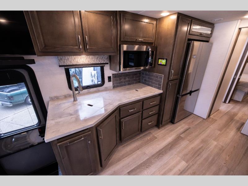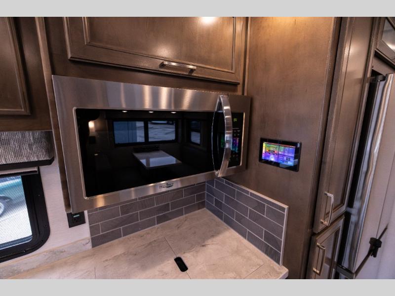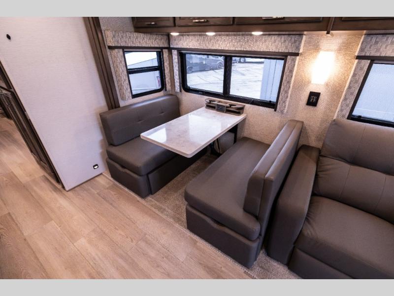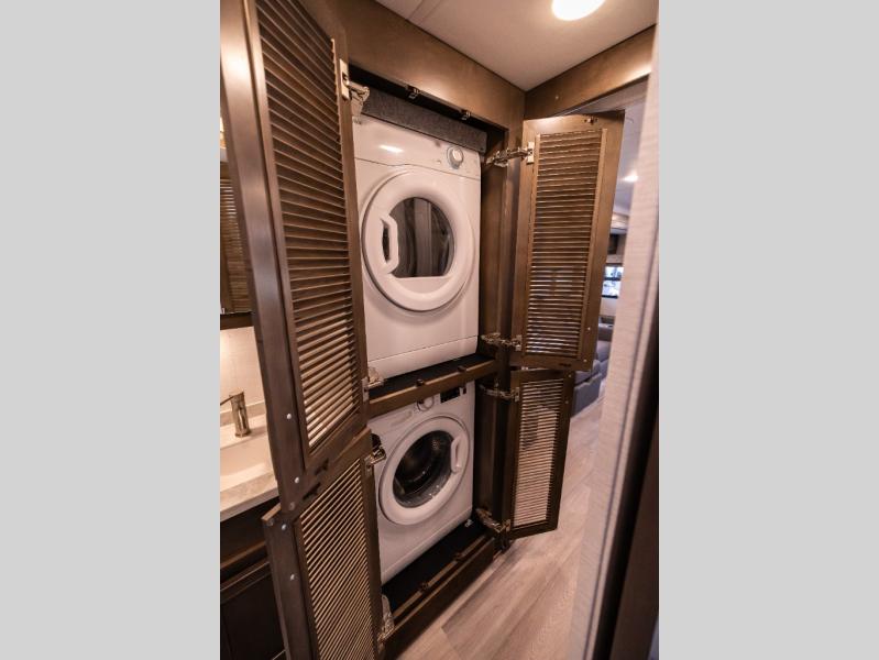 Whether you travel while you work or enjoy long-trips in your RV, this coach provides all the luxury, flexibility and comfort you could want! The main living and kitchen area is spacious with a furniture slide which includes a booth dinette and a slide-a-bed sofa which both offer sleeping space when needed for guests. The cook will love using the stainless steel convection microwave oven and the induction cooktop when making meals, and the French door residential refrigerator will hold lots of cold food. The separated bathroom allows two people to get ready at once, and the mini-king bed slide gives you more floor space in the bedroom to get to the closets and dresser. You will find a 32" 4K Smart LED TV in the bedroom to watch before bedtime, and the exterior offers a 32" LED TV to watch the big game while relaxing under the electric awning with LED lights. And you might like to add the washer/dryer option to the prepped closet to keep everything clean while on the road.