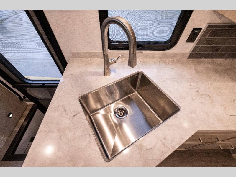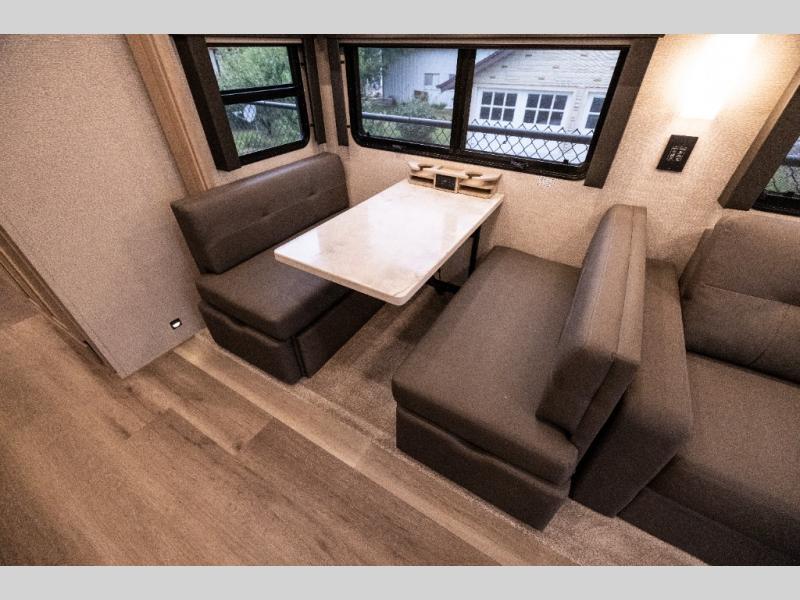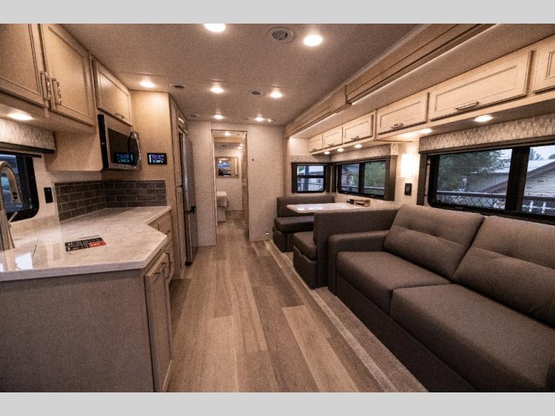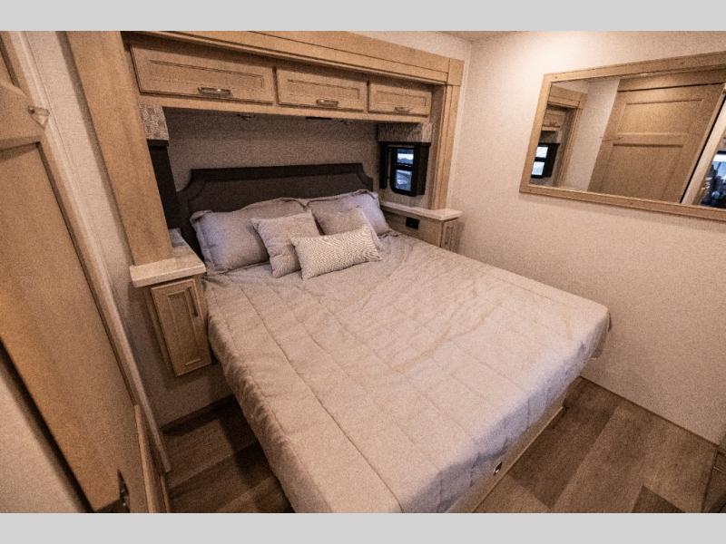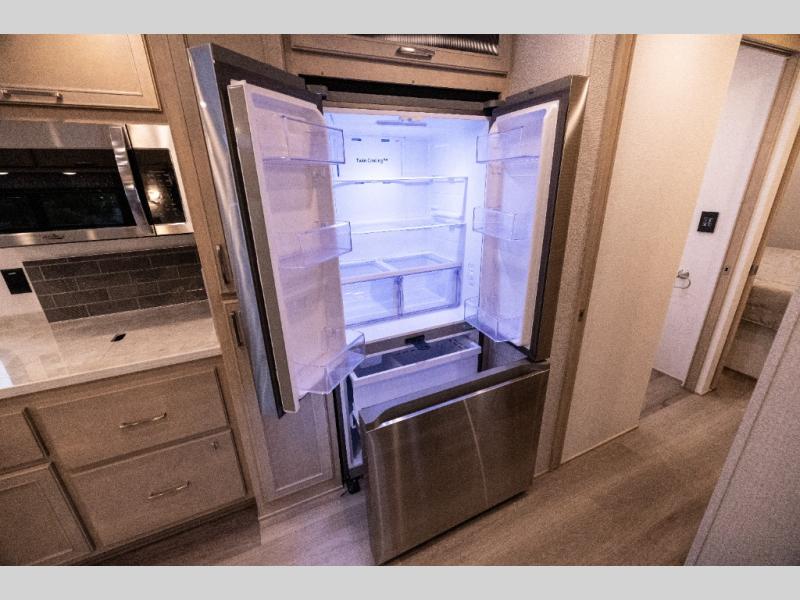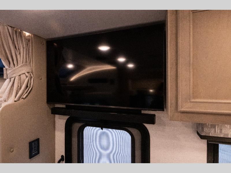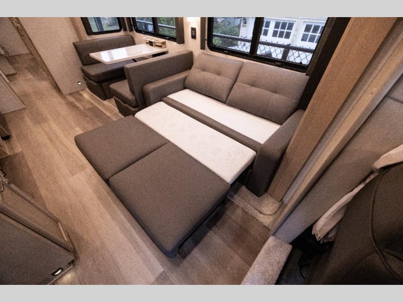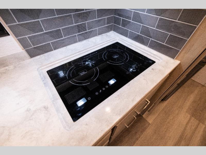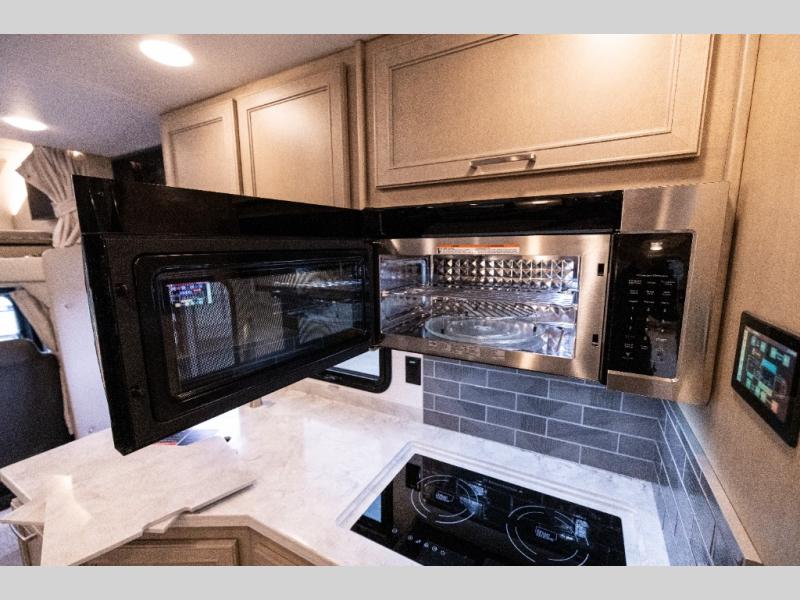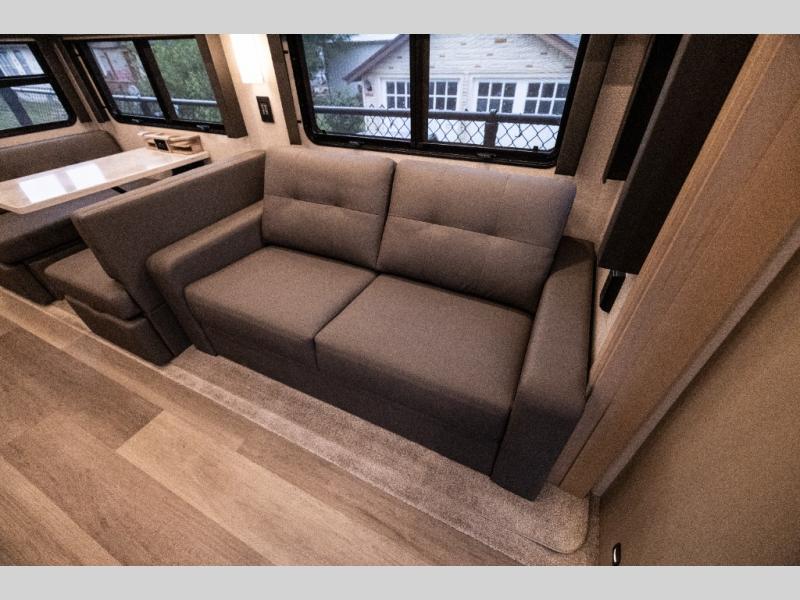 Whether you travel while you work or enjoy long-trips in your RV, this coach provides all the luxury, flexibility and comfort you could want! The main living and kitchen area is spacious with a furniture slide which includes a booth dinette and a slide-a-bed sofa which both offer sleeping space when needed for guests. The cook will love using the stainless steel convection microwave oven and the induction cooktop when making meals, and the French door residential refrigerator will hold lots of cold food. The separated bathroom allows two people to get ready at once, and the mini-king bed slide gives you more floor space in the bedroom to get to the closets and dresser. You will find a 32" 4K Smart LED TV in the bedroom to watch before bedtime, and the exterior offers a 32" LED TV to watch the big game while relaxing under the electric awning with LED lights. And you might like to add the washer/dryer option to the prepped closet to keep everything clean while on the road.