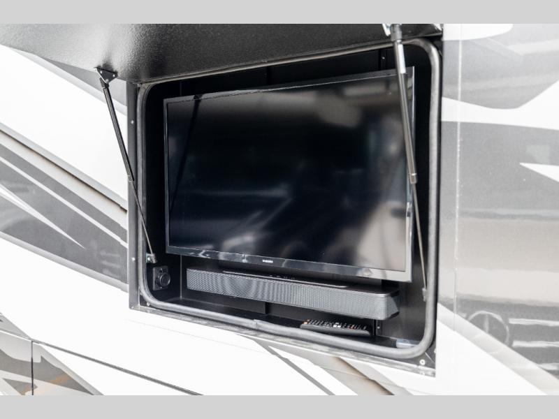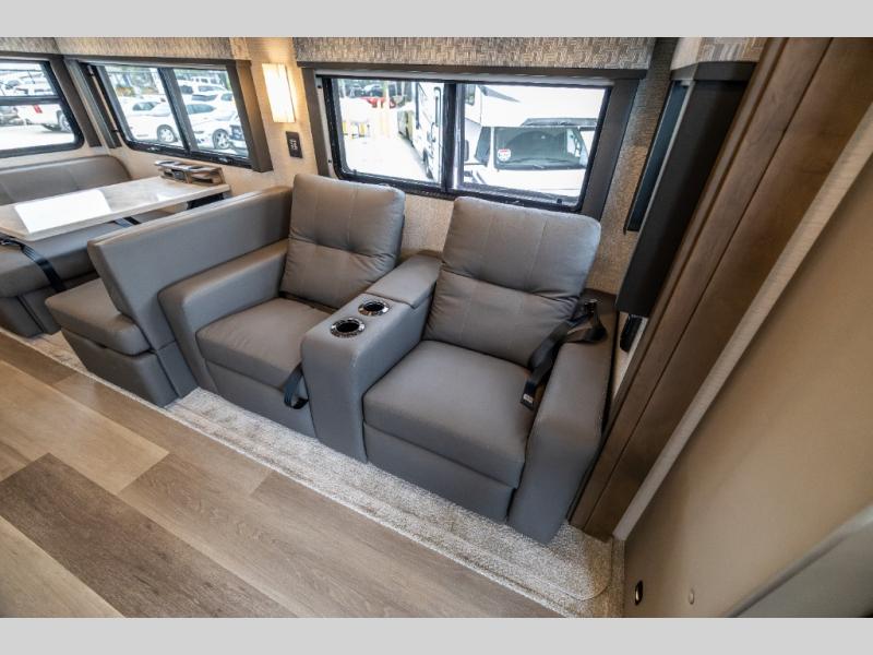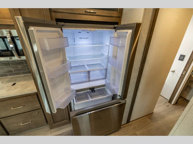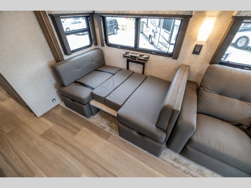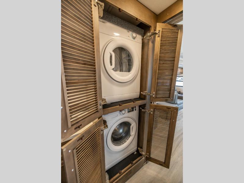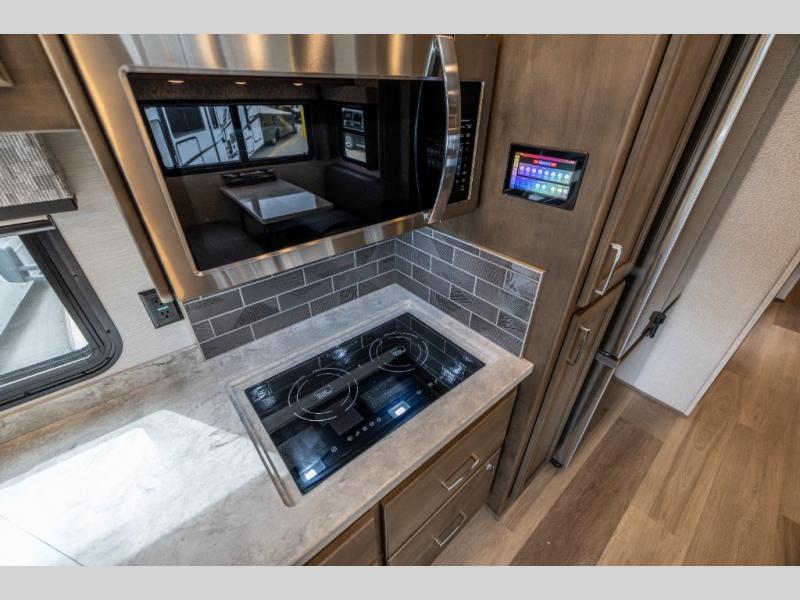Whether you travel while you work or enjoy long-trips in your RV, this coach provides all the luxury, flexibility and comfort you could want! The main living and kitchen area is spacious with a furniture slide which includes a booth dinette and a slide-a-bed sofa which both offer sleeping space when needed for guests. The cook will love using the stainless steel convection microwave oven and the induction cooktop when making meals, and the French door residential refrigerator will hold lots of cold food. The separated bathroom allows two people to get ready at once, and the mini-king bed slide gives you more floor space in the bedroom to get to the closets and dresser. You will find a 32" 4K Smart LED TV in the bedroom to watch before bedtime, and the exterior offers a 32" LED TV to watch the big game while relaxing under the electric awning with LED lights. And you might like to add the washer/dryer option to the prepped closet to keep everything clean while on the road.