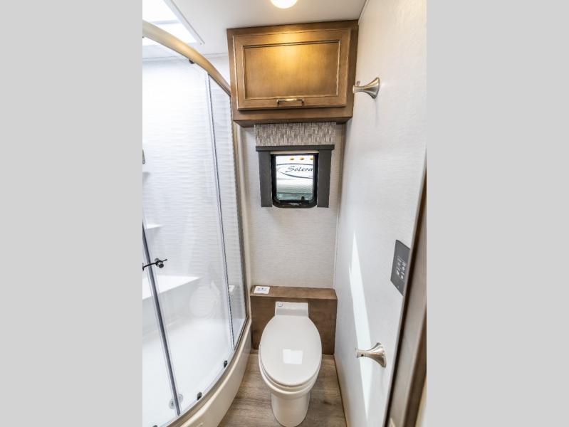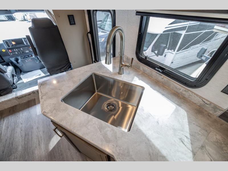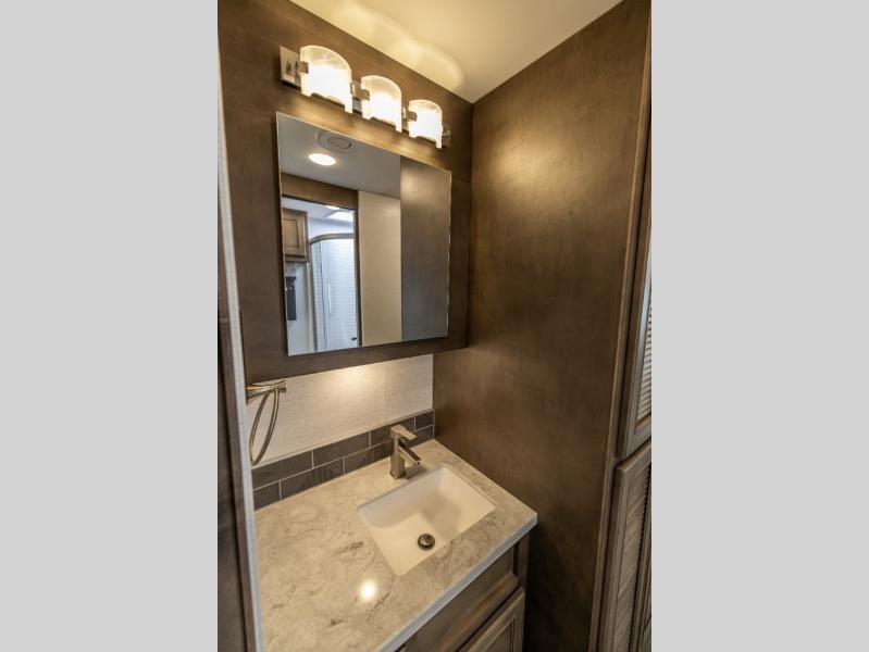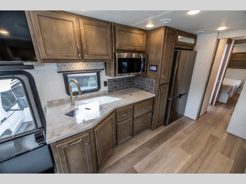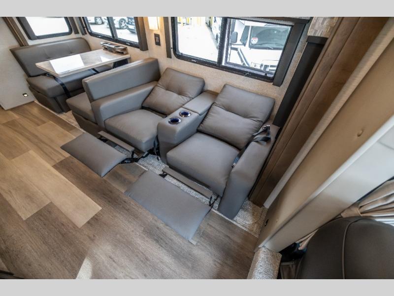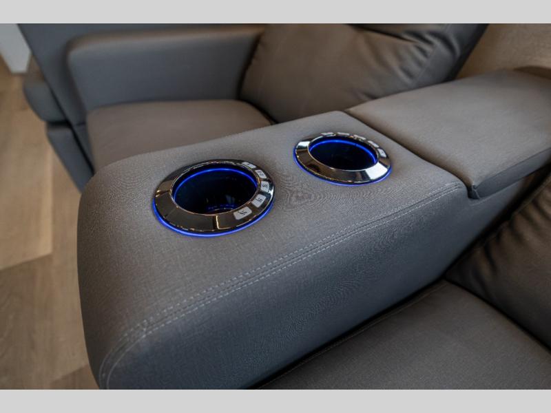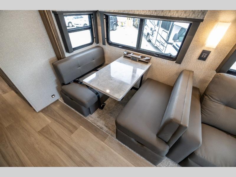 Whether you travel while you work or enjoy long-trips in your RV, this coach provides all the luxury, flexibility and comfort you could want! The main living and kitchen area is spacious with a furniture slide which includes a booth dinette and a slide-a-bed sofa which both offer sleeping space when needed for guests. The cook will love using the stainless steel convection microwave oven and the induction cooktop when making meals, and the French door residential refrigerator will hold lots of cold food. The separated bathroom allows two people to get ready at once, and the mini-king bed slide gives you more floor space in the bedroom to get to the closets and dresser. You will find a 32" 4K Smart LED TV in the bedroom to watch before bedtime, and the exterior offers a 32" LED TV to watch the big game while relaxing under the electric awning with LED lights. And you might like to add the washer/dryer option to the prepped closet to keep everything clean while on the road.