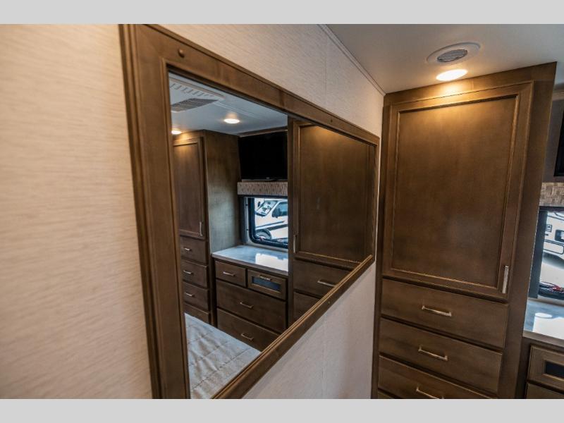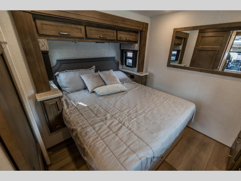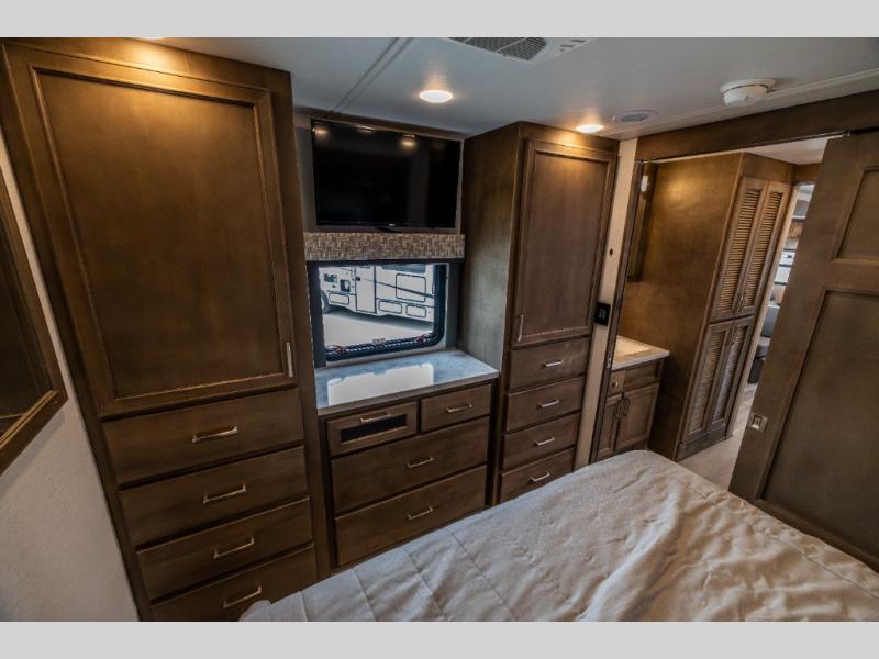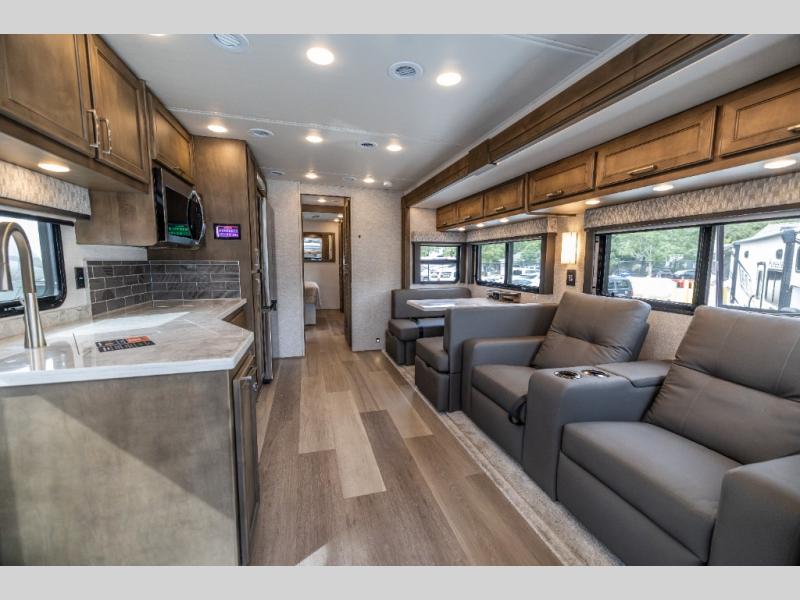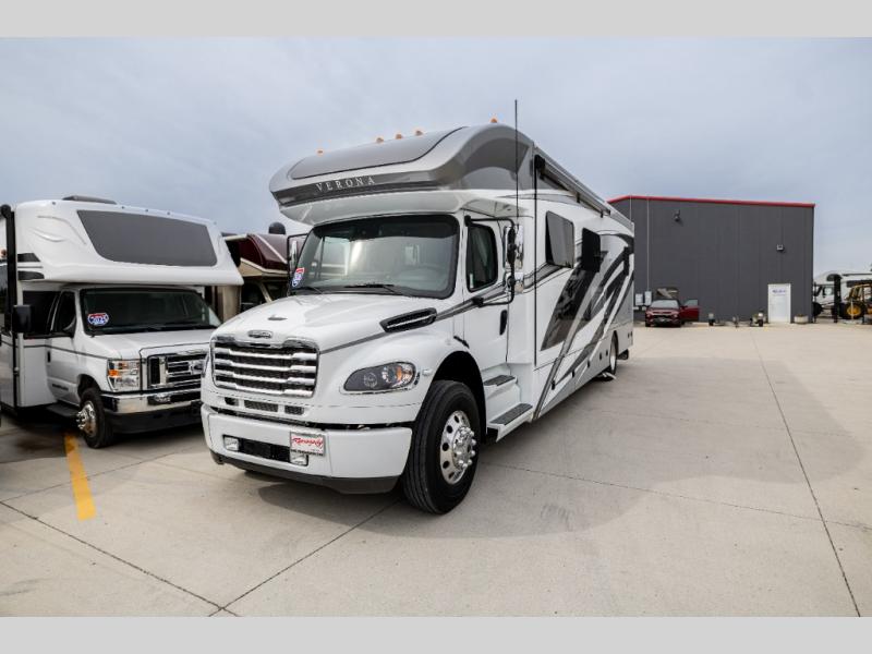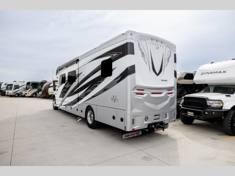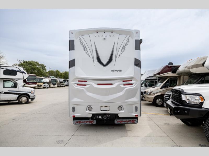 With any Renegade Verona Super C diesel motorhome, you will have confidence to explore the open road! The Cummins 360HP 3200TRV Allison transmission gives you the power and performance to travel anywhere, and the 3000-watt true sine wave inverter makes this an electric coach, plus the aluminum automotive cab construction is designed and tested for occupant protection. The interior boast about the solid hardwood cabinets including every cabinet stile and passage door are made from hardwood for true residential craftsmanship and the articulating cabinet hinges complete the package. More luxurious features include the solid surface countertops, the memory foam mattress, and the wavy patterned fiberglass shower with a glass door. Choose extreme luxury, purpose and durability; take a Verona on the road today!