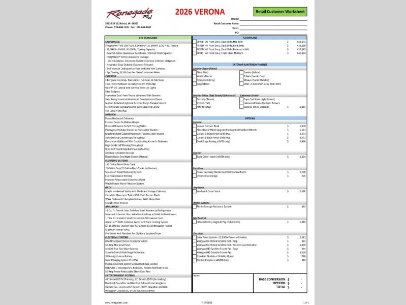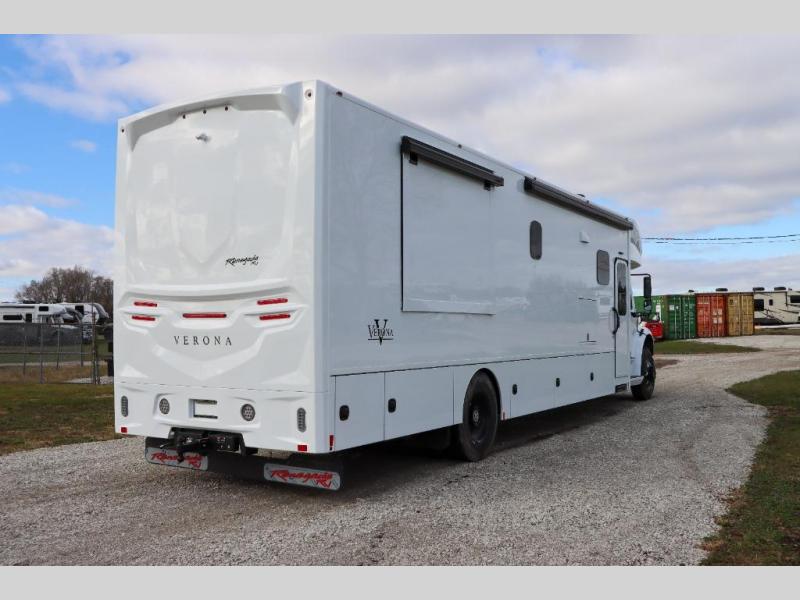 With any Renegade Verona Super C diesel motorhome, you will have confidence to explore the open road! The Cummins 360HP 3200TRV Allison transmission gives you the power and performance to travel anywhere, and the 3000-watt true sine wave inverter makes this an electric coach, plus the aluminum automotive cab construction is designed and tested for occupant protection. The interior boast about the solid hardwood cabinets including every cabinet stile and passage door are made from hardwood for true residential craftsmanship and the articulating cabinet hinges complete the package. More luxurious features include the solid surface countertops, the memory foam mattress, and the wavy patterned fiberglass shower with a glass door. Choose extreme luxury, purpose and durability; take a Verona on the road today!