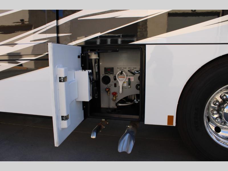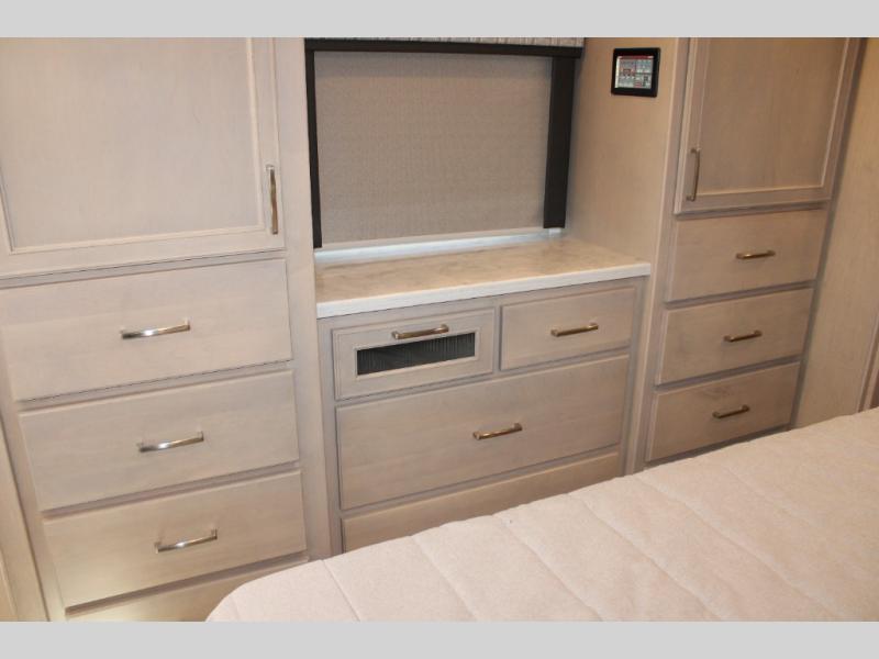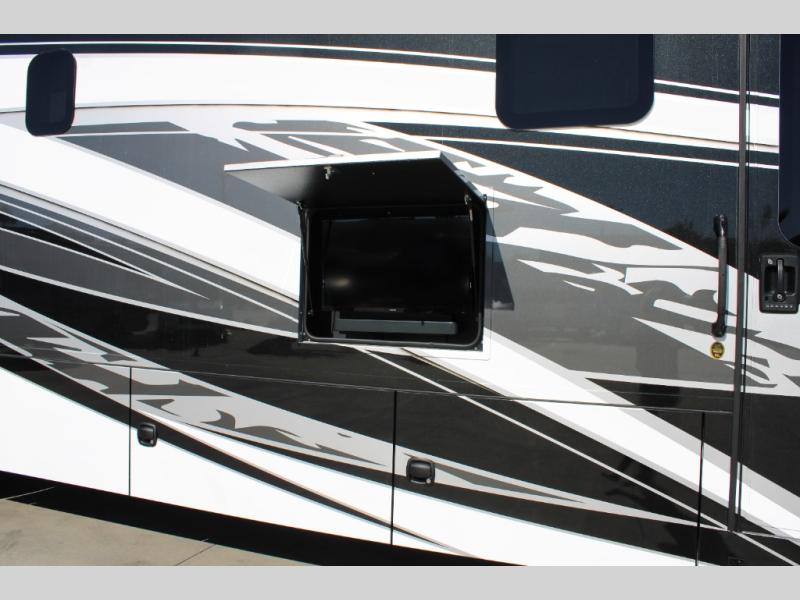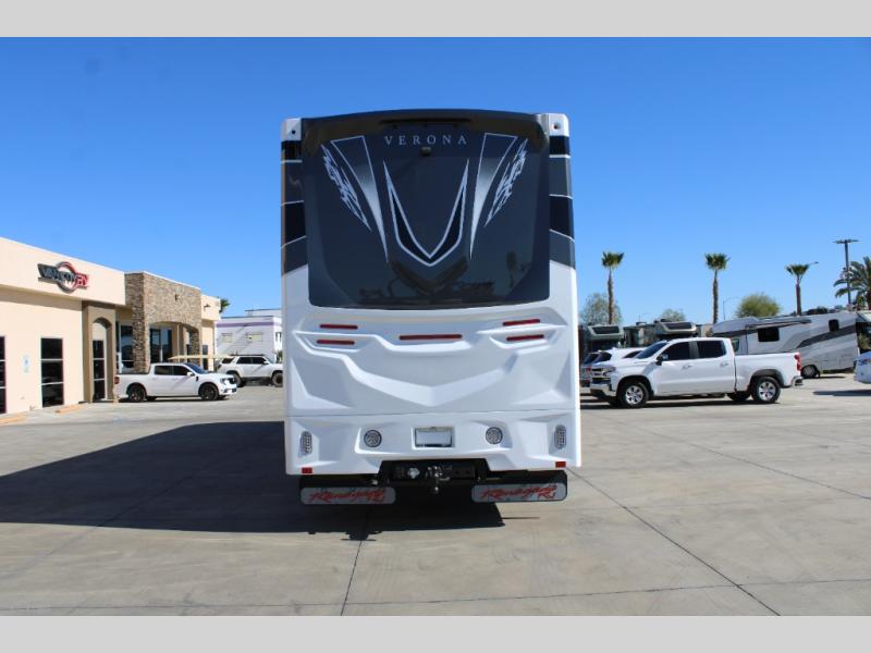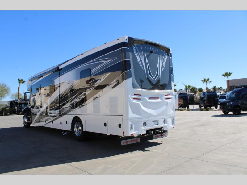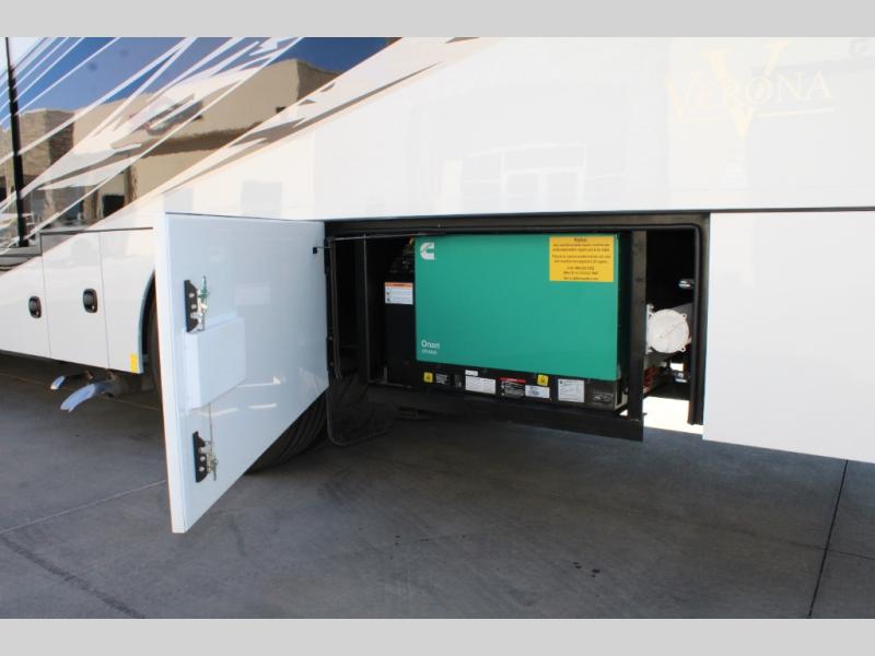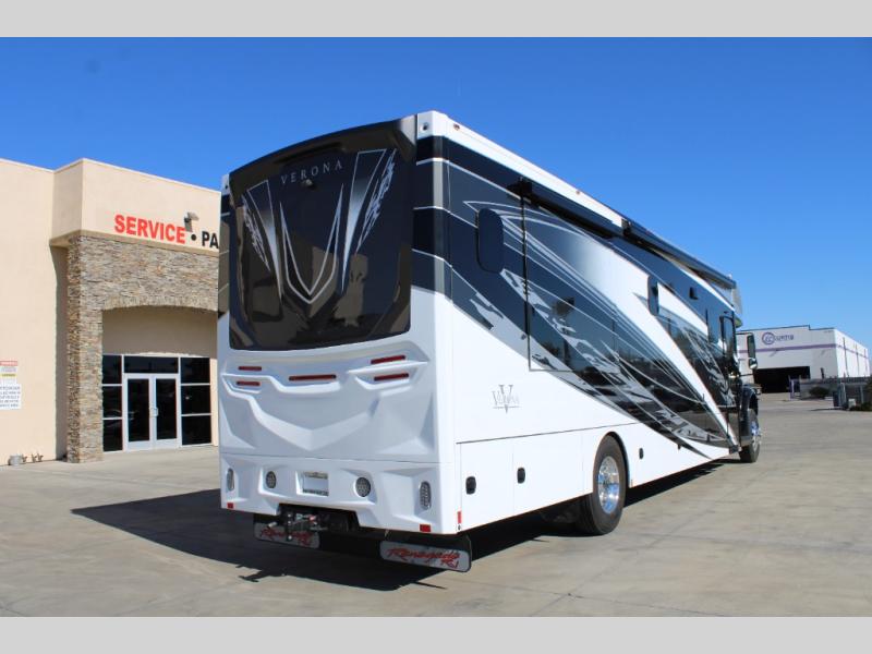 With any Renegade Verona Super C diesel motorhome, you will have confidence to explore the open road! The Cummins 360HP 3200TRV Allison transmission gives you the power and performance to travel anywhere, and the 3000-watt true sine wave inverter makes this an electric coach, plus the aluminum automotive cab construction is designed and tested for occupant protection. The interior boast about the solid hardwood cabinets including every cabinet stile and passage door are made from hardwood for true residential craftsmanship and the articulating cabinet hinges complete the package. More luxurious features include the solid surface countertops, the memory foam mattress, and the wavy patterned fiberglass shower with a glass door. Choose extreme luxury, purpose and durability; take a Verona on the road today!