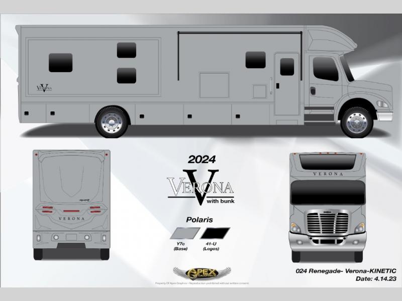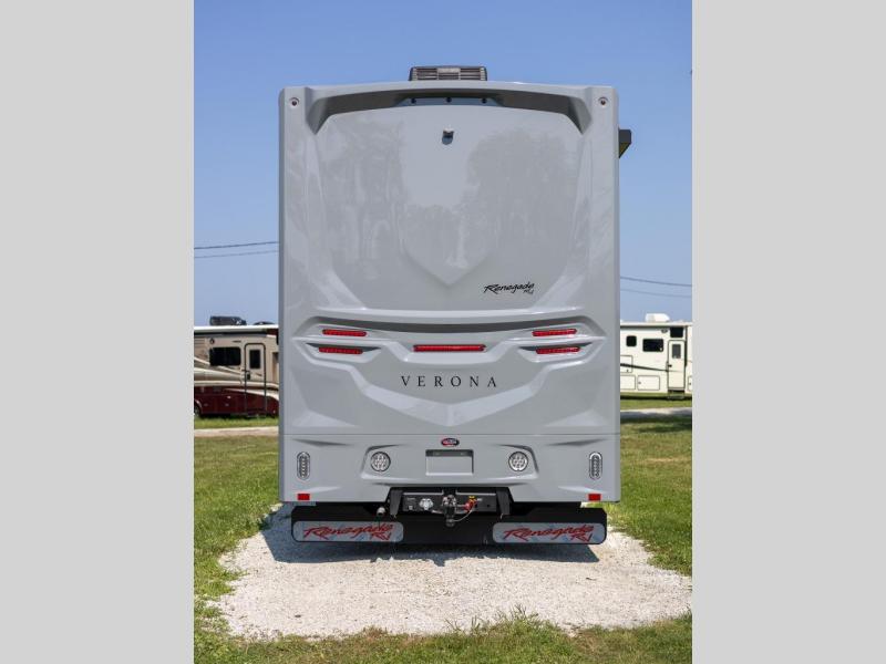 With any Renegade Verona Super C diesel motorhome, you will have confidence to explore the open road! The Cummins 360HP 3200TRV Allison transmission gives you the power and performance to travel anywhere, and the 3000-watt true sine wave inverter makes this an electric coach, plus the aluminum automotive cab construction is designed and tested for occupant protection. The interior boast about the solid hardwood cabinets including every cabinet stile and passage door are made from hardwood for true residential craftsmanship and the articulating cabinet hinges complete the package. More luxurious features include the solid surface countertops, the memory foam mattress, and the wavy patterned fiberglass shower with a glass door. Choose extreme luxury, purpose and durability; take a Verona on the road today!