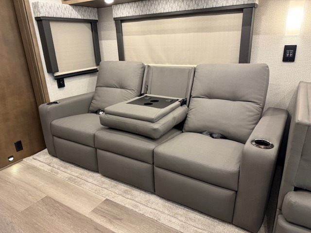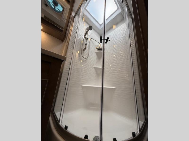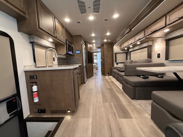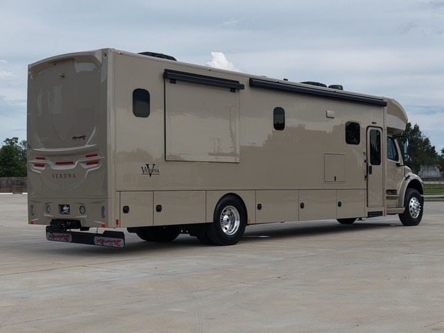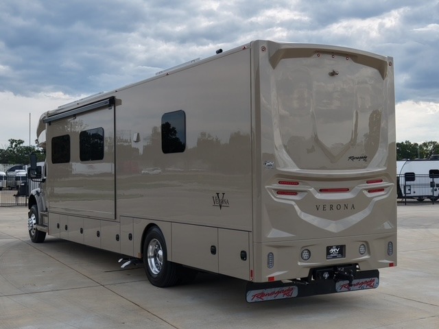 With any Renegade Verona Super C diesel motorhome, you will have confidence to explore the open road! The Cummins 360HP 3200TRV Allison transmission gives you the power and performance to travel anywhere, and the 3000-watt true sine wave inverter makes this an electric coach, plus the aluminum automotive cab construction is designed and tested for occupant protection. The interior boast about the solid hardwood cabinets including every cabinet stile and passage door are made from hardwood for true residential craftsmanship and the articulating cabinet hinges complete the package. More luxurious features include the solid surface countertops, the memory foam mattress, and the wavy patterned fiberglass shower with a glass door. Choose extreme luxury, purpose and durability; take a Verona on the road today!