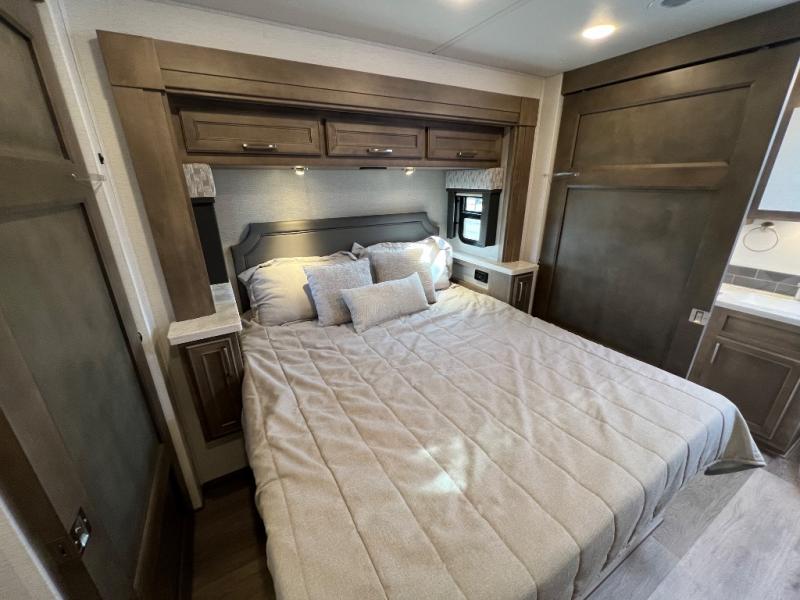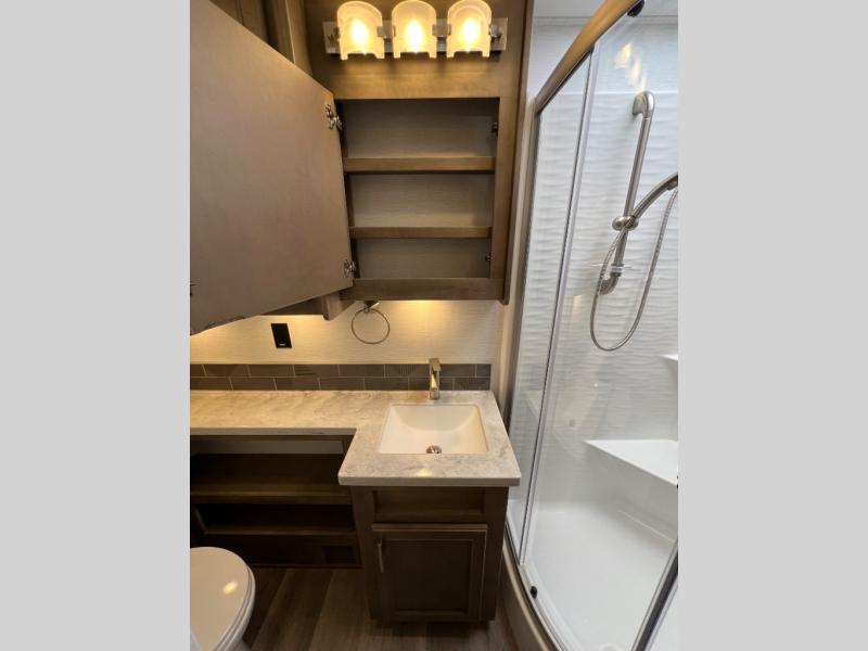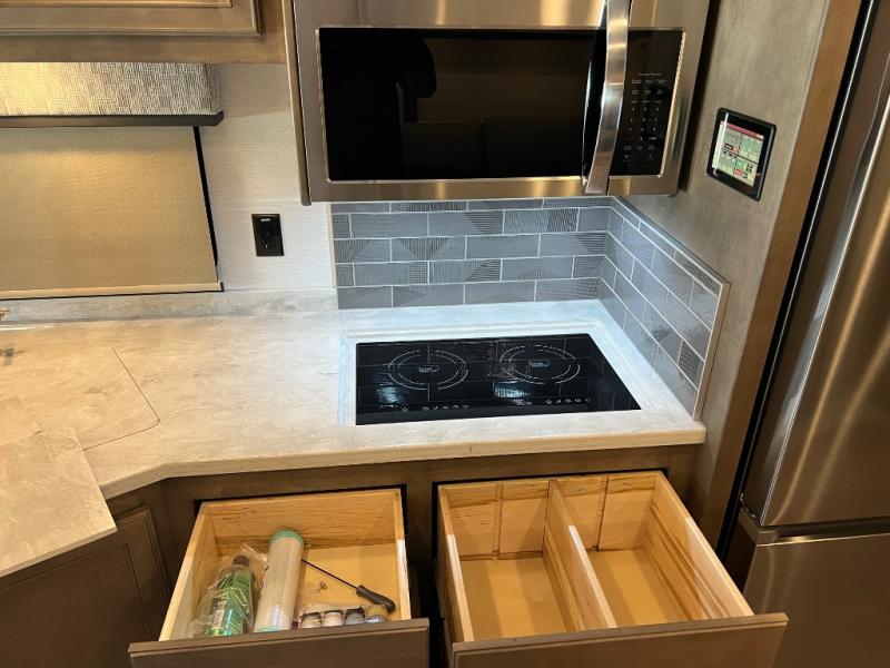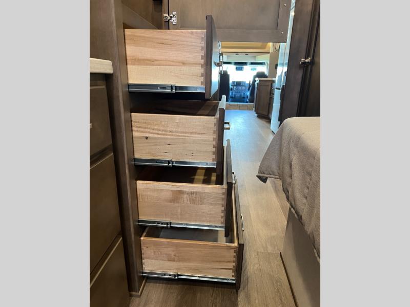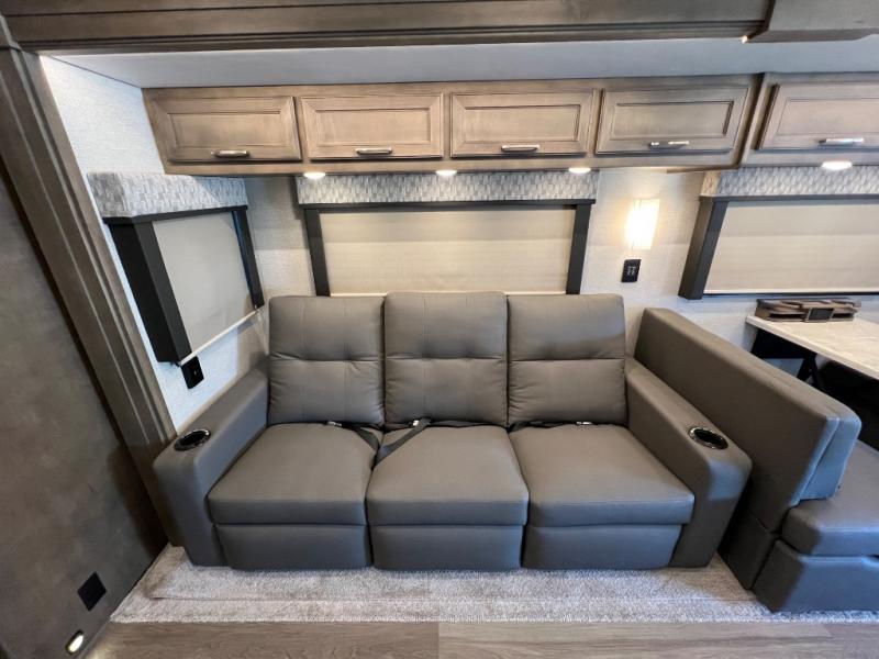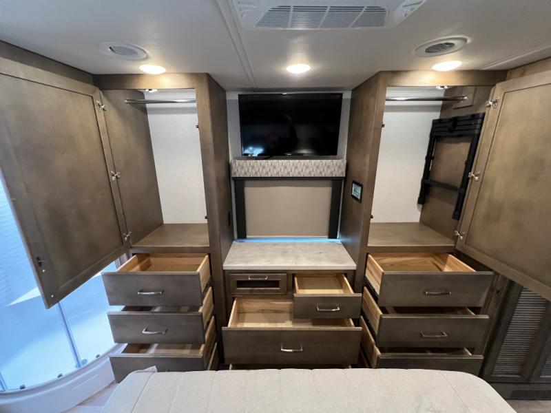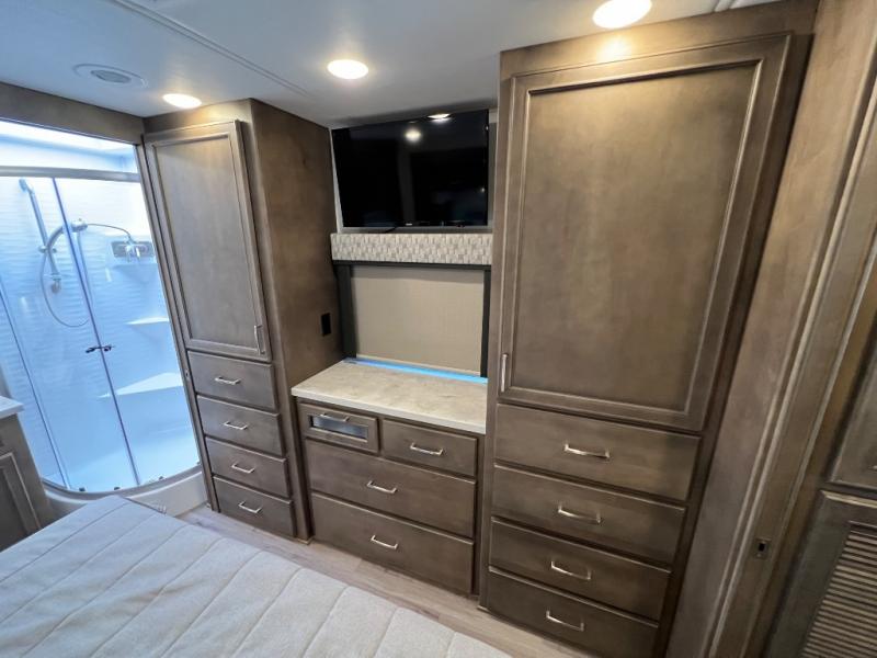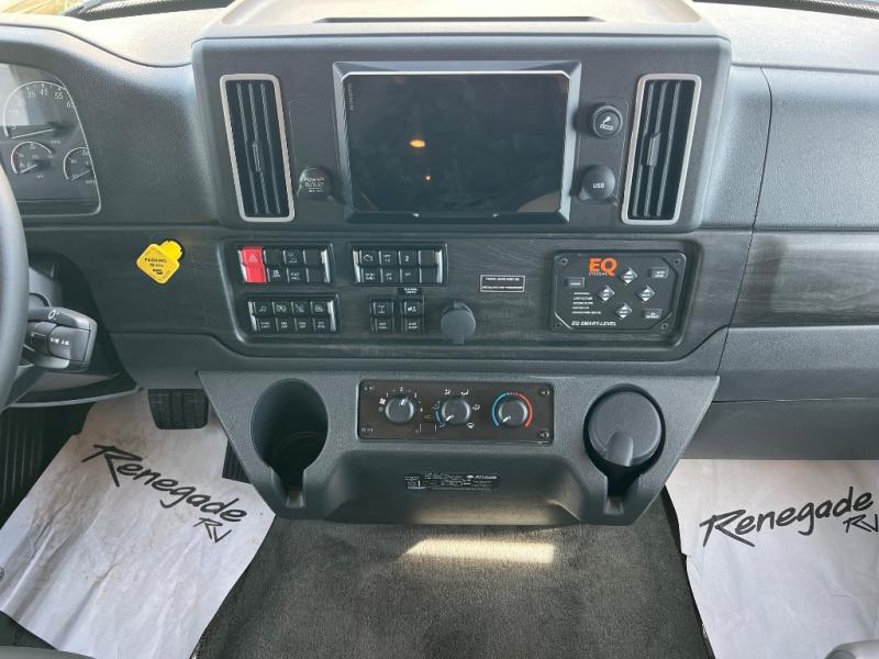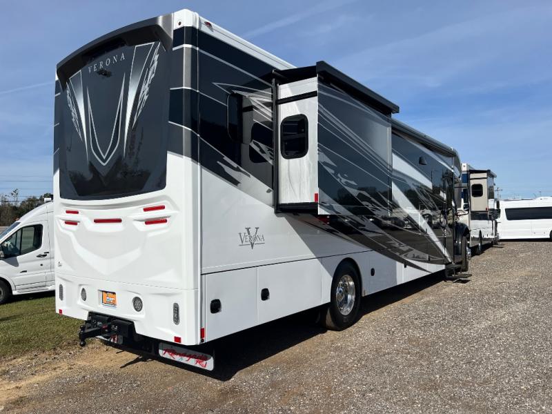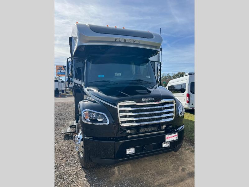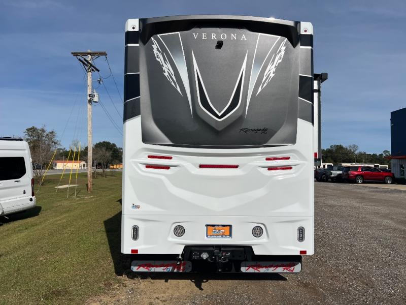 With any Renegade Verona Super C diesel motorhome, you will have confidence to explore the open road! The Cummins 360HP 3200TRV Allison transmission gives you the power and performance to travel anywhere, and the 3000-watt true sine wave inverter makes this an electric coach, plus the aluminum automotive cab construction is designed and tested for occupant protection. The interior boast about the solid hardwood cabinets including every cabinet stile and passage door are made from hardwood for true residential craftsmanship and the articulating cabinet hinges complete the package. More luxurious features include the solid surface countertops, the memory foam mattress, and the wavy patterned fiberglass shower with a glass door. Choose extreme luxury, purpose and durability; take a Verona on the road today!