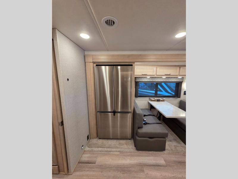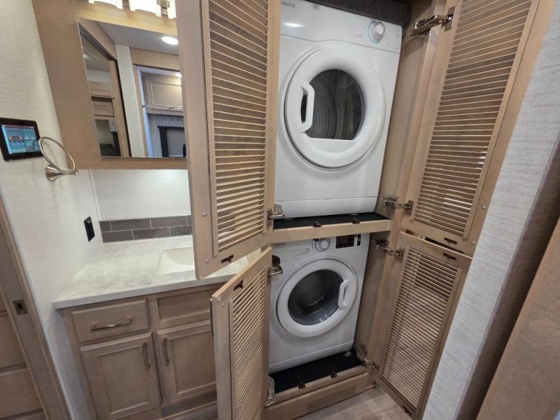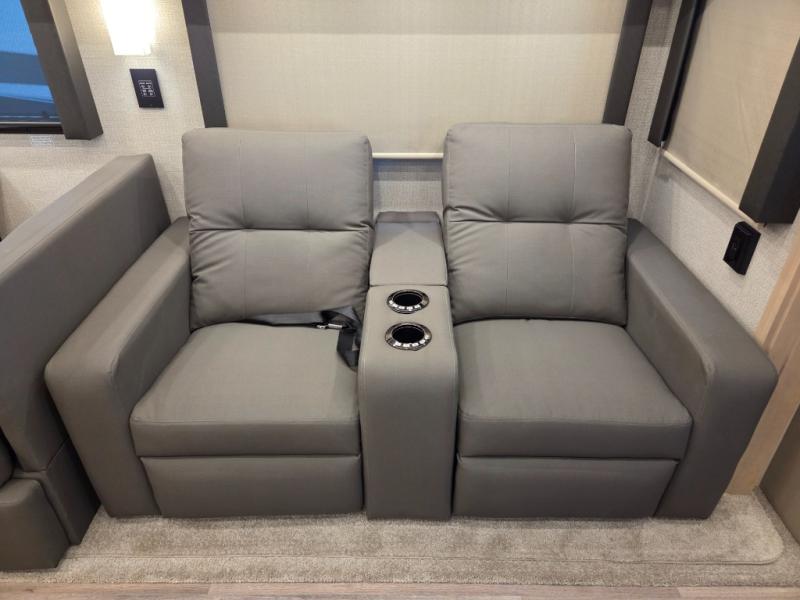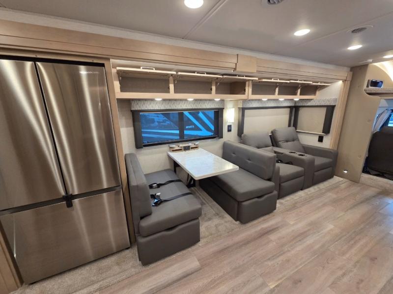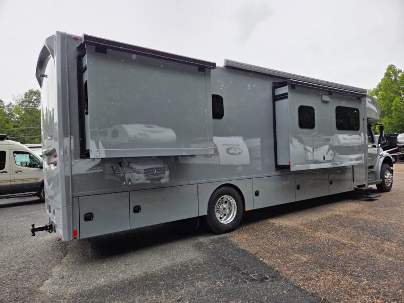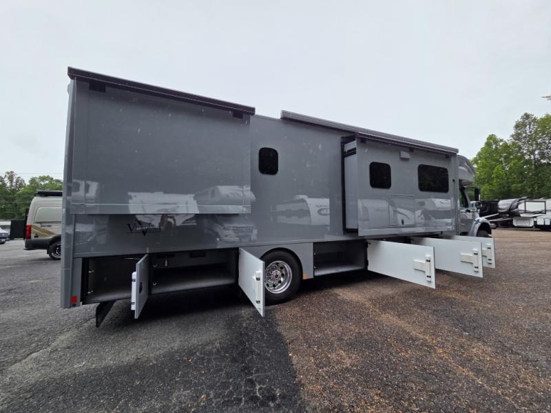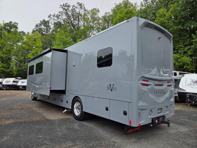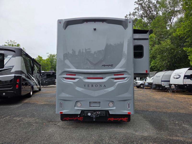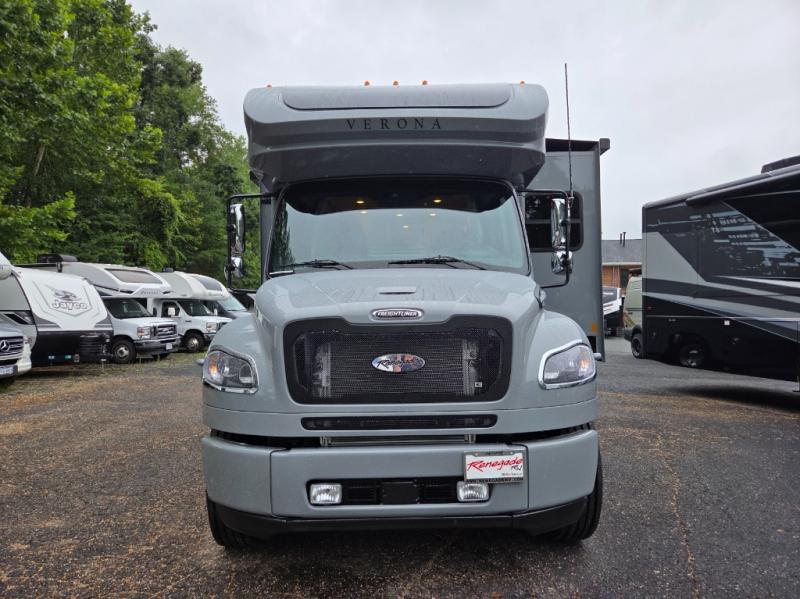 The 2026 Renegade Verona 40VTS is a Super C diesel motorhome built on a Freightliner M2-106 chassis, powered by a 360 HP Cummins L9 engine, and features a triple-slide, luxury-oriented design with sleeping for up to 6. Key amenities include a mini-king bed, a residential-style kitchen with an 18 cu. ft. refrigerator and induction cooktop, solid surface countertops, and hardwood cabinetry. The model is equipped with high-end features like an 8KW Onan generator, lithium batteries, a Garmin infotainment system, and a premium exterior with a two-stage awning.
