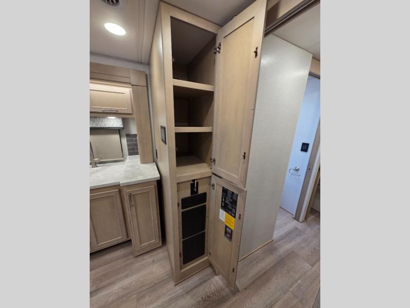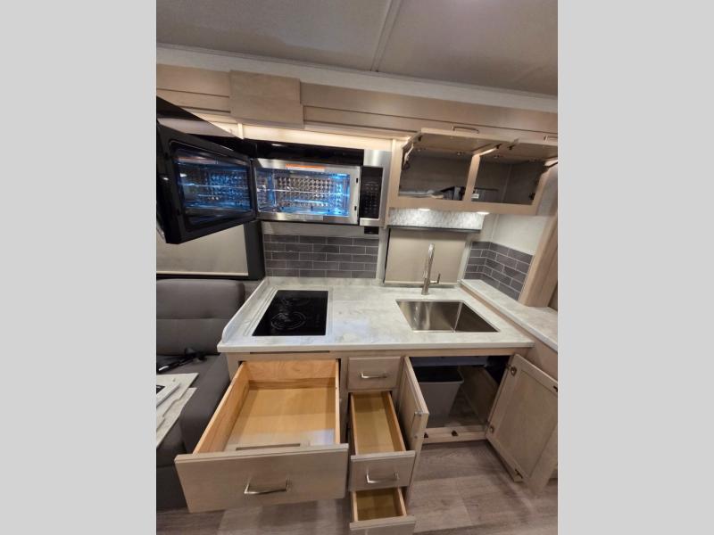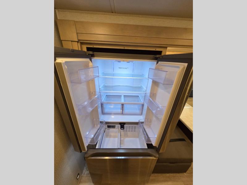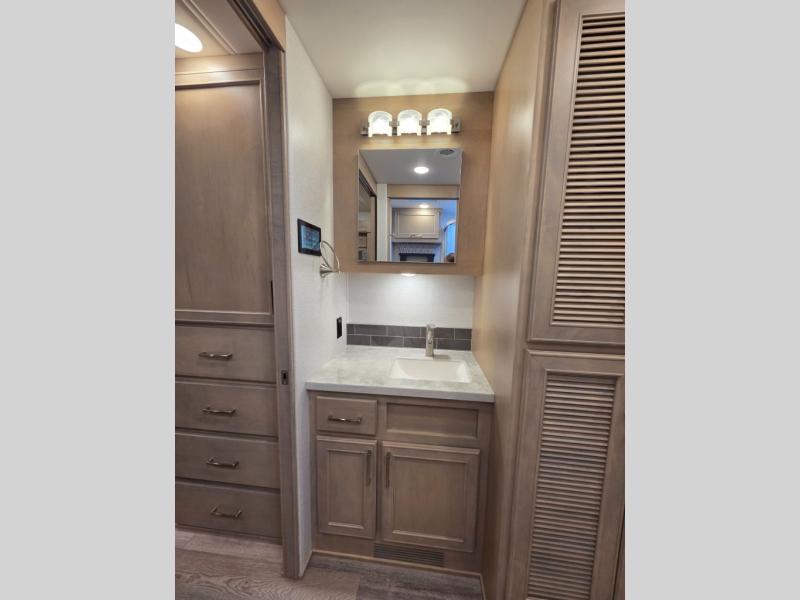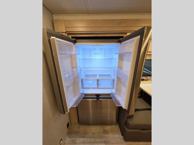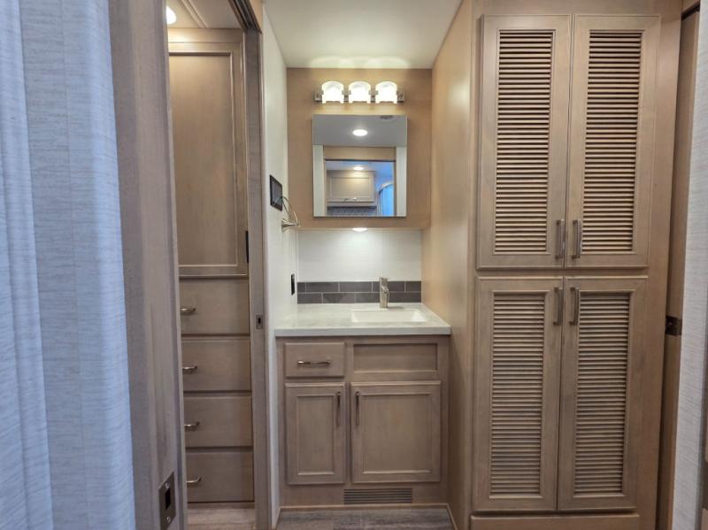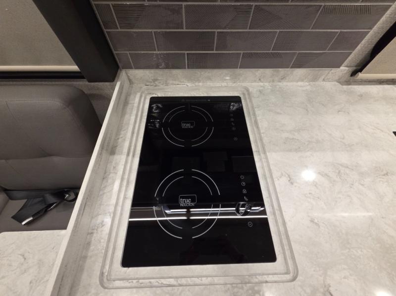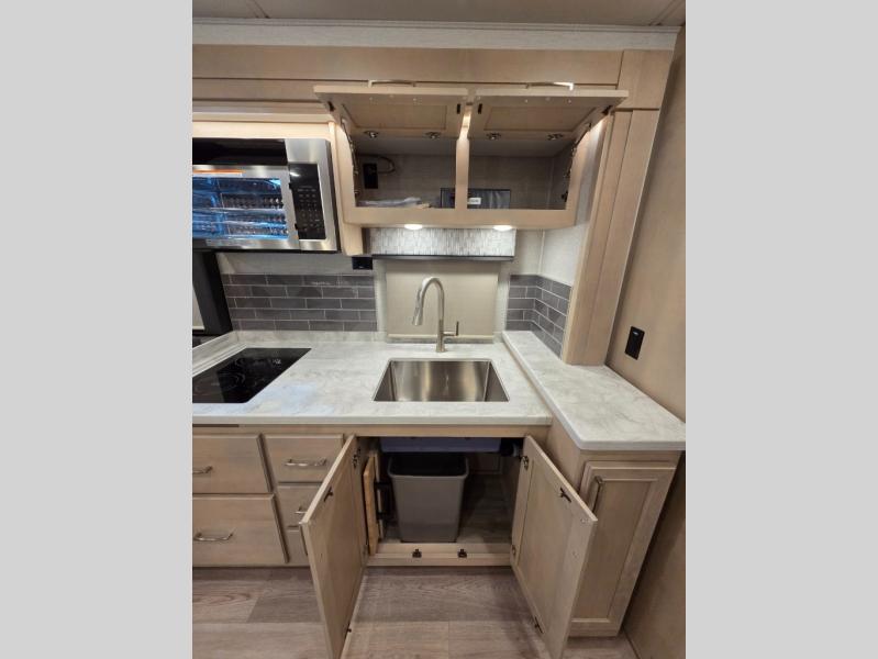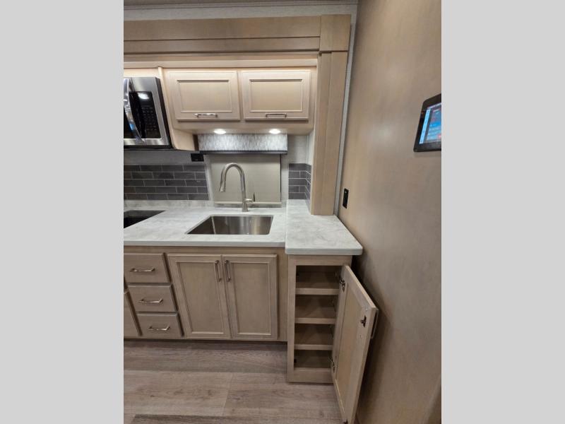 The 2026 Renegade Verona 40VTS is a Super C diesel motorhome built on a Freightliner M2-106 chassis, powered by a 360 HP Cummins L9 engine, and features a triple-slide, luxury-oriented design with sleeping for up to 6. Key amenities include a mini-king bed, a residential-style kitchen with an 18 cu. ft. refrigerator and induction cooktop, solid surface countertops, and hardwood cabinetry. The model is equipped with high-end features like an 8KW Onan generator, lithium batteries, a Garmin infotainment system, and a premium exterior with a two-stage awning.