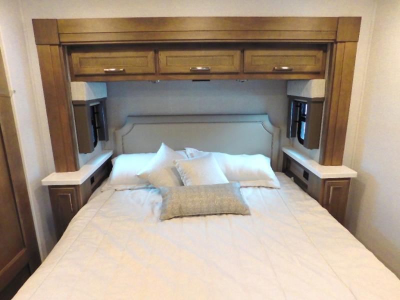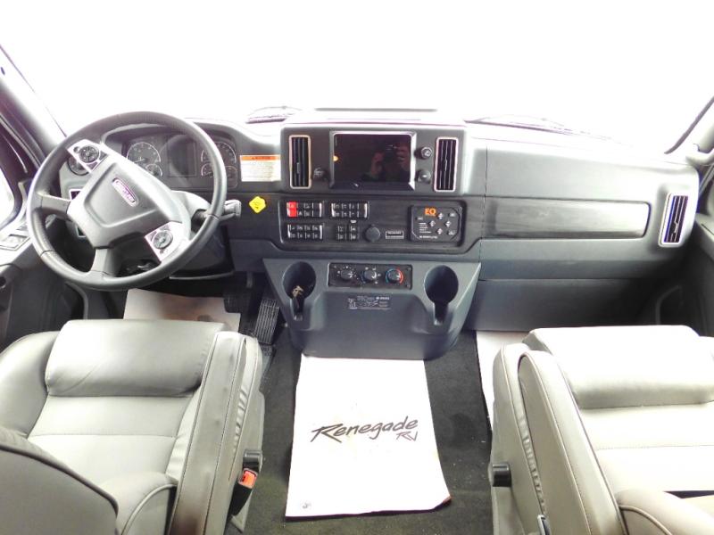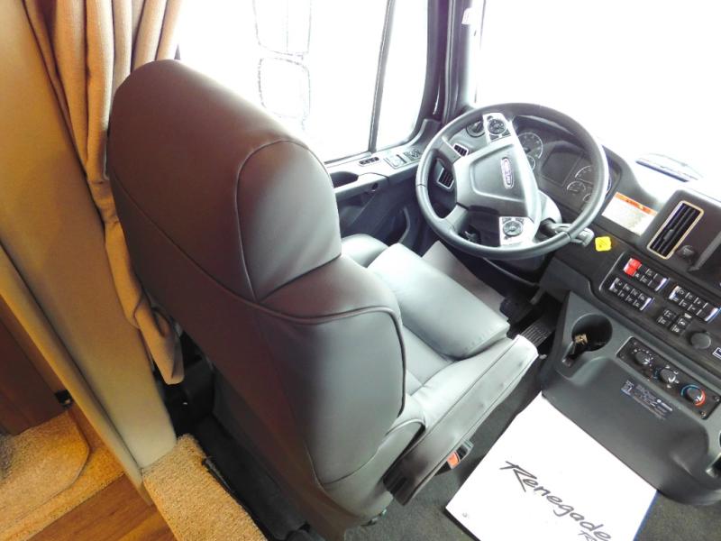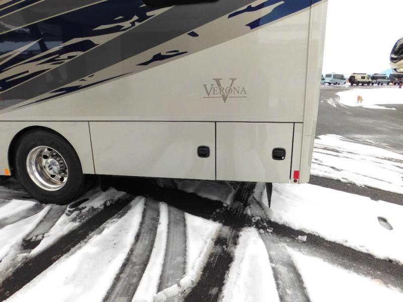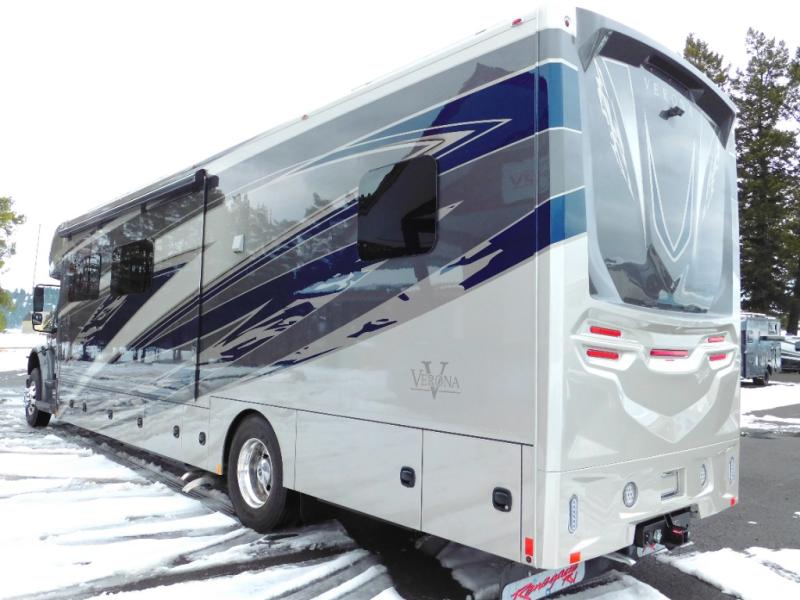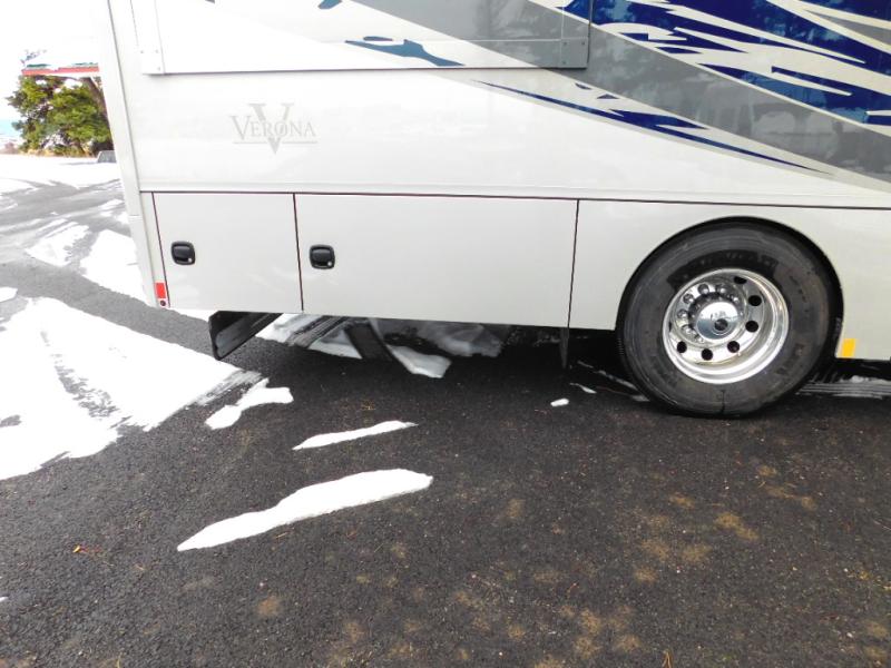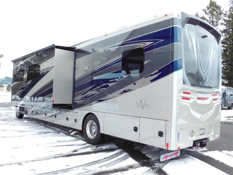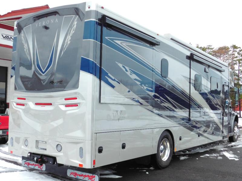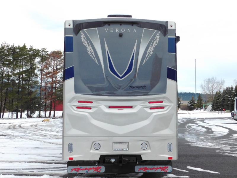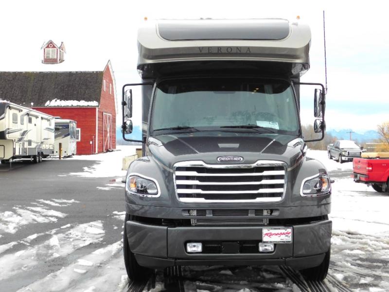 With any Renegade Verona Super C diesel motorhome, you will have confidence to explore the open road! The Cummins 360HP 3200TRV Allison transmission gives you the power and performance to travel anywhere, and the 3000-watt true sine wave inverter makes this an electric coach, plus the aluminum automotive cab construction is designed and tested for occupant protection. The interior boast about the solid hardwood cabinets including every cabinet stile and passage door are made from hardwood for true residential craftsmanship and the articulating cabinet hinges complete the package. More luxurious features include the solid surface countertops, the memory foam mattress, and the wavy patterned fiberglass shower with a glass door. Choose extreme luxury, purpose and durability; take a Verona on the road today!