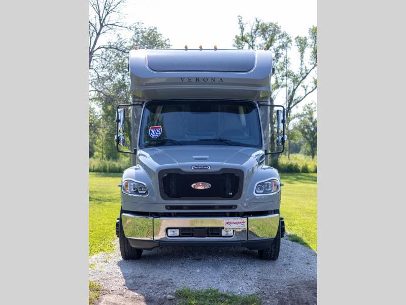 With any Renegade Verona Super C diesel motorhome, you will have confidence to explore the open road! The Cummins 360HP 3200TRV Allison transmission gives you the power and performance to travel anywhere, and the 3000-watt true sine wave inverter makes this an electric coach, plus the aluminum automotive cab construction is designed and tested for occupant protection. The interior boast about the solid hardwood cabinets including every cabinet stile and passage door are made from hardwood for true residential craftsmanship and the articulating cabinet hinges complete the package. More luxurious features include the solid surface countertops, the memory foam mattress, and the wavy patterned fiberglass shower with a glass door. Choose extreme luxury, purpose and durability; take a Verona on the road today!
