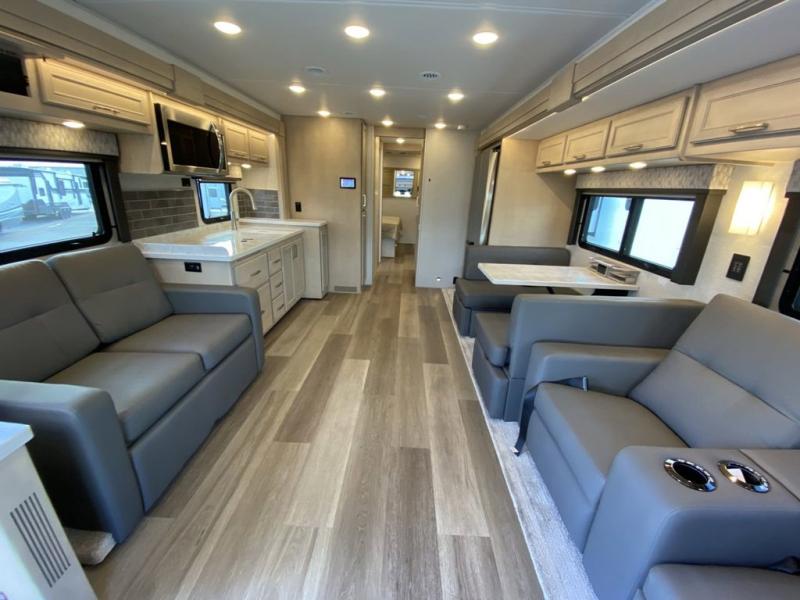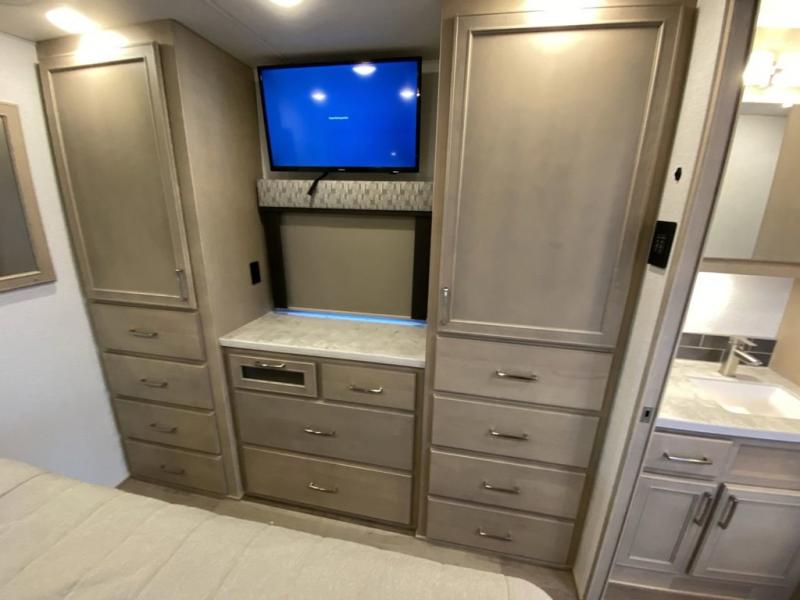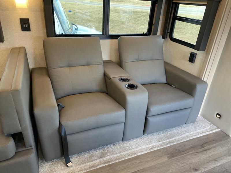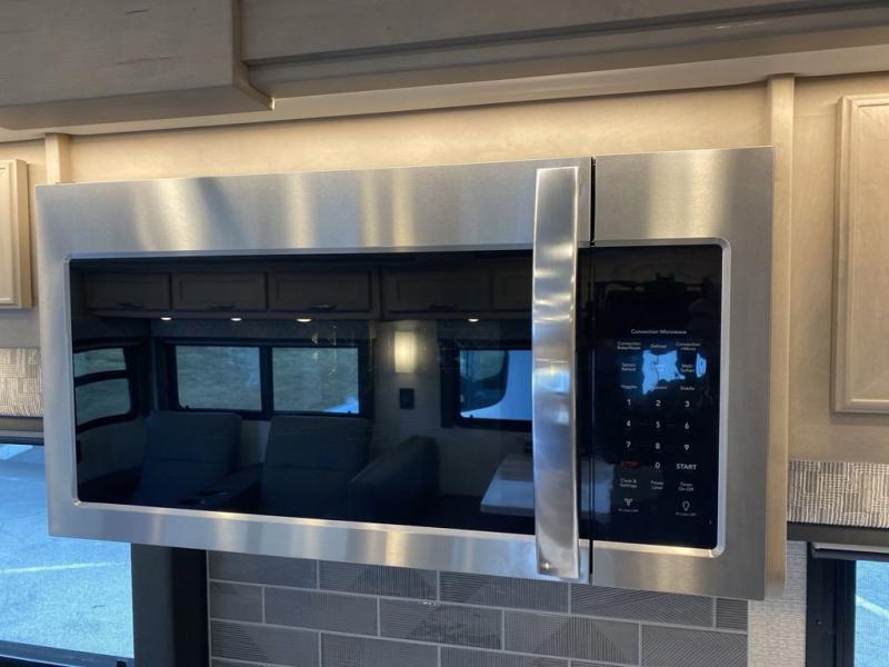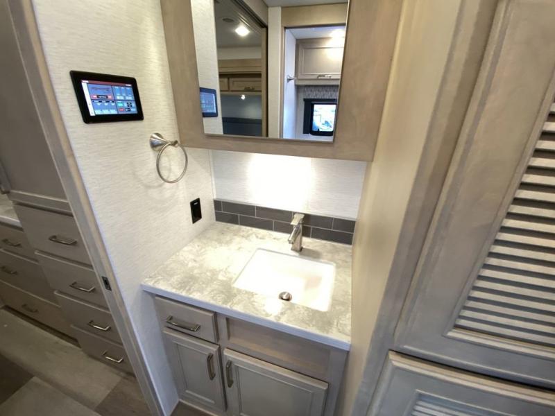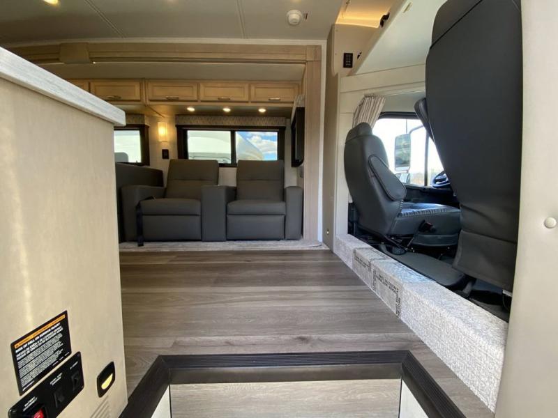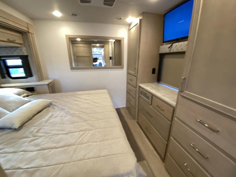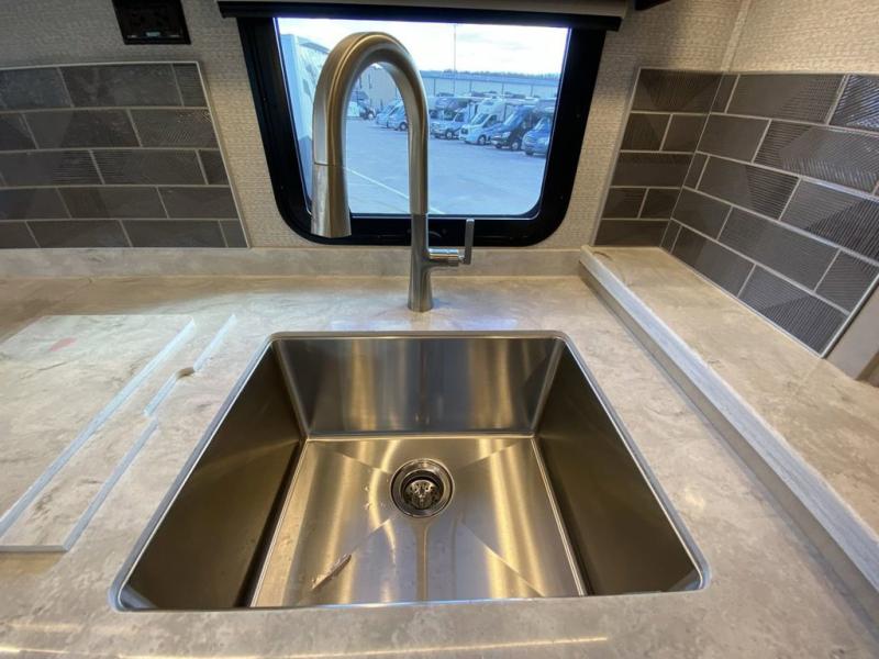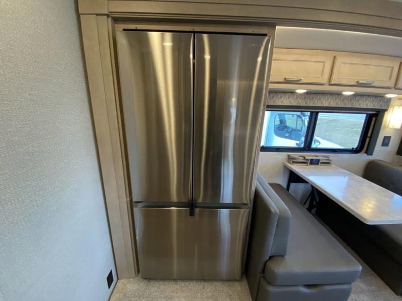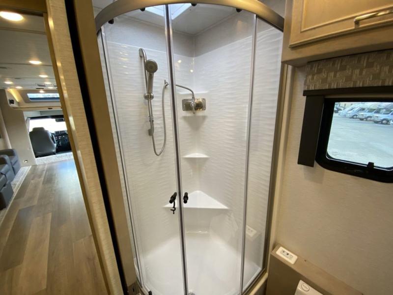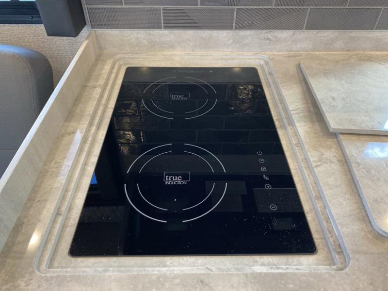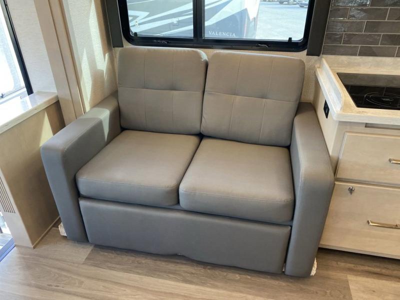 You will feel right at home in this motorhome! With a separated bathroom, one person can freshen up in the radius shower while another uses the sink or maybe put a load of laundry in the optional washer and dryer. There are plenty of places to sleep between the 66" x 74" mini-king bed in the rear private bedroom, the convertible booth dinette, and the sofa sleeper. You can prepare your best home cooked meals with the two burner induction cooktop in the fully equipped kitchen. Crank up the tunes with the Samsung soundbar with Bluetooth, wireless subwoofer, and JBL speakers. The Garmin infotainment with RV maps will ensure you stay on track!