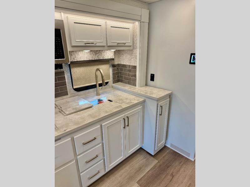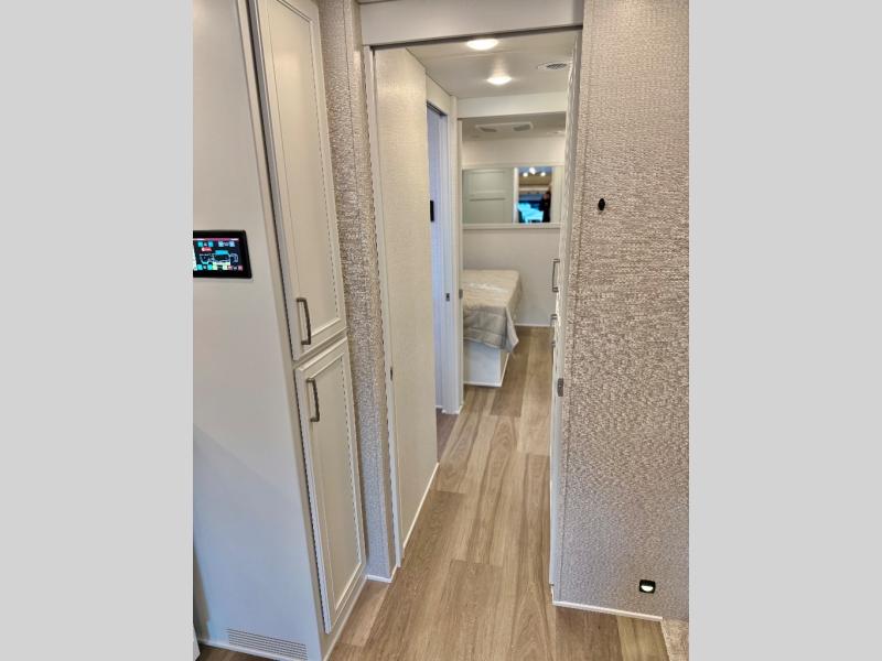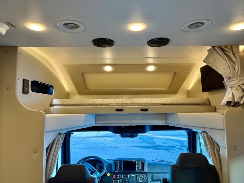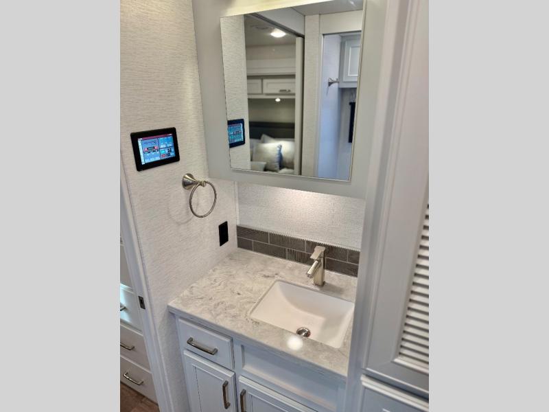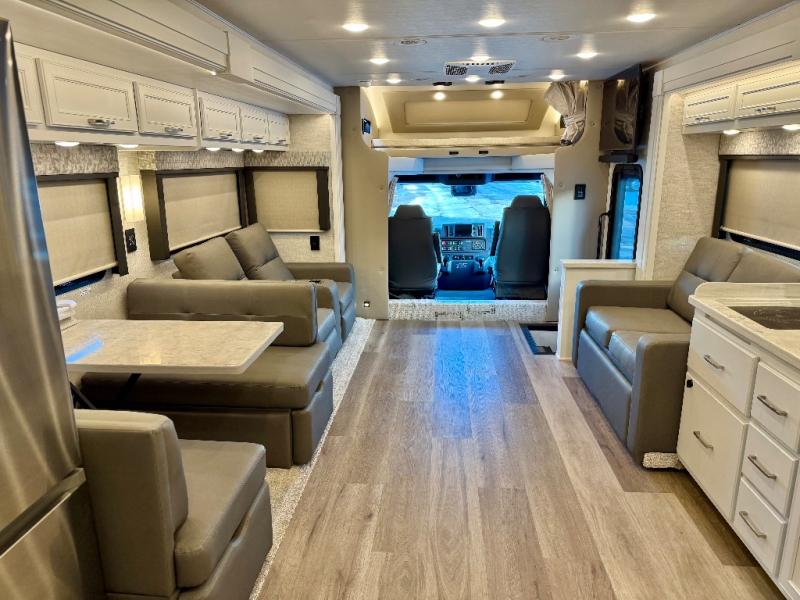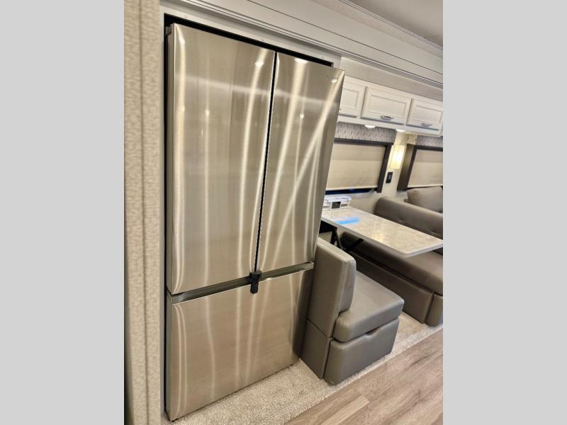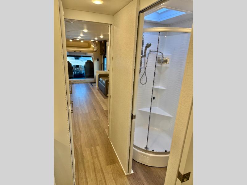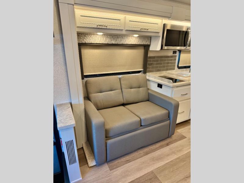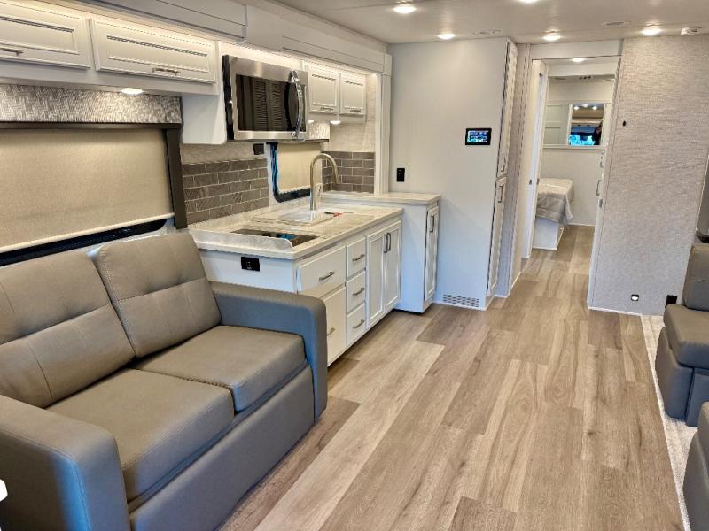 You will feel right at home in this motorhome! With a separated bathroom, one person can freshen up in the radius shower while another uses the sink or maybe put a load of laundry in the optional washer and dryer. There are plenty of places to sleep between the 66" x 74" mini-king bed in the rear private bedroom, the convertible booth dinette, and the sofa sleeper. You can prepare your best home cooked meals with the two burner induction cooktop in the fully equipped kitchen. Crank up the tunes with the Samsung soundbar with Bluetooth, wireless subwoofer, and JBL speakers. The Garmin infotainment with RV maps will ensure you stay on track!