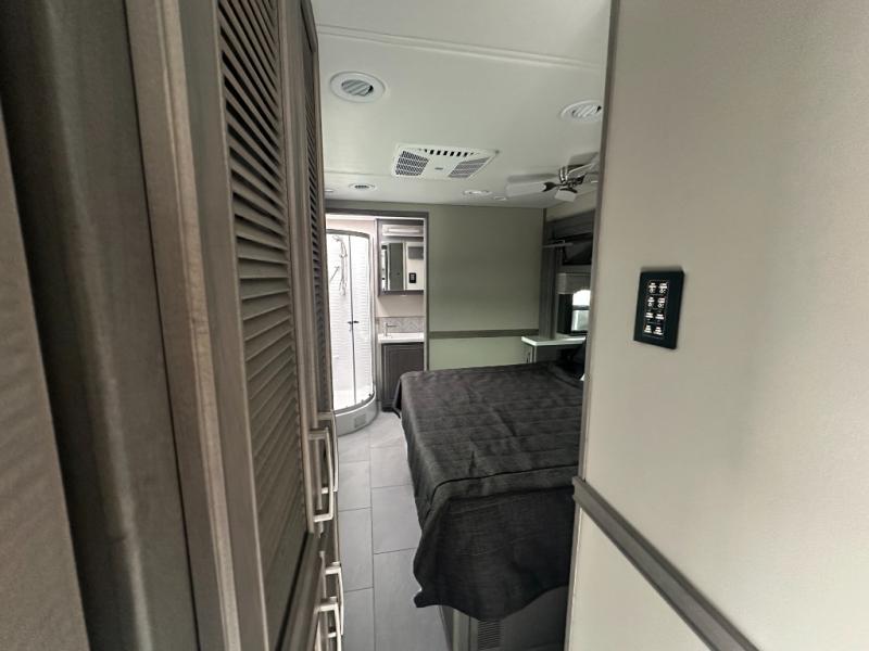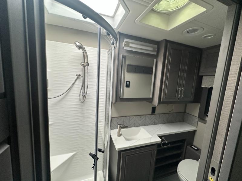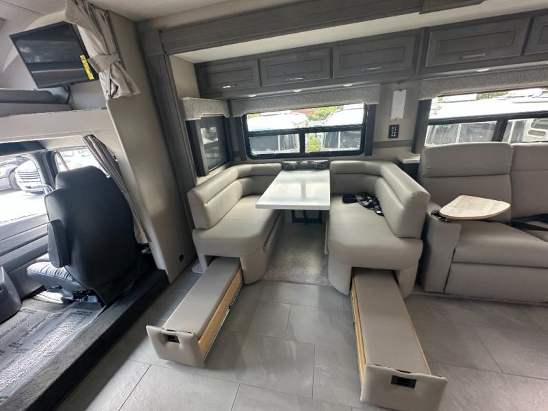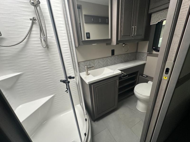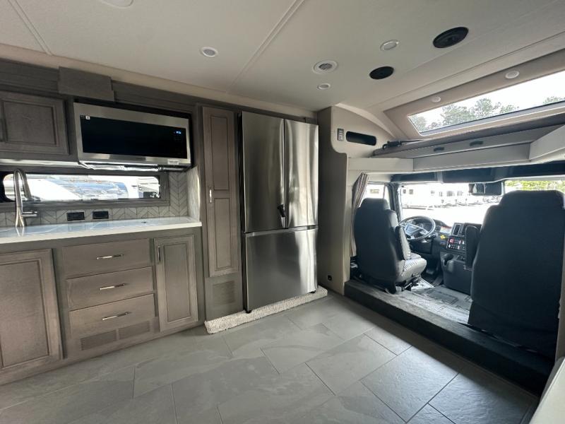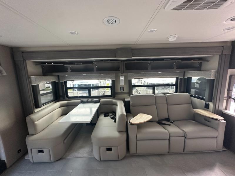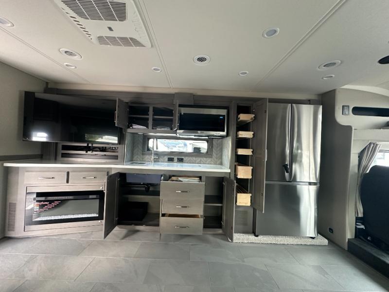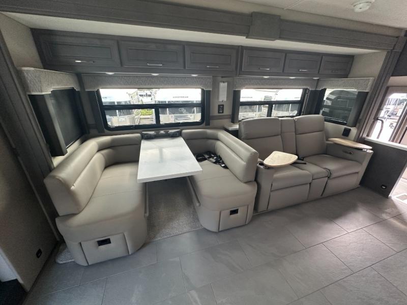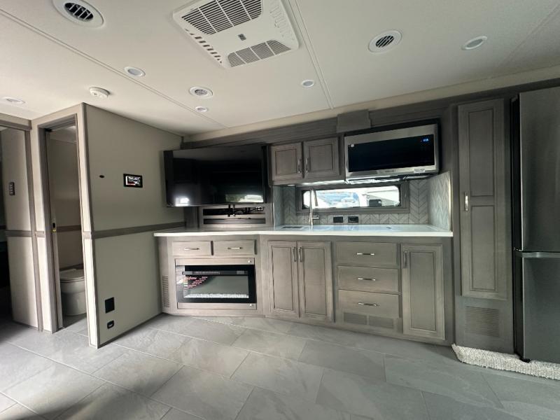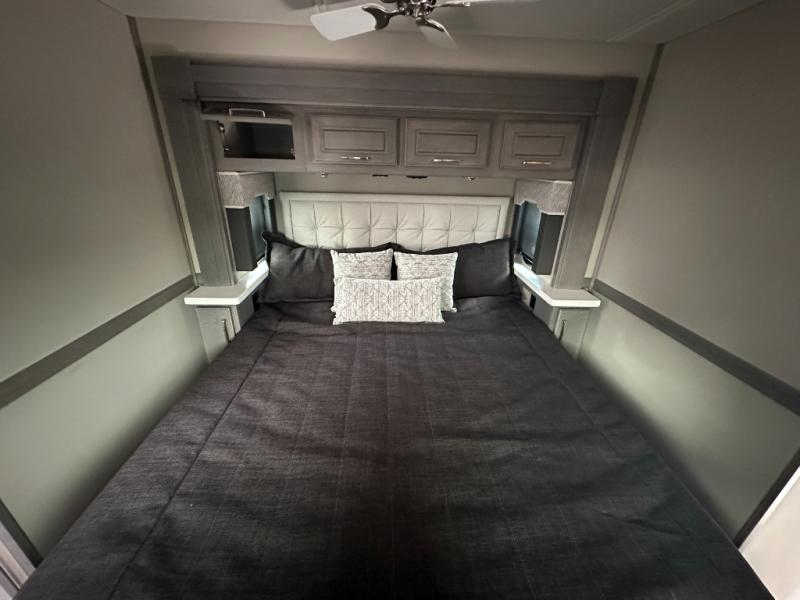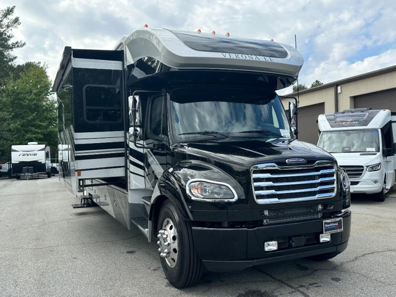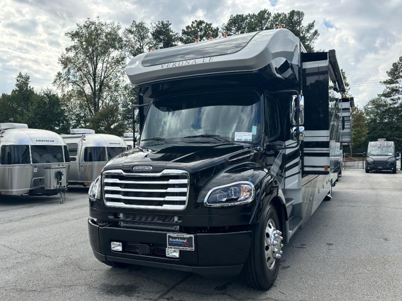 \With any Verona LE Super C diesel motorhome by Renegade, you will be wowed by all the luxury features. The 2" vacuum laminated sidewalls feature welded aluminum framing for added support, and the 1.5" high density foam insulation in the sidewalls and roof means you can travel all year long in any season. The captain will love how easy it will be to drive with the Allison 3200TRV electronic 6-speed transmission, plus there are rear and side view cameras for easy parking and an upgraded cab sound system to keep the tunes going. Each model includes dual 15,000 BTU roof A/C pumps, an Aqua-Hot 450D hydronic water and zone heating system, plus MaxxAir power vents to keep you comfortable all year long. All of your power needs will be met with an 8kW Onan Quiet diesel generator, 3,000w True Sine wave inverter, (2) 330Ah AGM house batteries, and (3) 200W solar panels. Inside, there are three modern decor options to choose from, along with solid surface countertops, grouted tile backsplash, Maple hardwood cabinetry, and many more comforts of home!