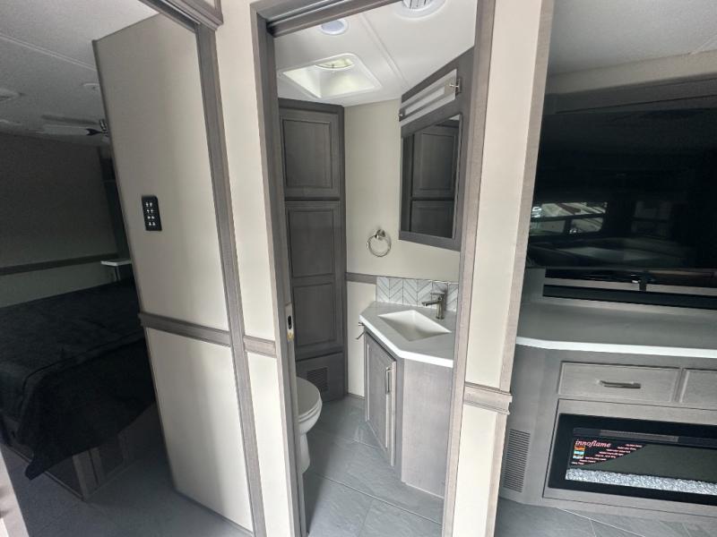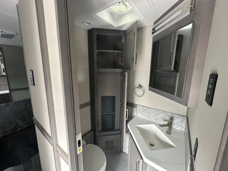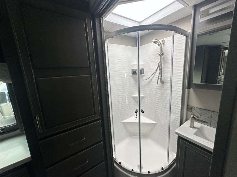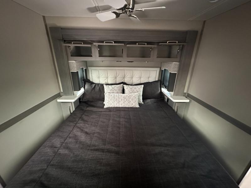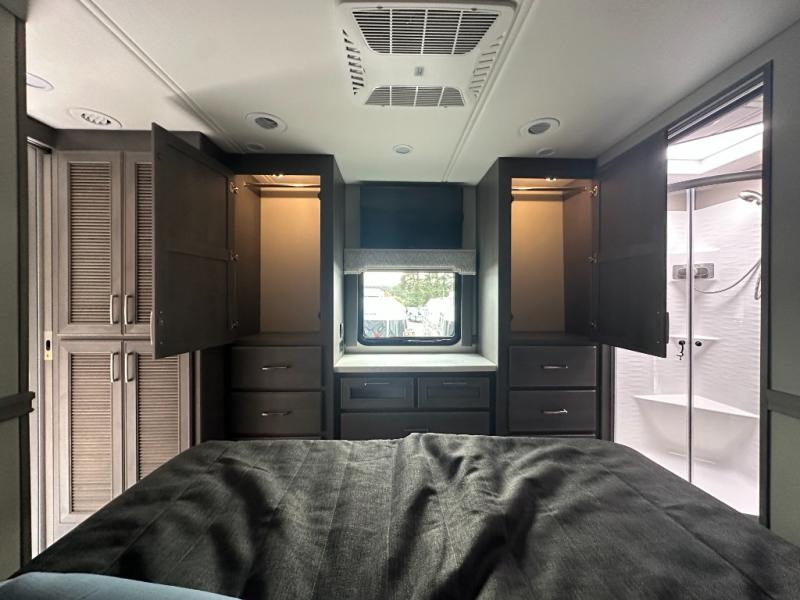 You and your spouse can dream about your next adventure while sleeping on your own memory foam mattress in the master suite with a full bathroom including a radius shower and linen storage. If you have overnight guests, they can sleep on the sofa sleeper plus the dinette once converted for bedtime. And the mid-coach half bath will be all theirs. The chef-inspired kitchen offers a convection microwave, a recessed two burner induction cooktop and a French door residential refrigerator, plus more! You can entertain inside while watching the 50" 4K Smart LED TV or outside under the electric awning while enjoying the exterior 43" 4K LED TV with USB charging. There are so many more luxury and tech features to enjoy, plus a few options to add if you wish. Take a look at the list.