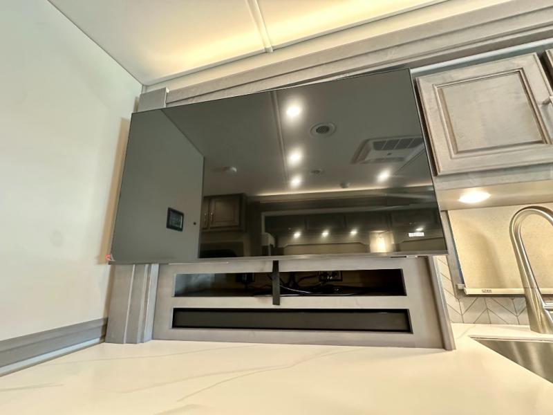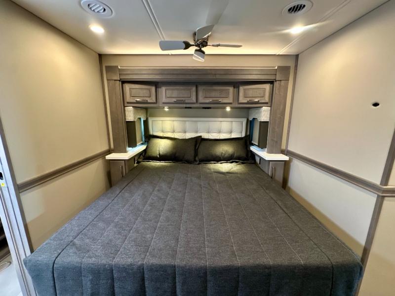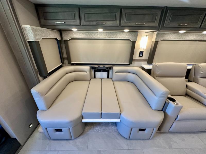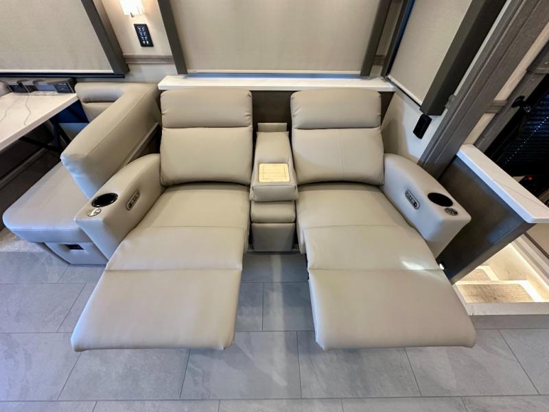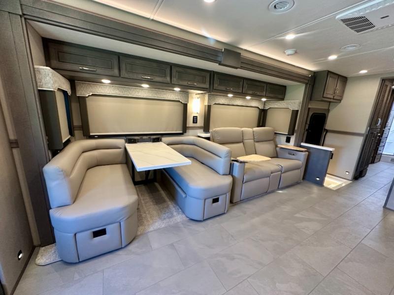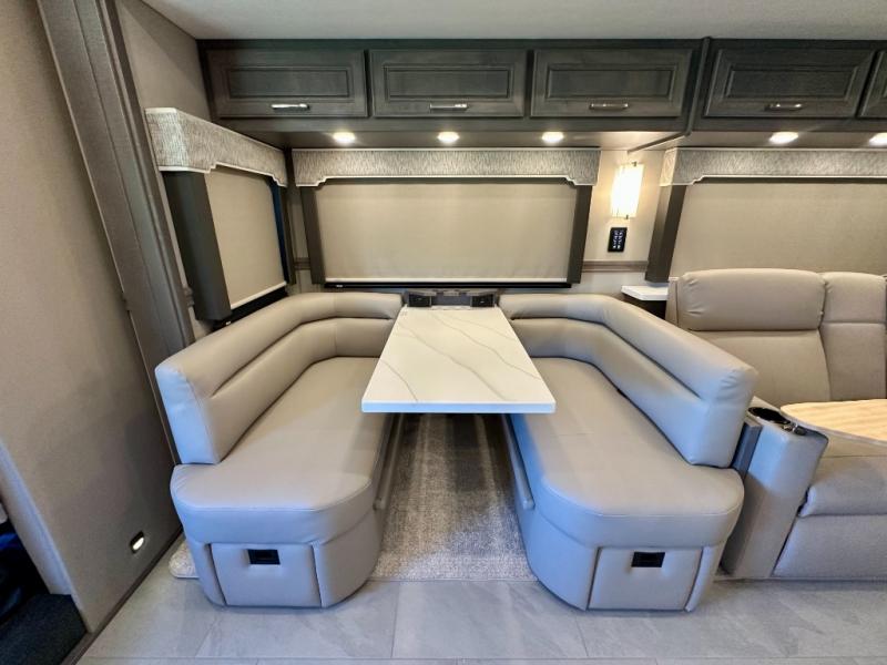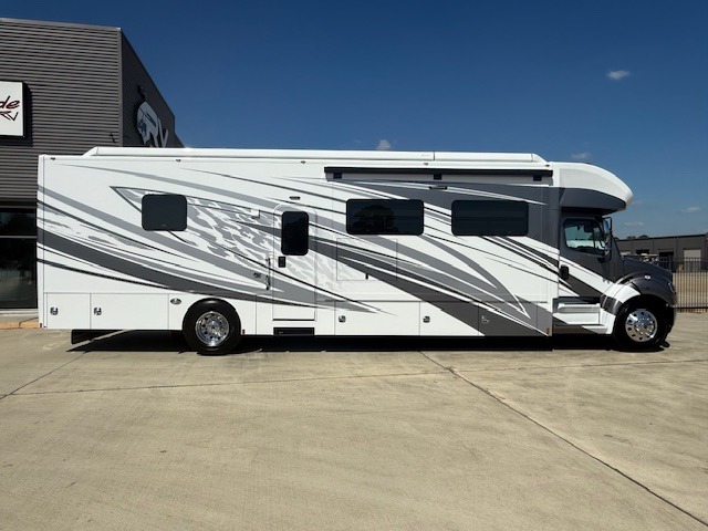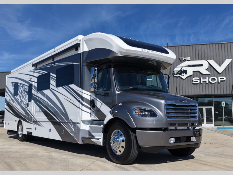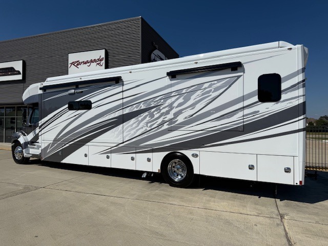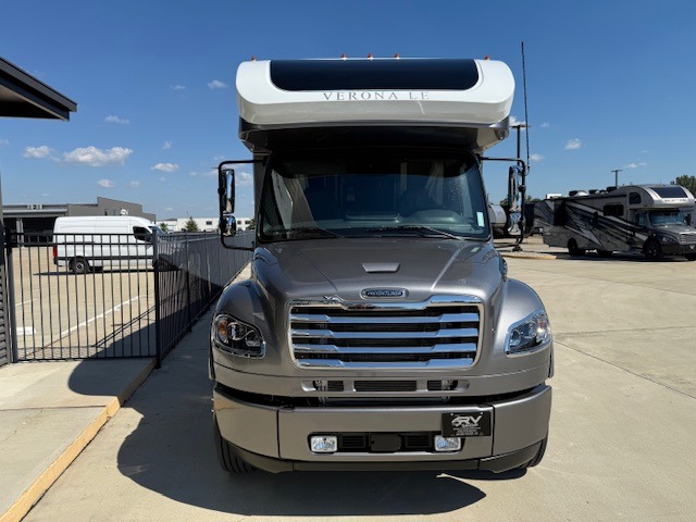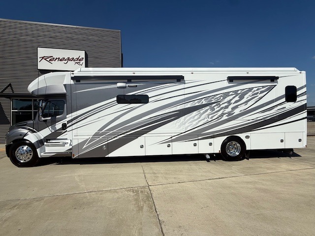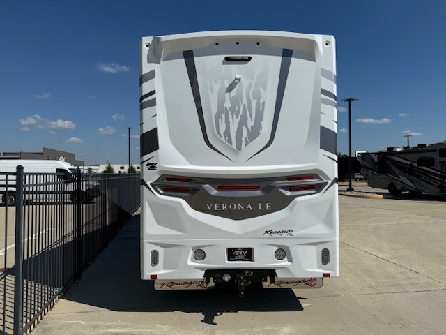 \With any Verona LE Super C diesel motorhome by Renegade, you will be wowed by all the luxury features. The 2" vacuum laminated sidewalls feature welded aluminum framing for added support, and the 1.5" high density foam insulation in the sidewalls and roof means you can travel all year long in any season. The captain will love how easy it will be to drive with the Allison 3200TRV electronic 6-speed transmission, plus there are rear and side view cameras for easy parking and an upgraded cab sound system to keep the tunes going. Each model includes dual 15,000 BTU roof A/C pumps, an Aqua-Hot 450D hydronic water and zone heating system, plus MaxxAir power vents to keep you comfortable all year long. All of your power needs will be met with an 8kW Onan Quiet diesel generator, 3,000w True Sine wave inverter, (2) 330Ah AGM house batteries, and (3) 200W solar panels. Inside, there are three modern decor options to choose from, along with solid surface countertops, grouted tile backsplash, Maple hardwood cabinetry, and many more comforts of home!