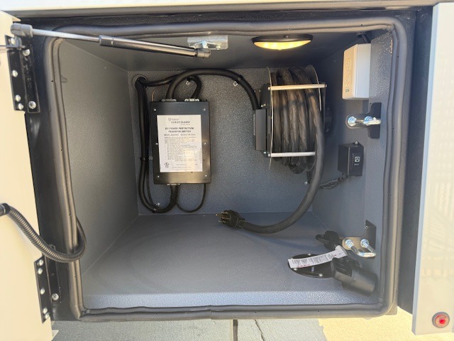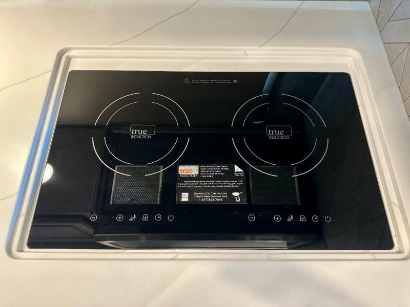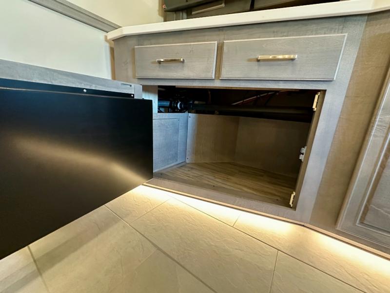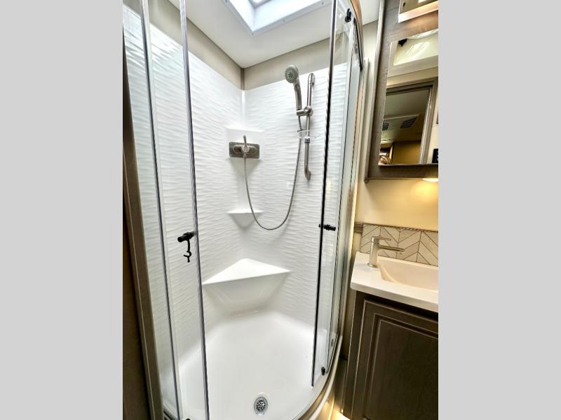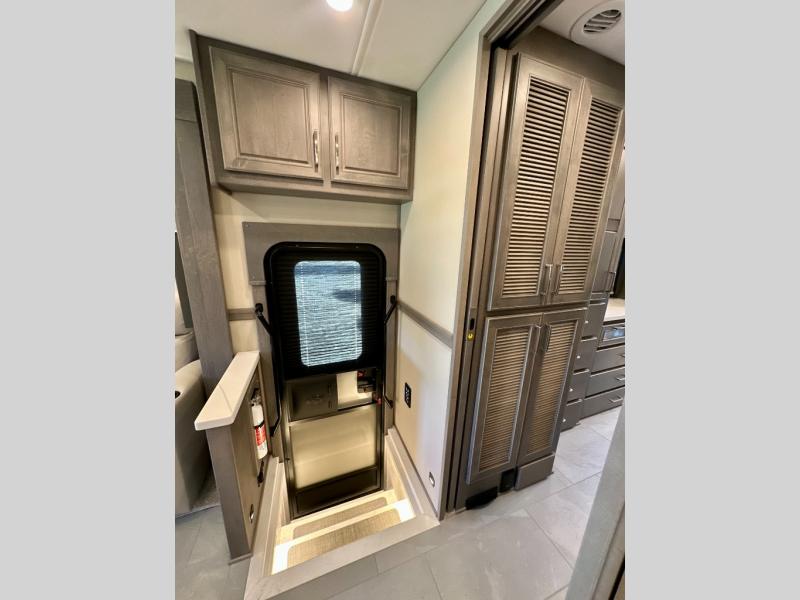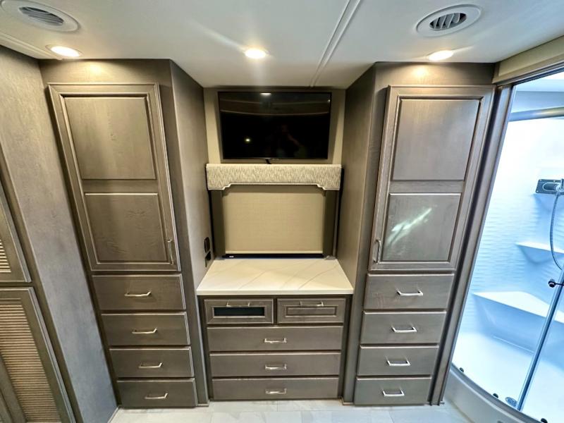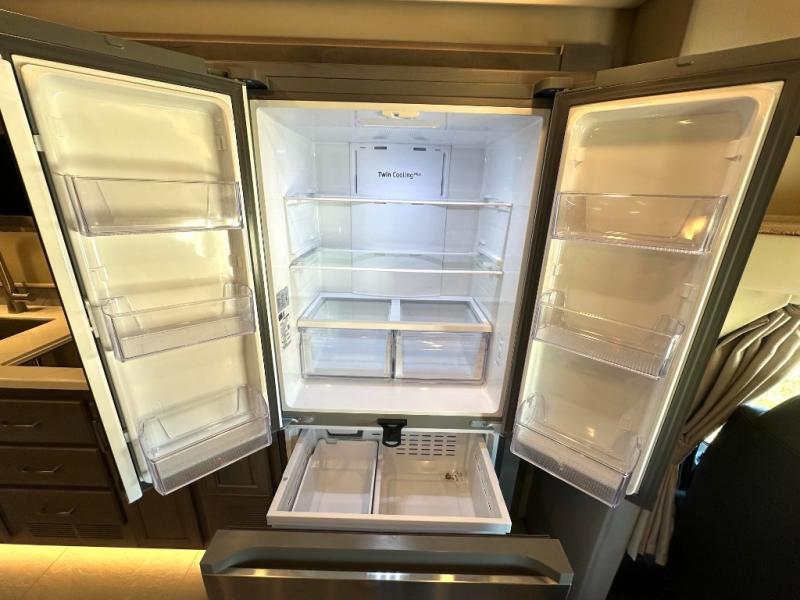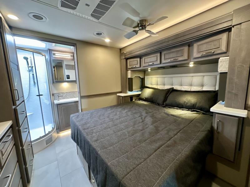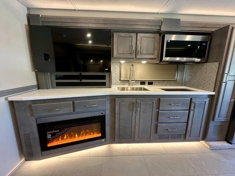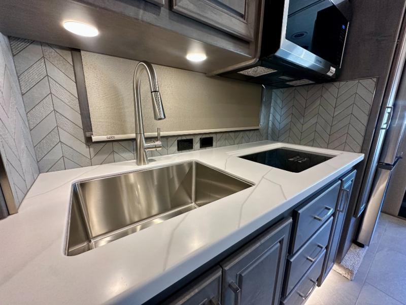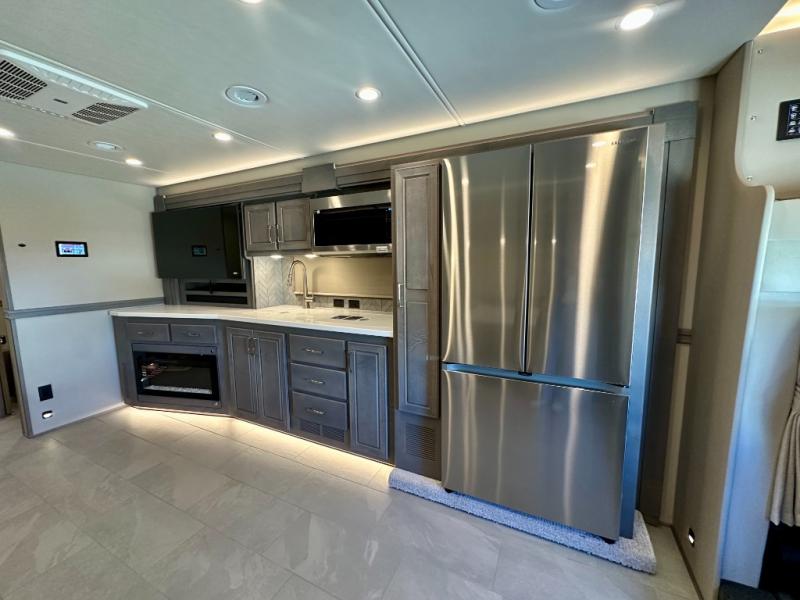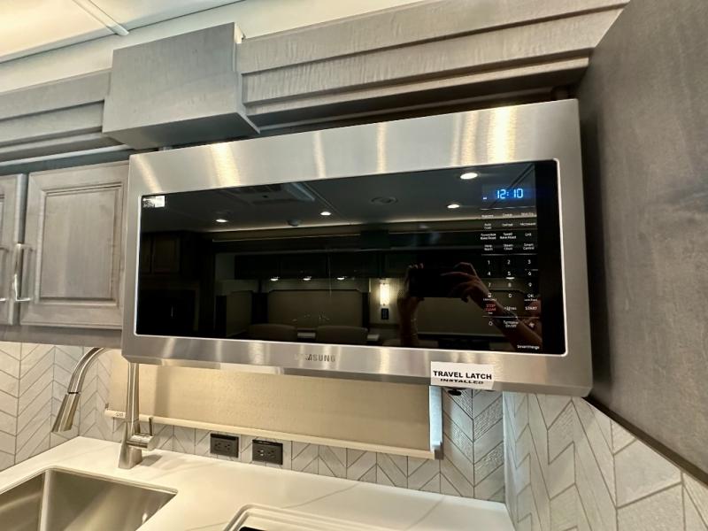 You and your spouse can dream about your next adventure while sleeping on your own memory foam mattress in the master suite with a full bathroom including a radius shower and linen storage. If you have overnight guests, they can sleep on the sofa sleeper plus the dinette once converted for bedtime. And the mid-coach half bath will be all theirs. The chef-inspired kitchen offers a convection microwave, a recessed two burner induction cooktop and a French door residential refrigerator, plus more! You can entertain inside while watching the 50" 4K Smart LED TV or outside under the electric awning while enjoying the exterior 43" 4K LED TV with USB charging. There are so many more luxury and tech features to enjoy, plus a few options to add if you wish. Take a look at the list.