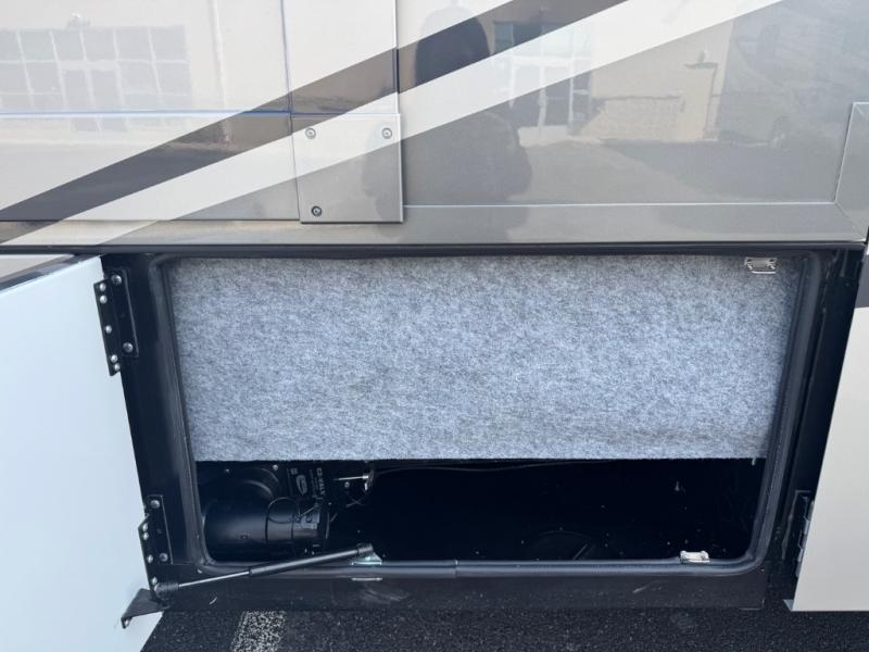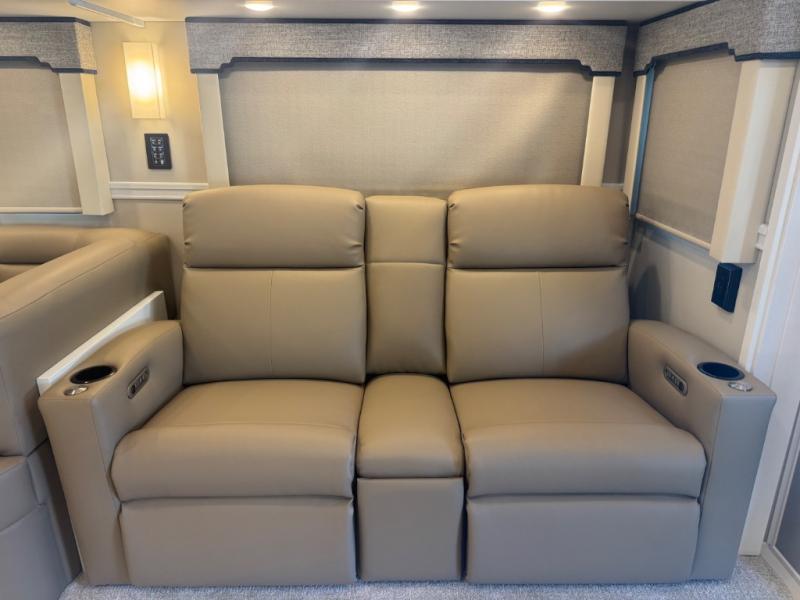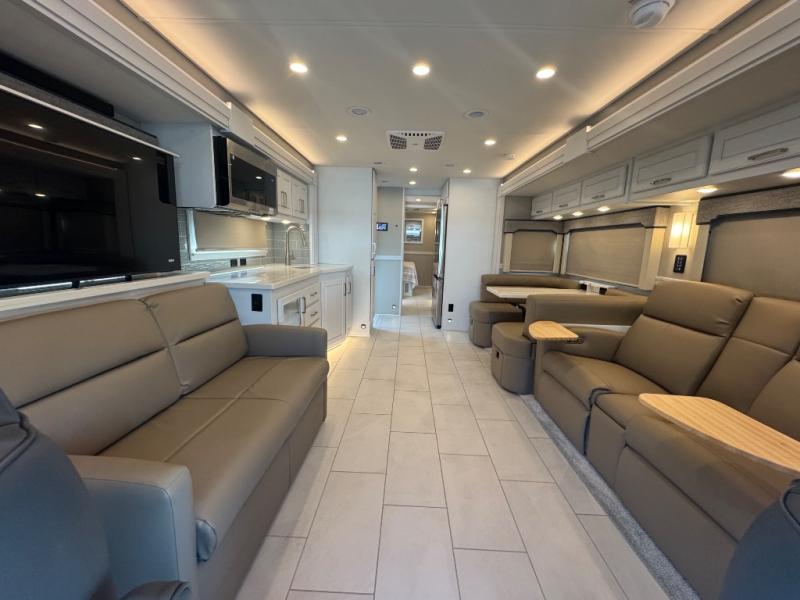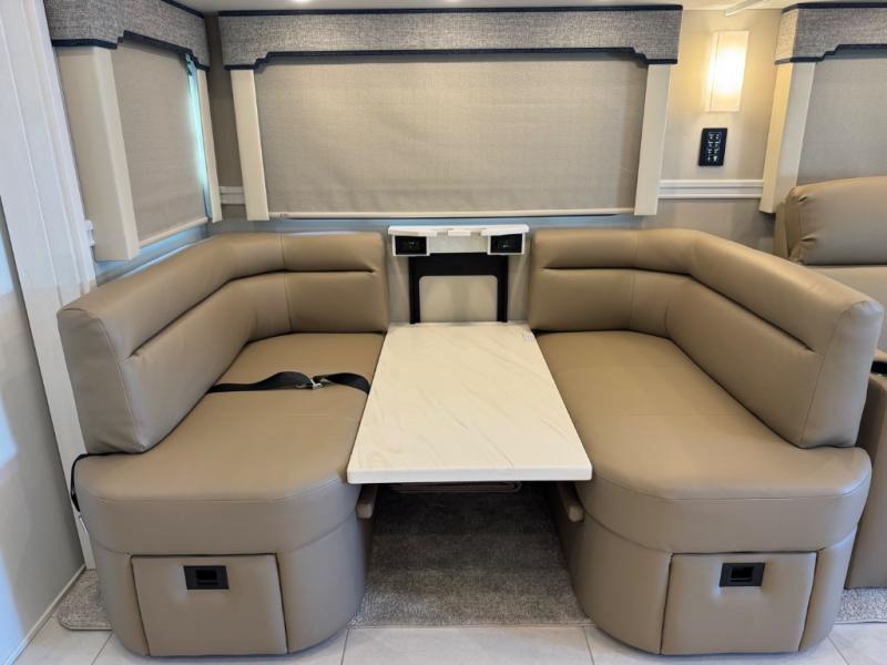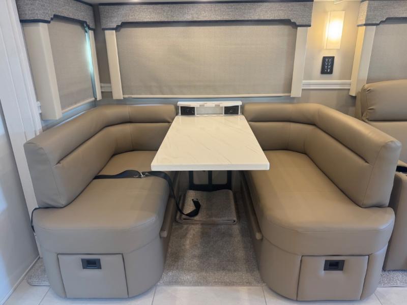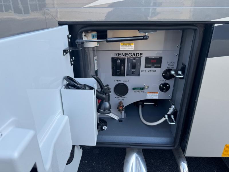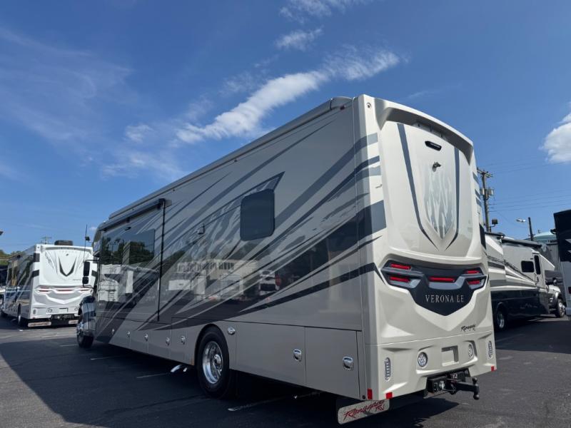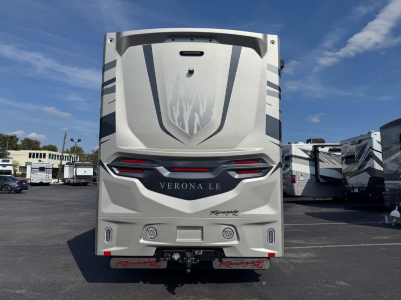With any Verona LE Super C diesel motorhome by Renegade, you will be wowed by all the luxury features. The 2" vacuum laminated sidewalls feature welded aluminum framing for added support, and the 1.5" high density foam insulation in the sidewalls and roof means you can travel all year long in any season. The captain will love how easy it will be to drive with the Allison 3200TRV electronic 6-speed transmission, plus there are rear and side view cameras for easy parking and an upgraded cab sound system to keep the tunes going. Each model includes dual 15,000 BTU roof A/C pumps, an Aqua-Hot 450D hydronic water and zone heating system, plus MaxxAir power vents to keep you comfortable all year long. All of your power needs will be met with an 8kW Onan Quiet diesel generator, 3,000w True Sine wave inverter, (2) 330Ah AGM house batteries, and (3) 200W solar panels. Inside, there are three modern decor options to choose from, along with solid surface countertops, grouted tile backsplash, Maple hardwood cabinetry, and many more comforts of home!