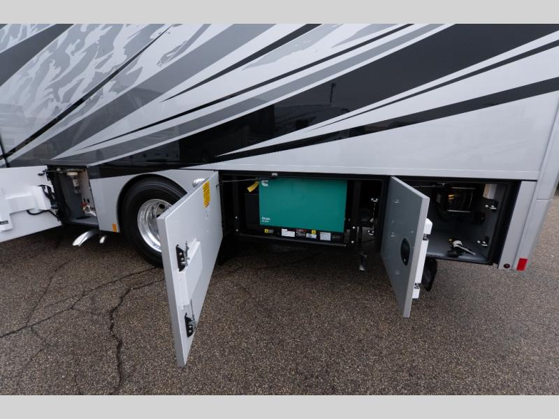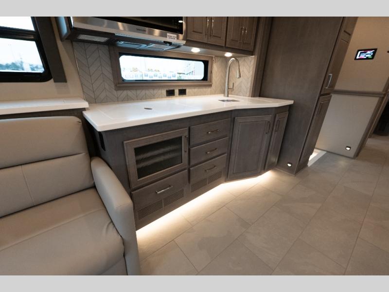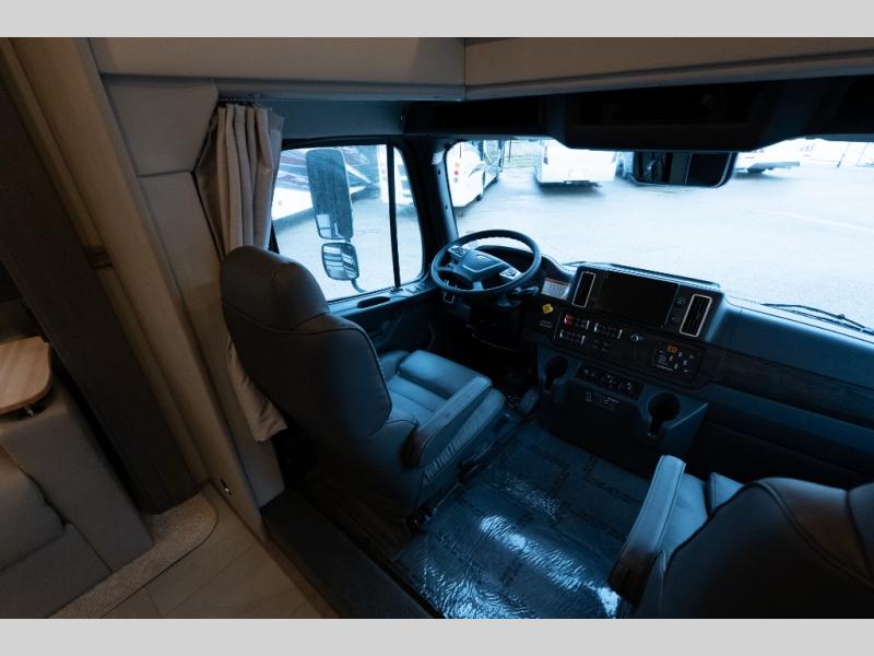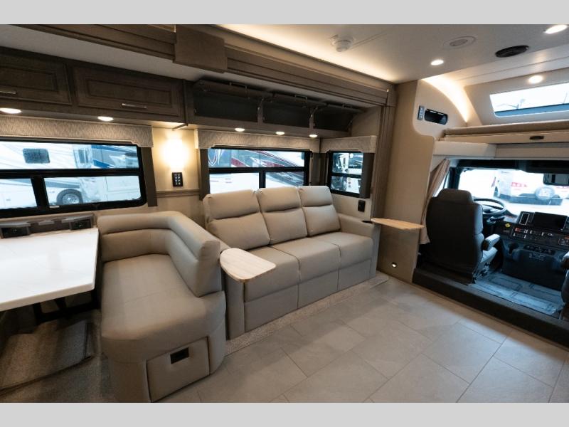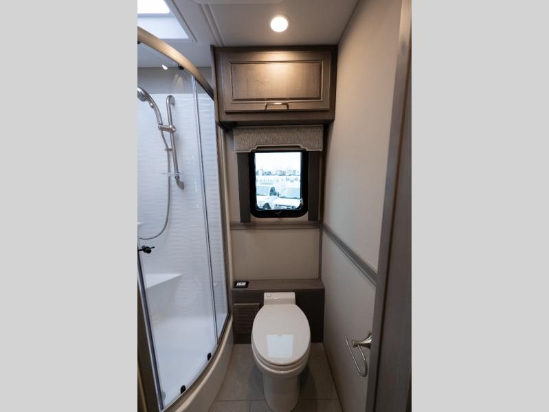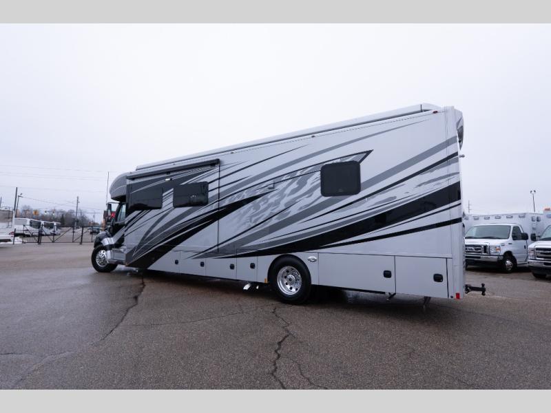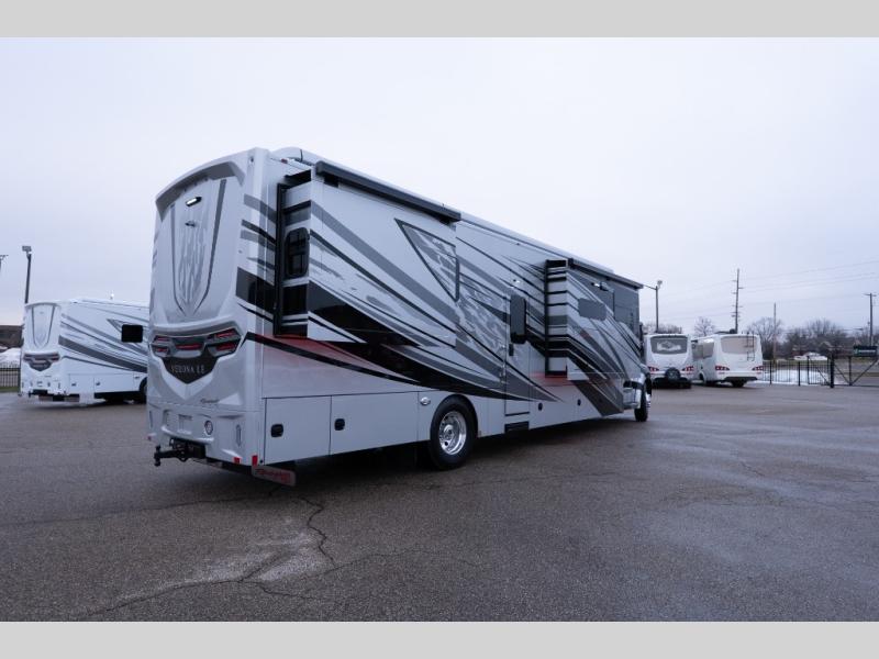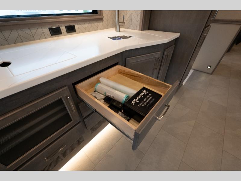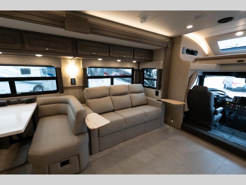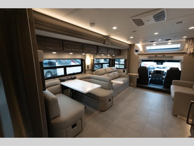 With any Verona LE Super C diesel motorhome by Renegade, you will be wowed by all the luxury features. The 2" vacuum laminated sidewalls feature welded aluminum framing for added support, and the 1.5" high density foam insulation in the sidewalls and roof means you can travel all year long in any season. The captain will love how easy it will be to drive with the Allison 3200TRV electronic 6-speed transmission, plus there are rear and side view cameras for easy parking and an upgraded cab sound system to keep the tunes going. Each model includes dual 15,000 BTU roof A/C pumps, an Aqua-Hot 450D hydronic water and zone heating system, plus MaxxAir power vents to keep you comfortable all year long. All of your power needs will be met with an 8kW Onan Quiet diesel generator, 3,000w True Sine wave inverter, (2) 330Ah AGM house batteries, and (3) 200W solar panels. Inside, there are three modern decor options to choose from, along with solid surface countertops, grouted tile backsplash, Maple hardwood cabinetry, and many more comforts of home!
