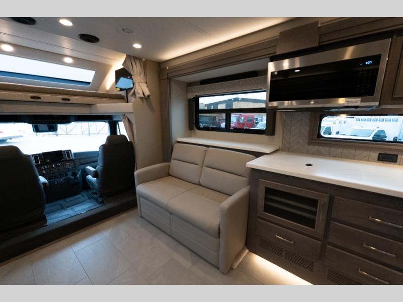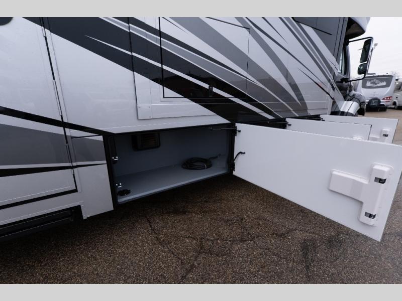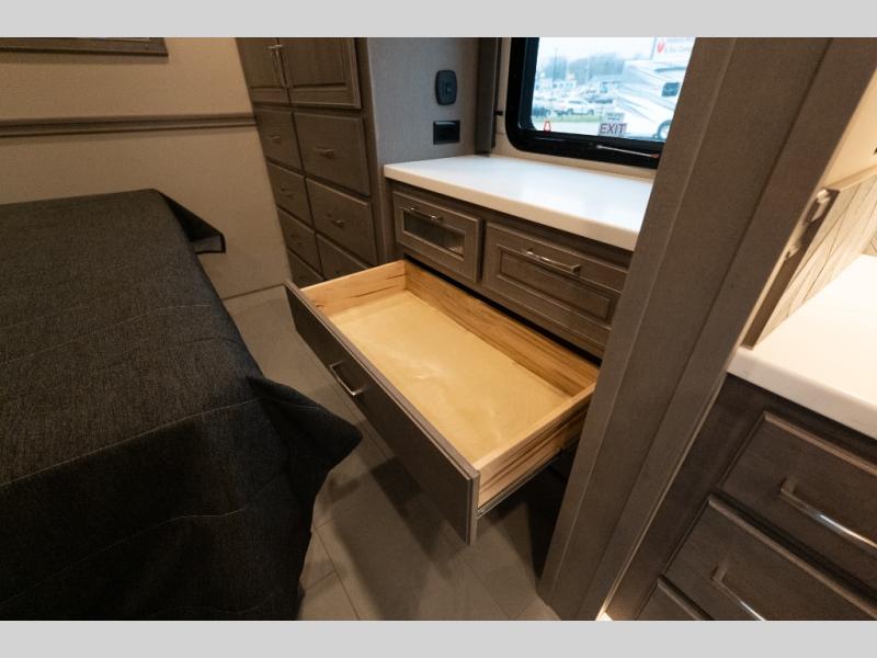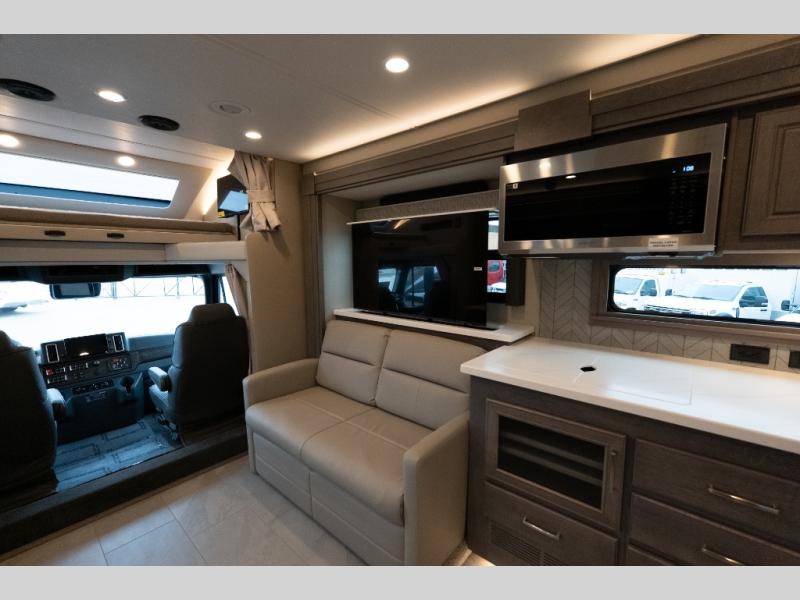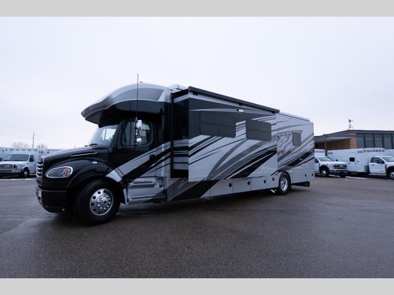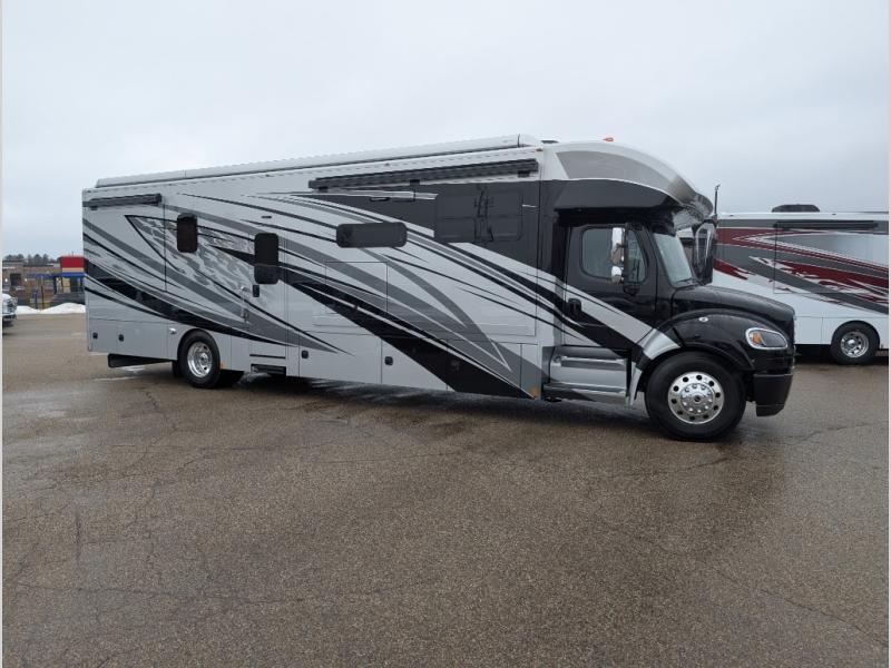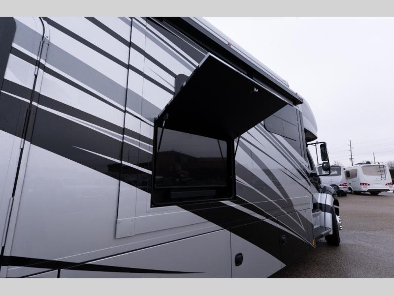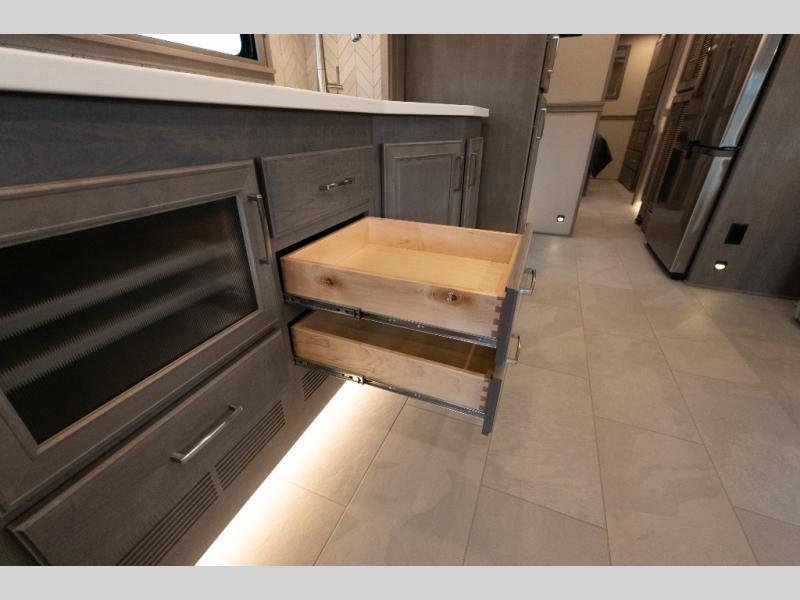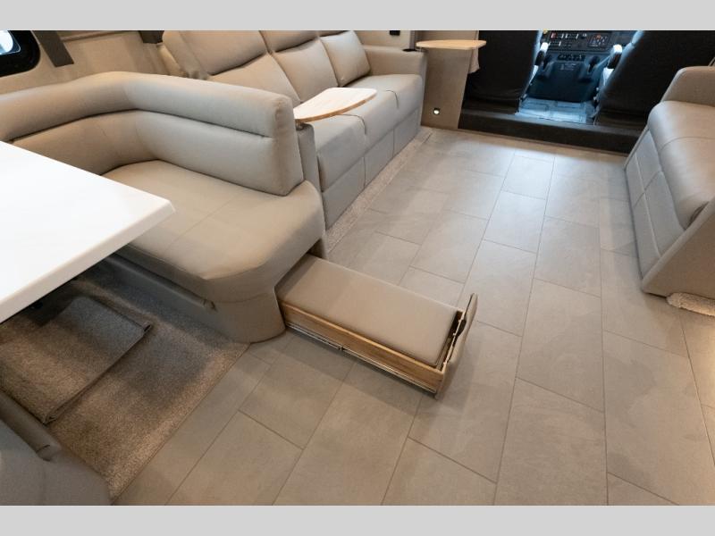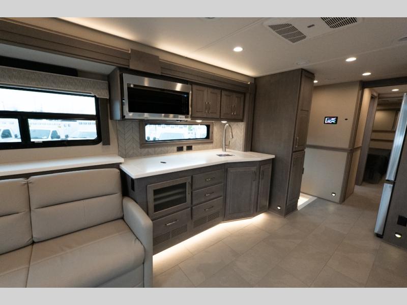 With any Verona LE Super C diesel motorhome by Renegade, you will be wowed by all the luxury features. The 2" vacuum laminated sidewalls feature welded aluminum framing for added support, and the 1.5" high density foam insulation in the sidewalls and roof means you can travel all year long in any season. The captain will love how easy it will be to drive with the Allison 3200TRV electronic 6-speed transmission, plus there are rear and side view cameras for easy parking and an upgraded cab sound system to keep the tunes going. Each model includes dual 15,000 BTU roof A/C pumps, an Aqua-Hot 450D hydronic water and zone heating system, plus MaxxAir power vents to keep you comfortable all year long. All of your power needs will be met with an 8kW Onan Quiet diesel generator, 3,000w True Sine wave inverter, (2) 330Ah AGM house batteries, and (3) 200W solar panels. Inside, there are three modern decor options to choose from, along with solid surface countertops, grouted tile backsplash, Maple hardwood cabinetry, and many more comforts of home!