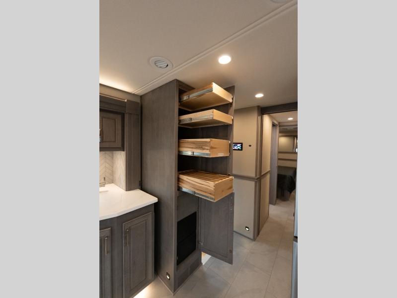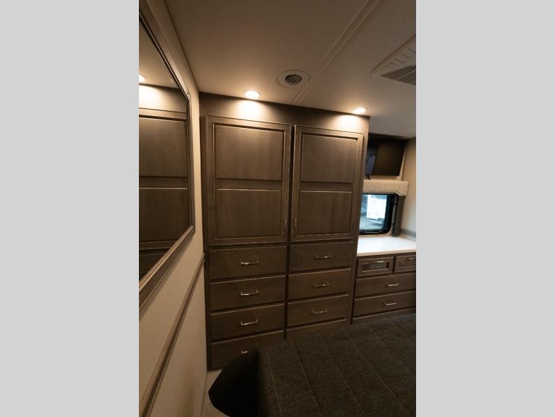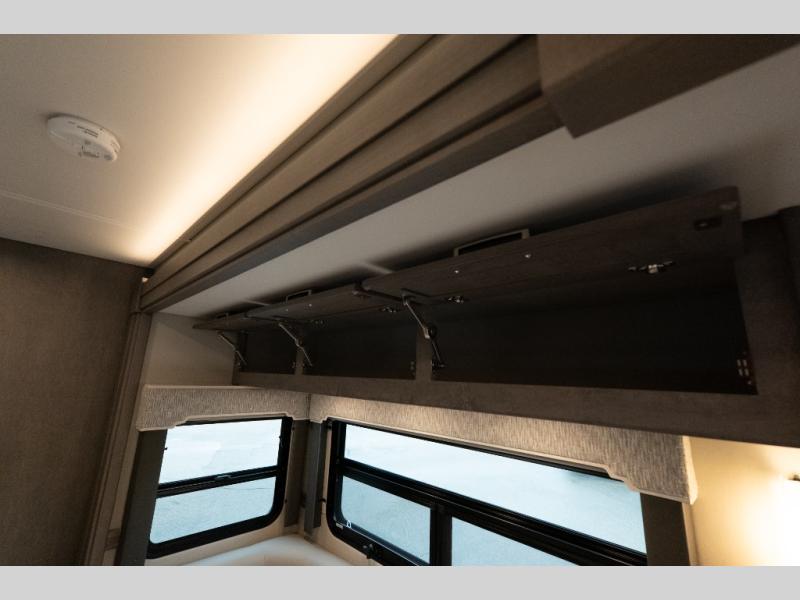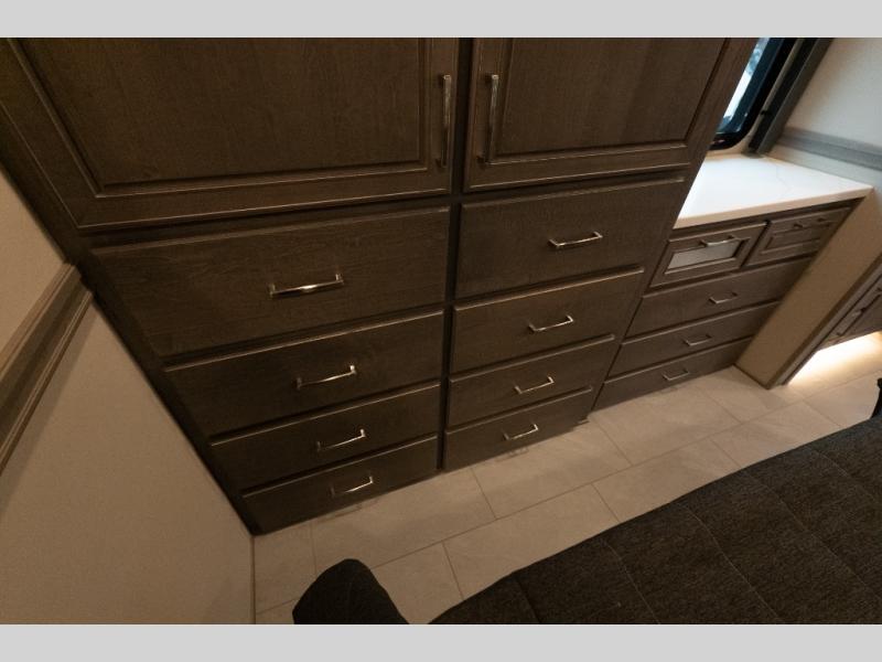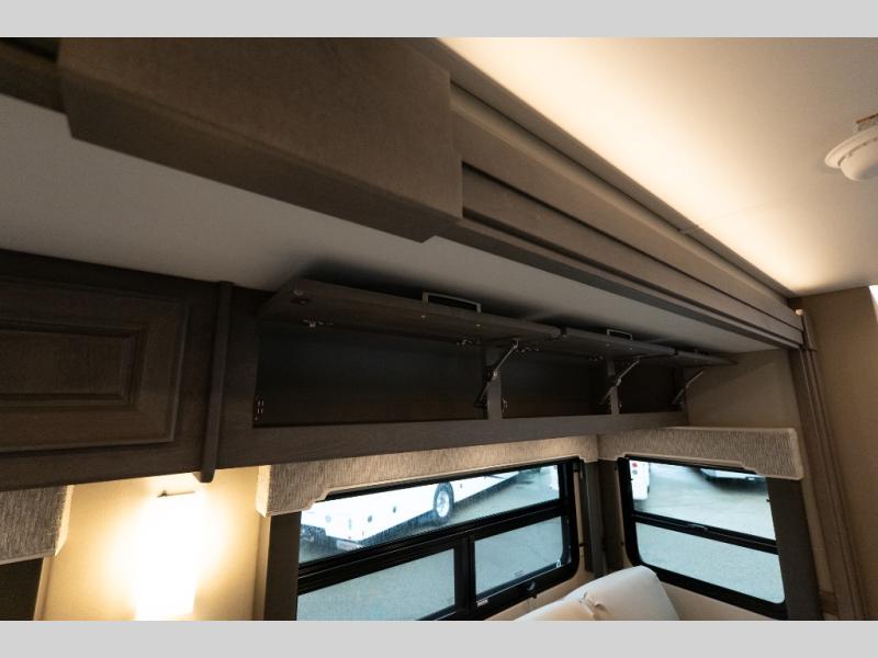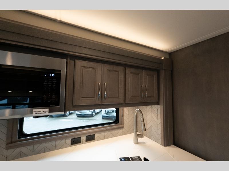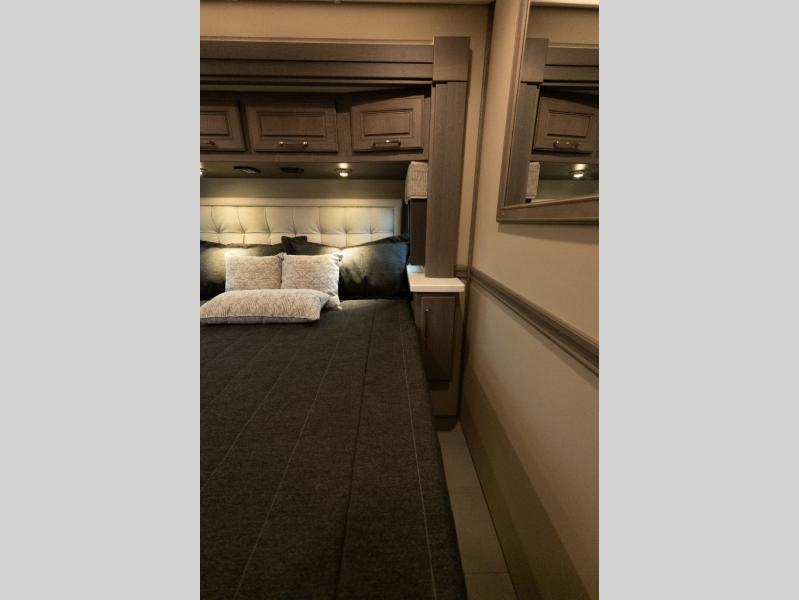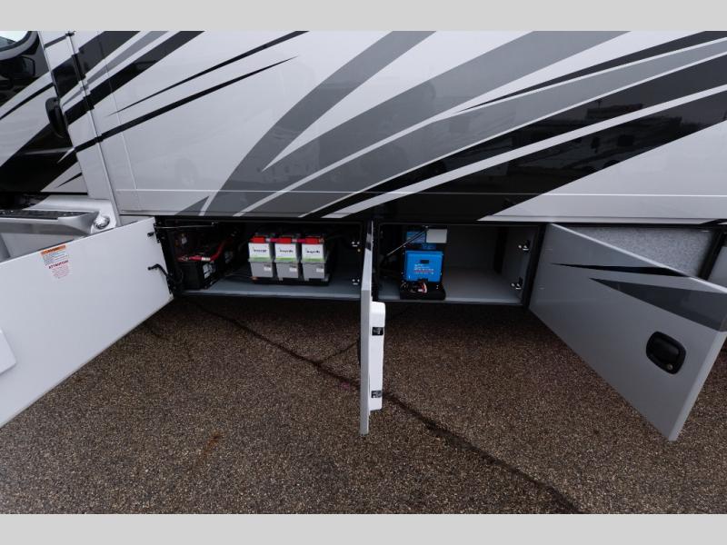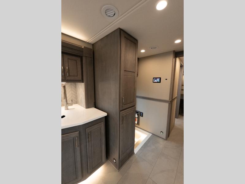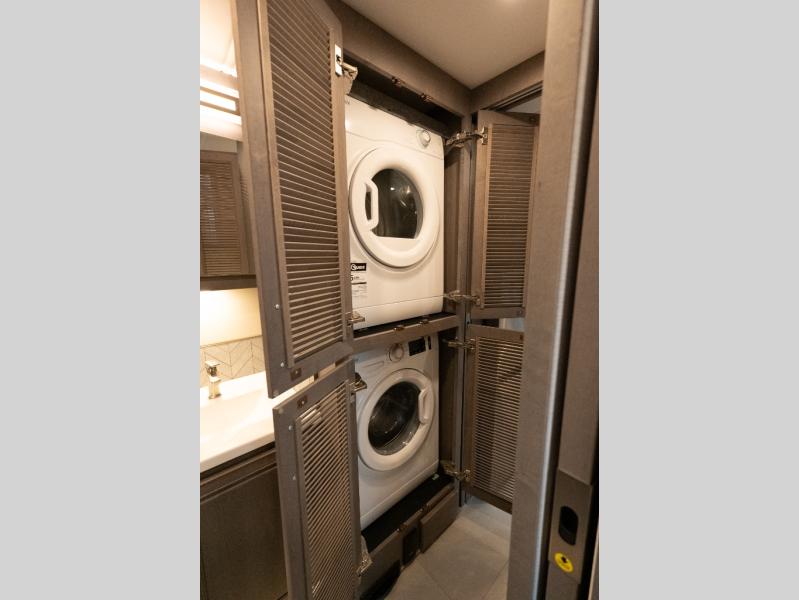 Verona Cabover Bunk, underbody LED lighting, LED lights under slide-outs, 3 exterior scene lights, spray in cargo bay lining, heated floor, carpet runner, washer & dryer stacked, additional lithium battery and second 3000w inverter, additional solar panel, and pre-wired for satellite.